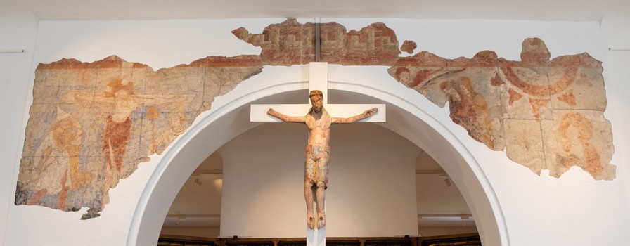 Krucifix fra første halvdel af 1300-tallet. Der har hverken været kongekrone eller tornekrone. Benene er korslagte. Korset har kraftige knopper, og korsenderne har firkantede plader med evangelistsymboler.