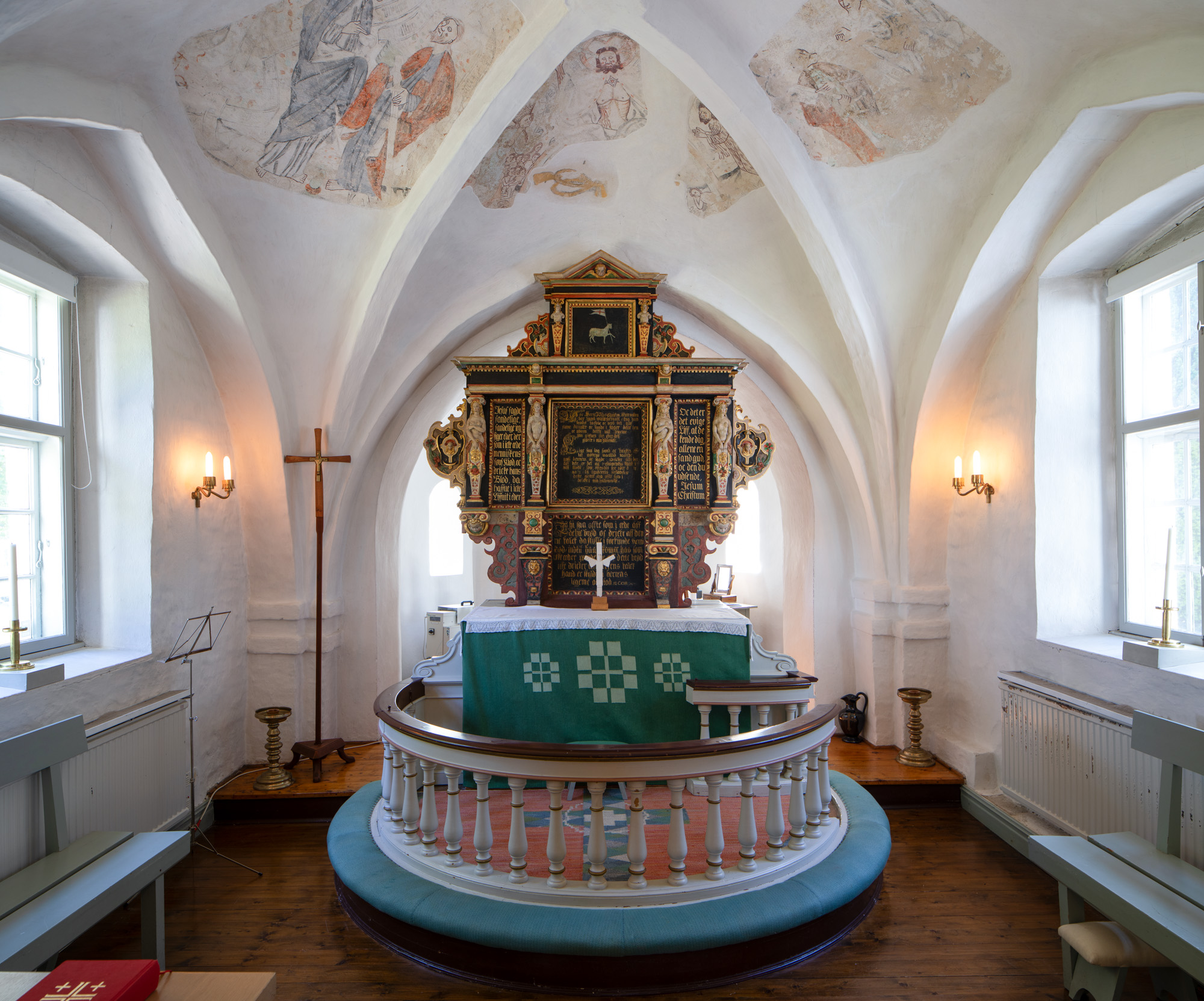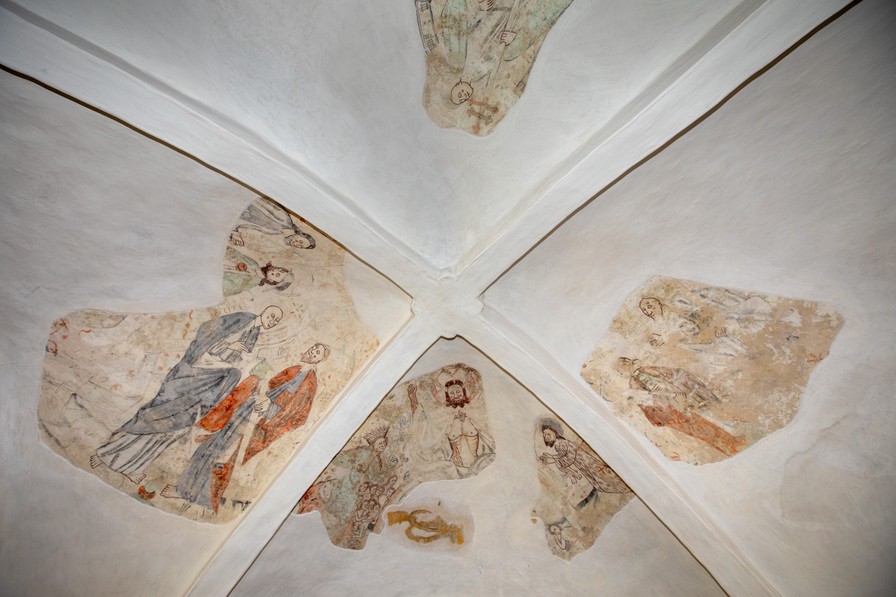 I korets krydshvælv findes en Verdensdommen i østkappen og i de tre andre kapper en apostelrække med et langt skriftbånd. Teksten er temmelig utydelig, men der er formodentlig tale om trosbekendelsen.