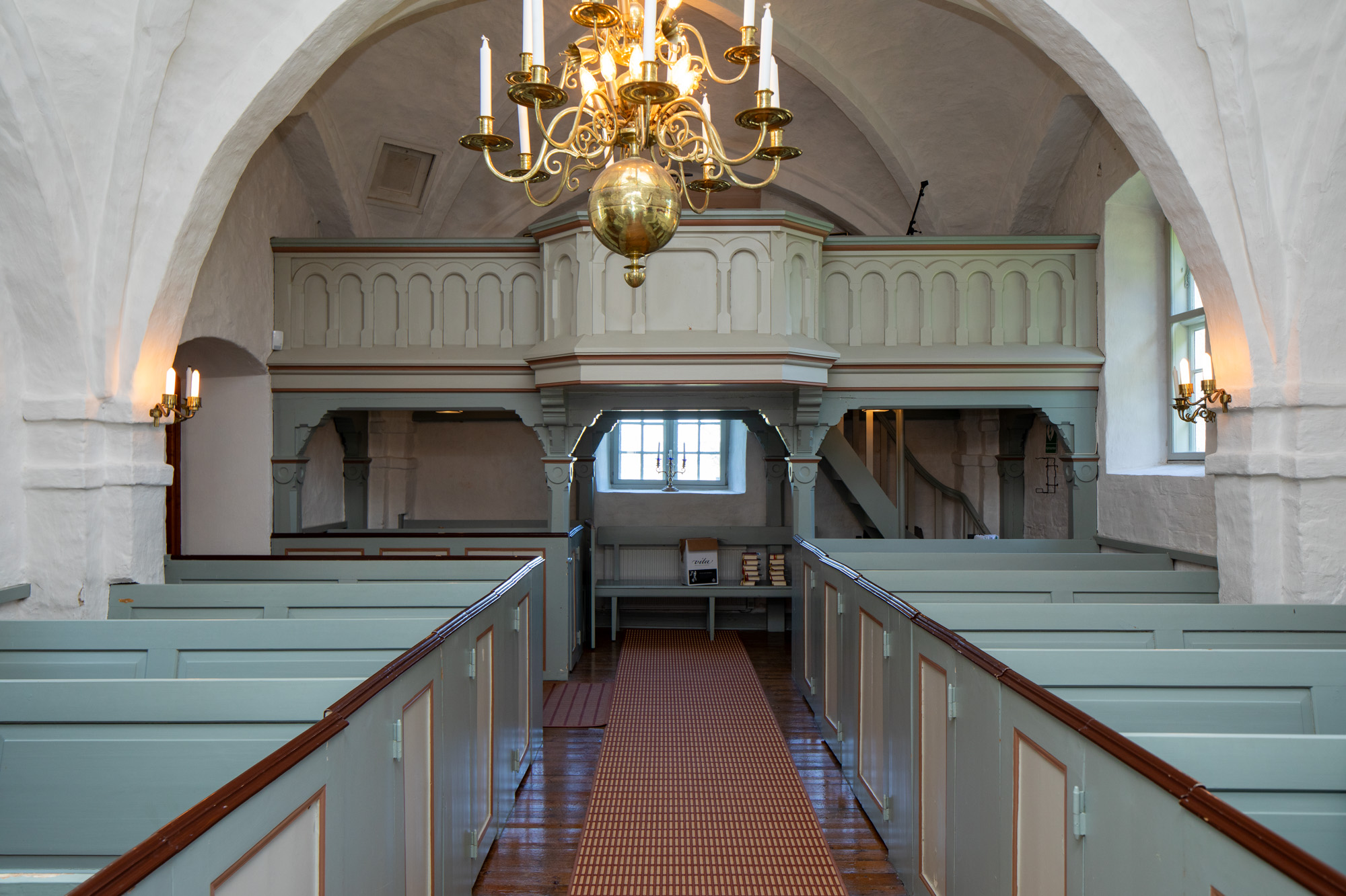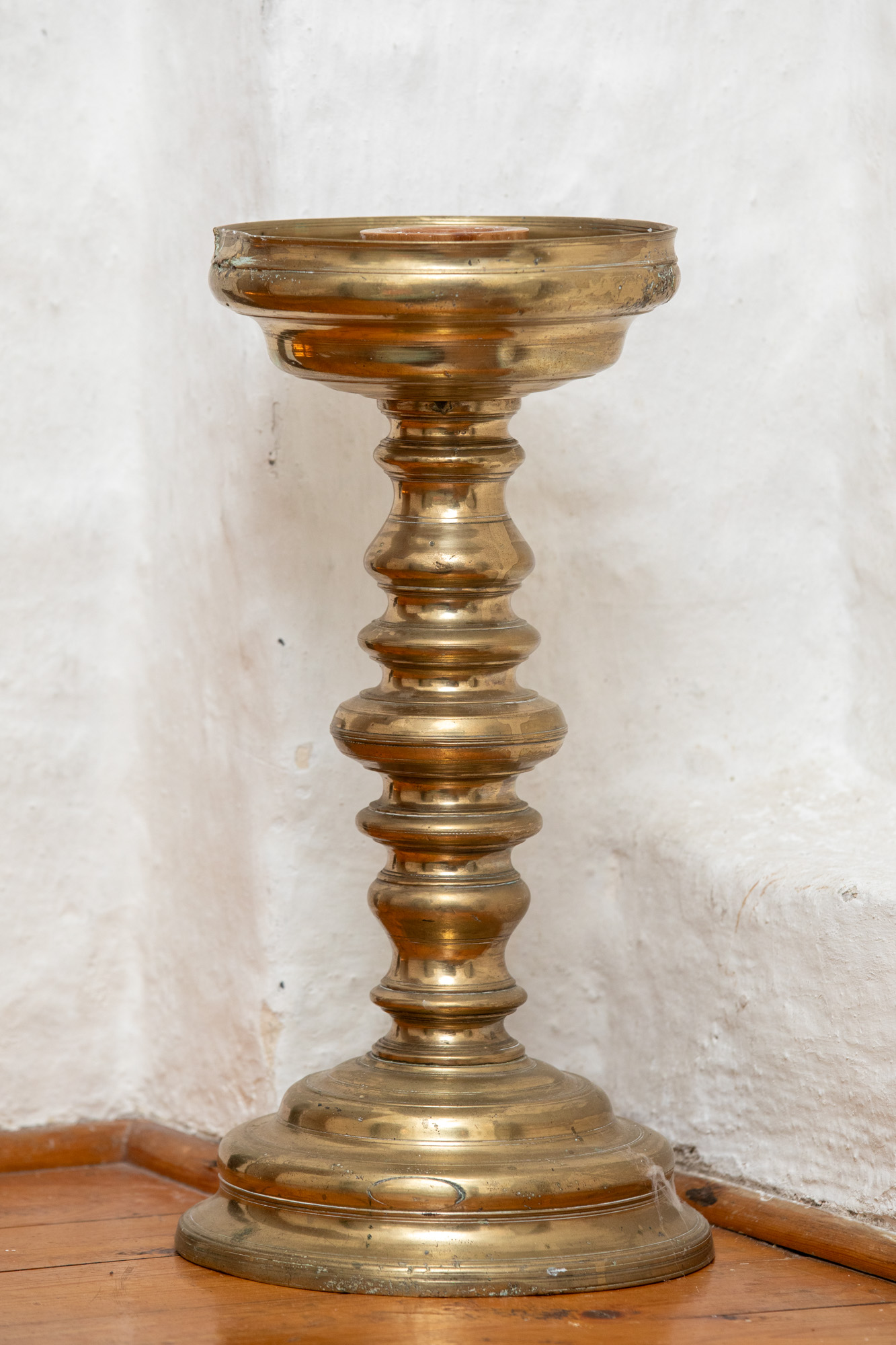 Kirken har to store alterstager, som har fået plads nede på gulvet.
