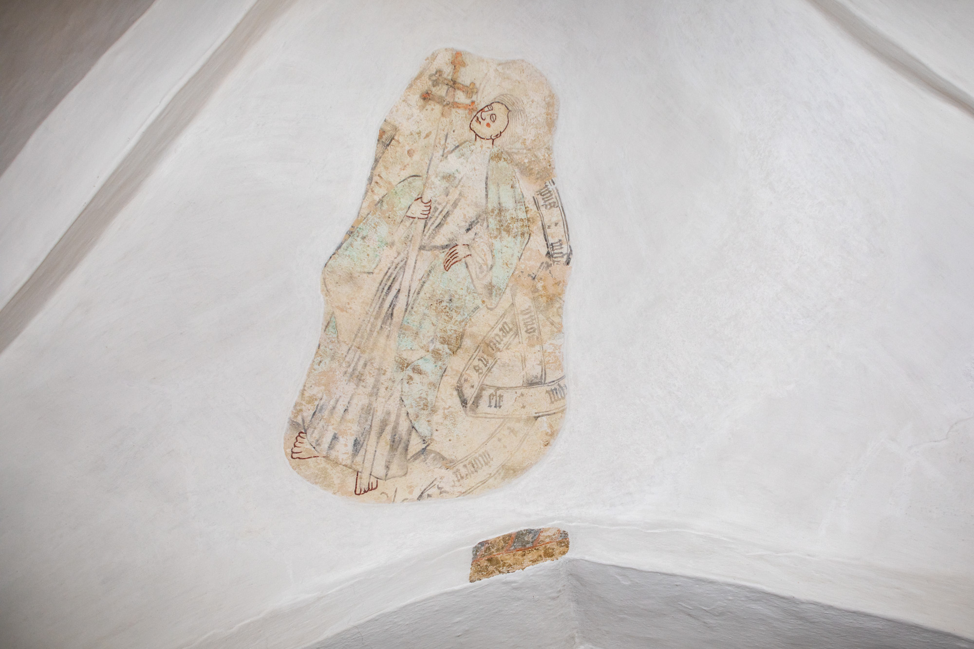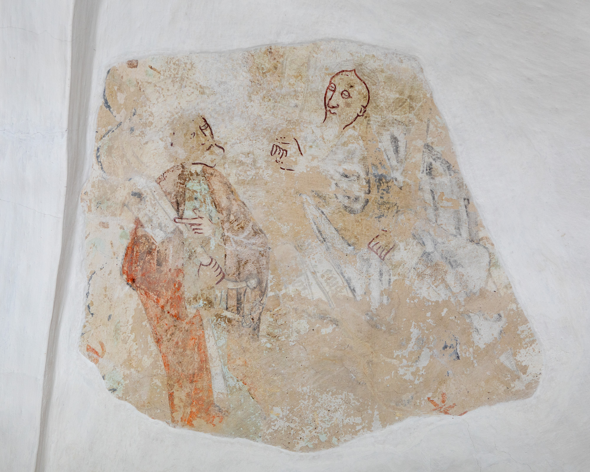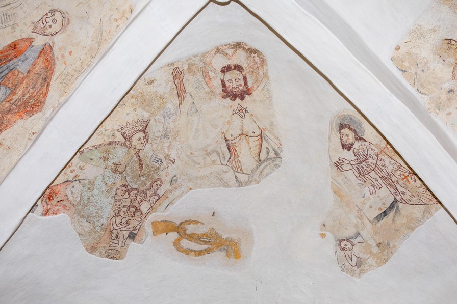 På triumfvæggen findes to større fragmenter af kalkmalerier.