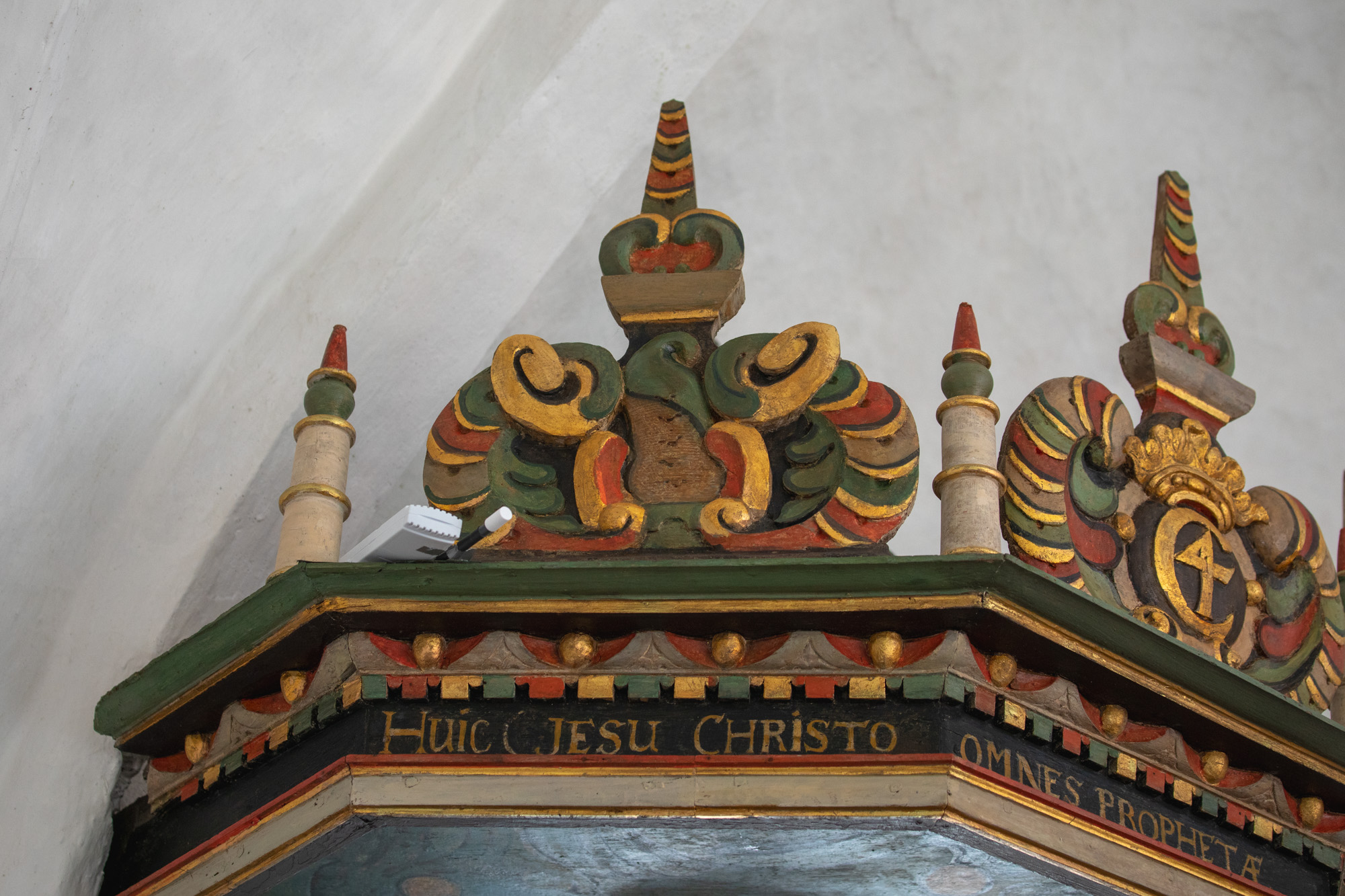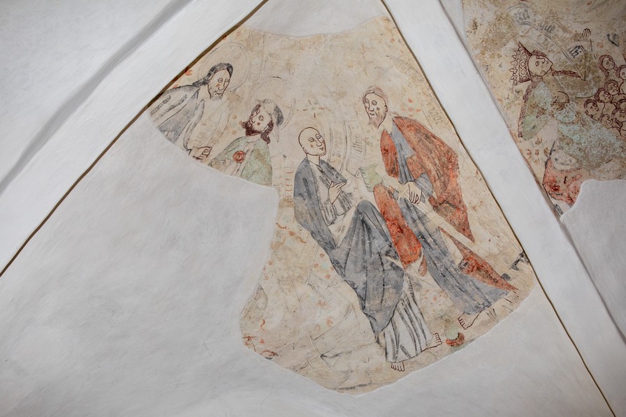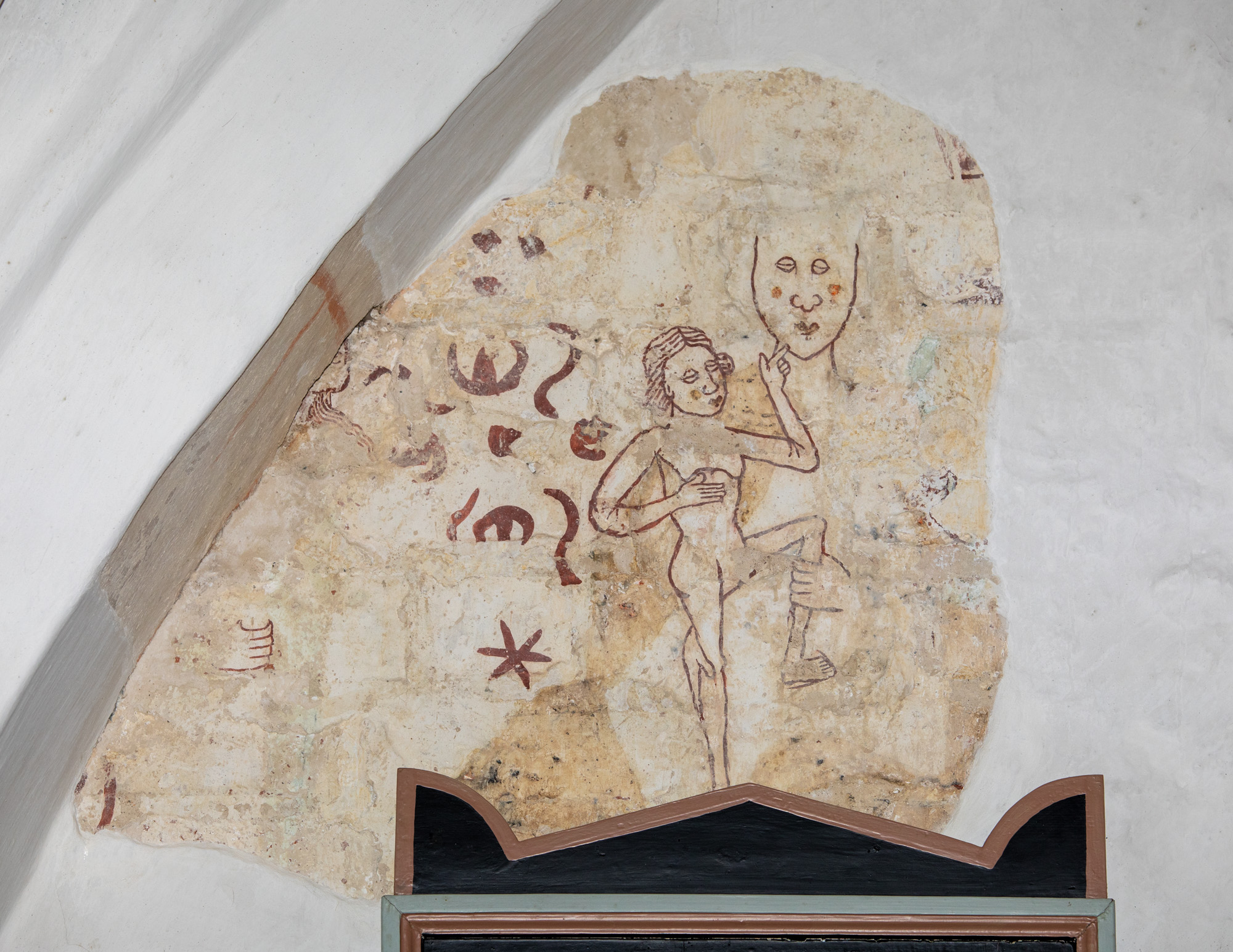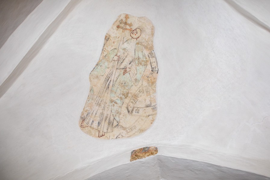 På triumfvæggen findes to større fragmenter af kalkmalerier.