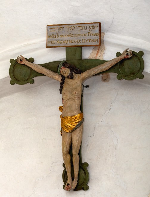 Korbuekrucifix fra 1600-tallet. Indskriften er på hebraisk, græsk og latin: ”Iesus Nazarænus Rex Iudæorum.” Jesus fra Nazareth, jødernes konge.
