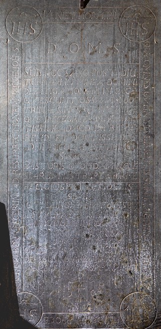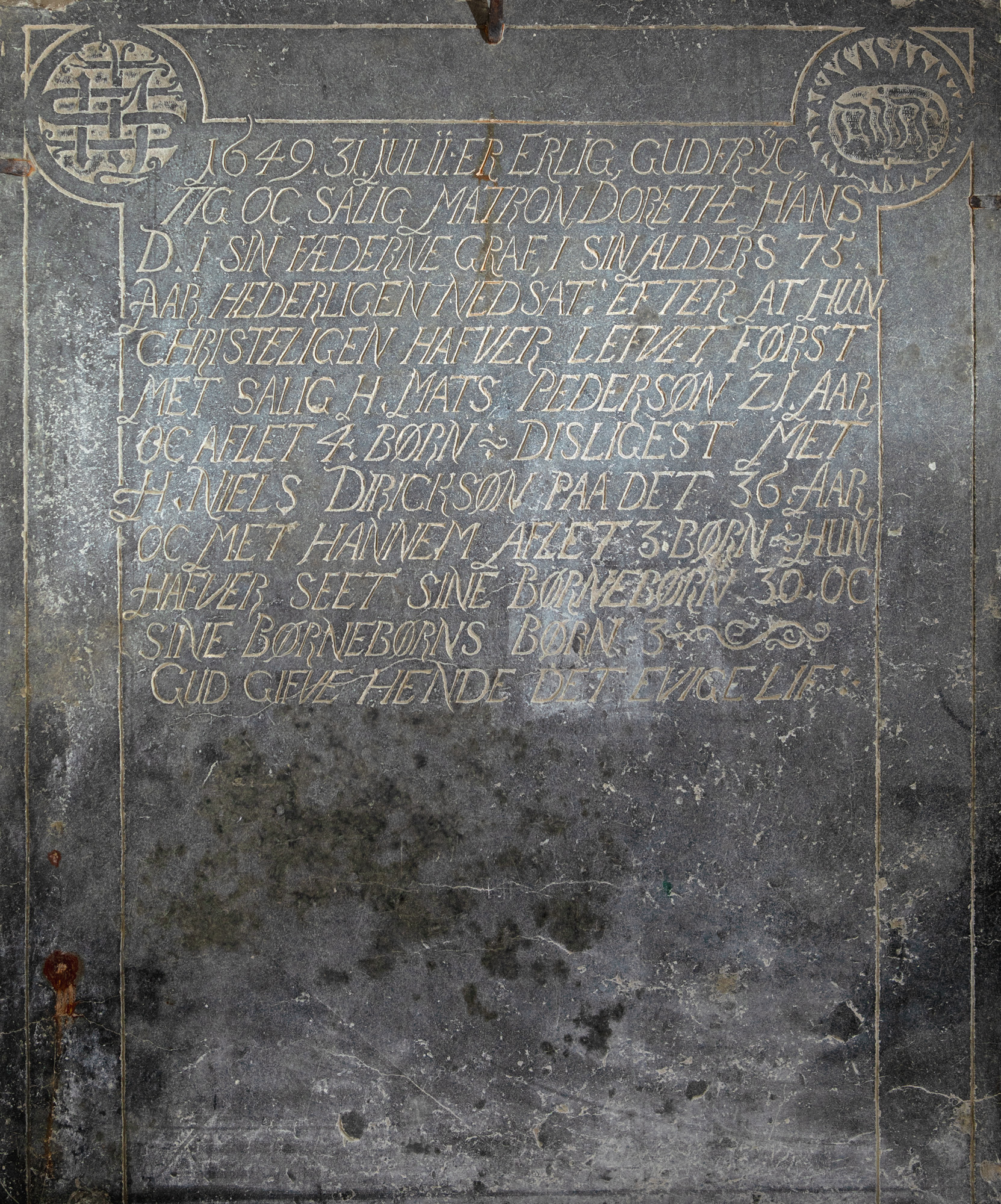 1649, 31. julii er erlig, gudfrÿctig oc salig matron, Dorethe Hand D. i sin fæderne graf, i sin alders 75 aar, hederligen nedsat efter at hun christeligen hafver lefvet, først met salig H. Mats Pedersøn 21 aar oc aflet 4 børn – disligest met H. Niels Diricksøn paa det 36 aar oc met hannem aflet 3 børn. Hun hafver seet sine børnebørn 30 oc sine børnebørns børn 3 – Gud gifve hende det evige lif.