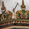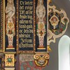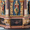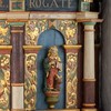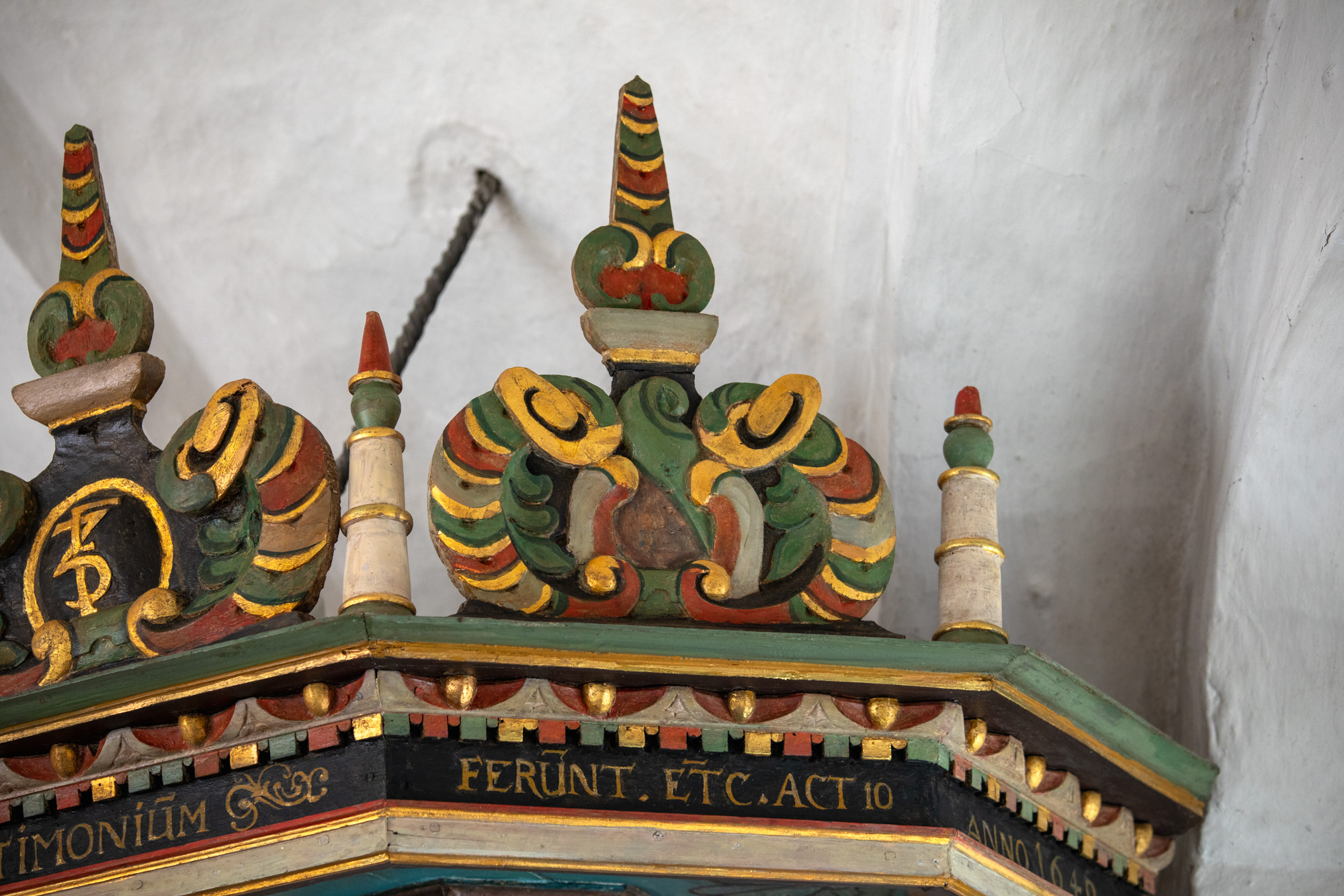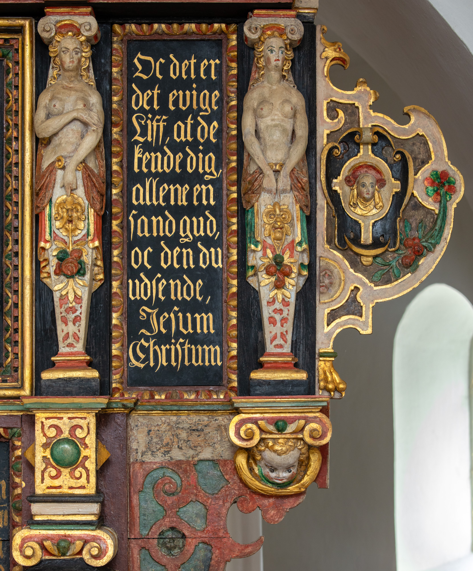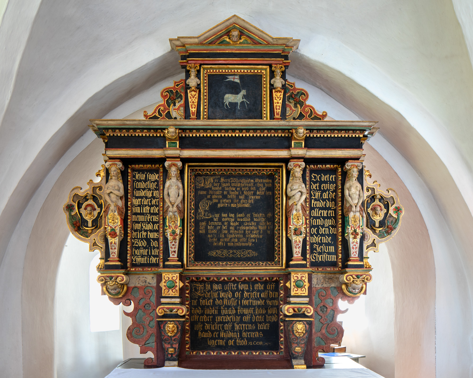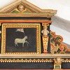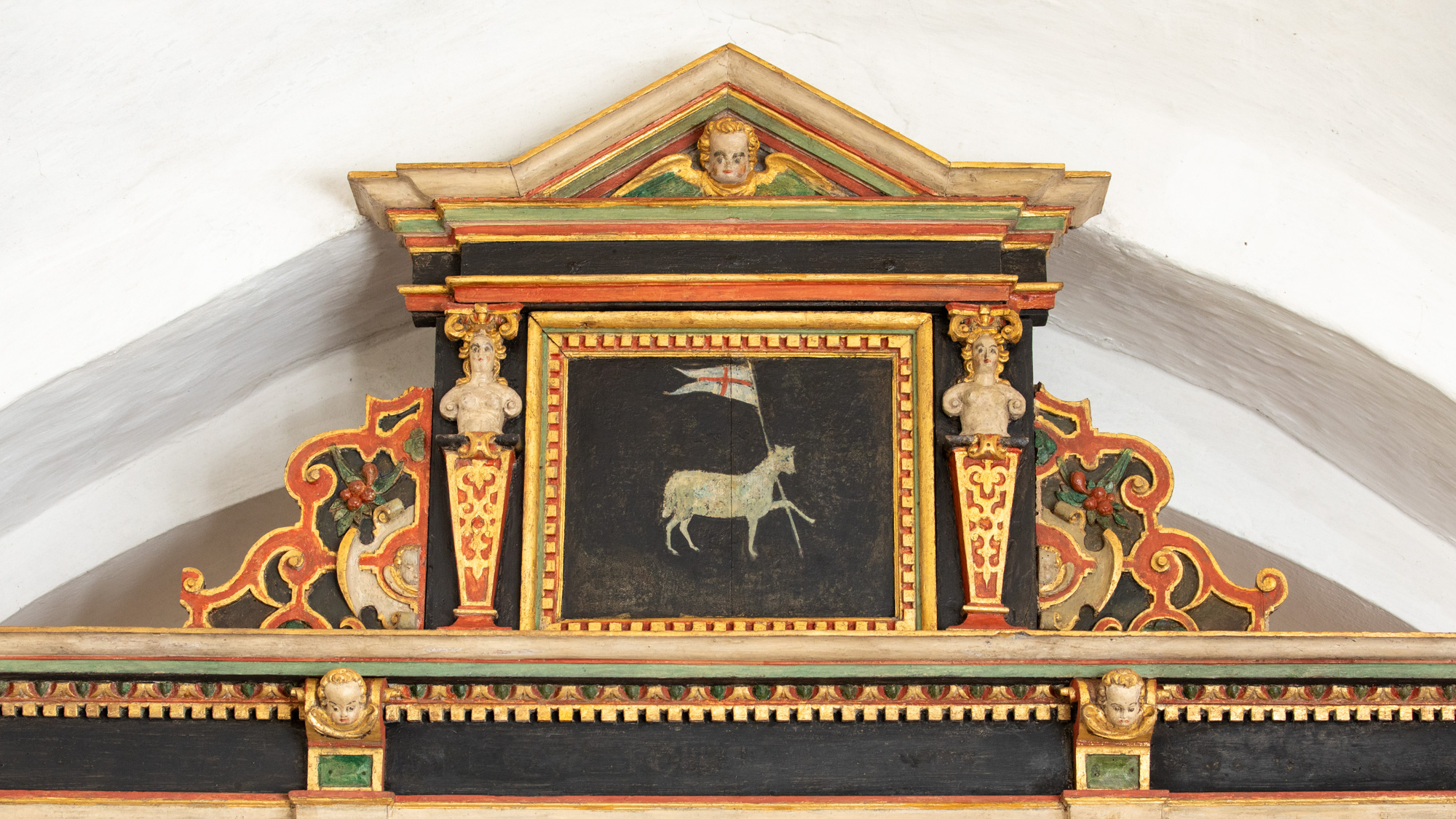 Topstykket har et billede af et korslam med fane og over det et gavlfelt med et englehoved.