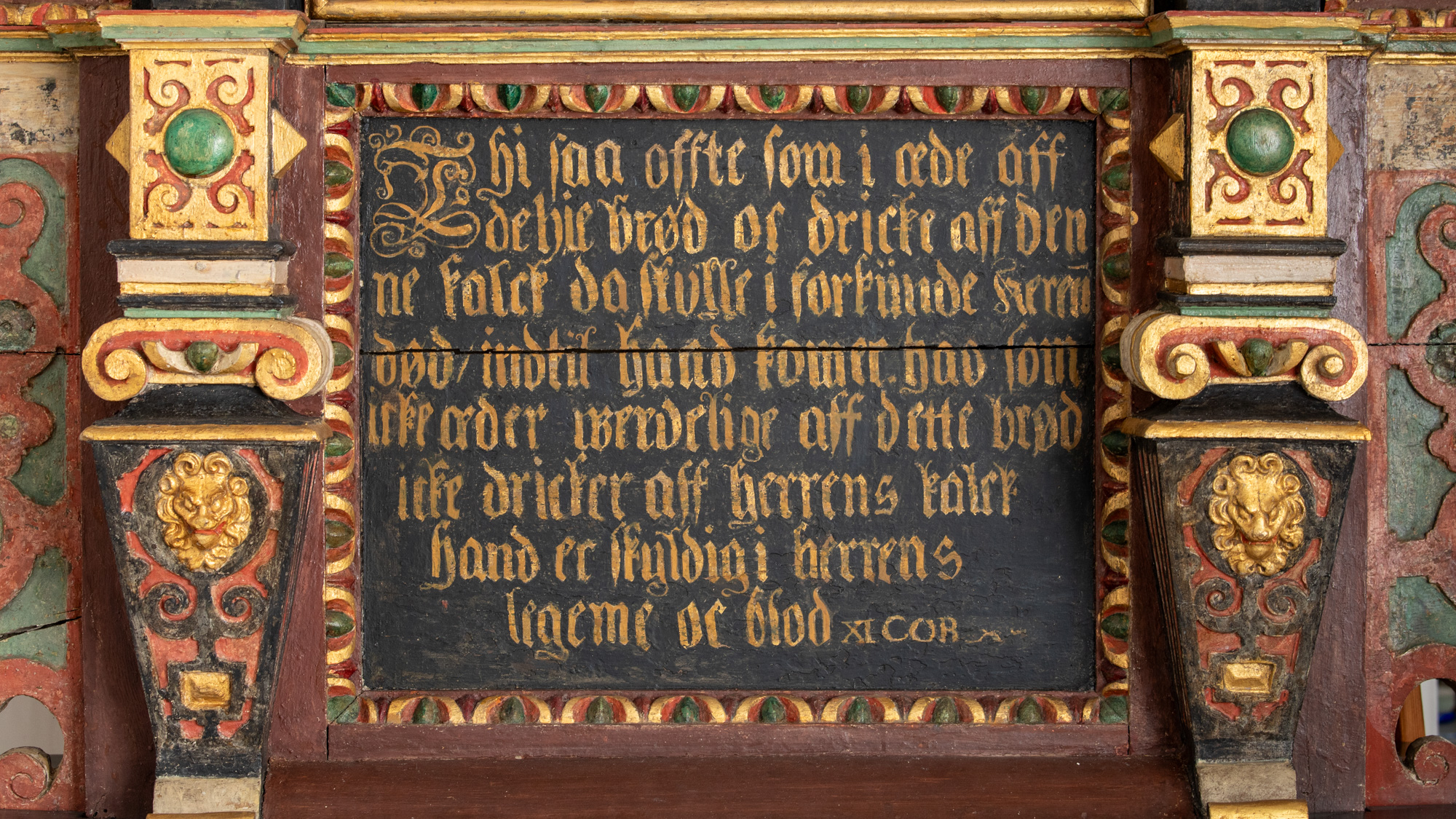 Thi saa offte som i æde aff dette brød oc dricke aff denne kalck da skulle i forkynde Herrens død, indtil hand komer. Hand som ikke æder uverdelige aff dette brød ick dricker aff herrens kalck hand er skyldig i herrens legeme oc blod. (1. Kor. 11,26-27).