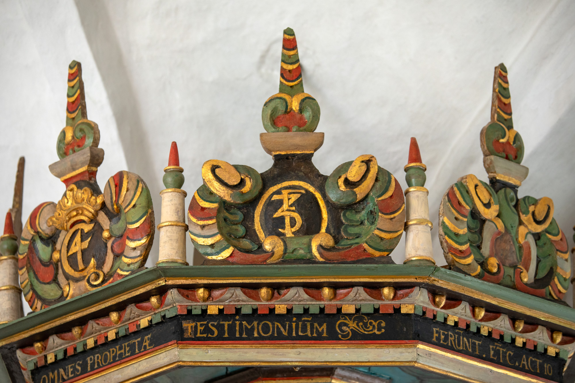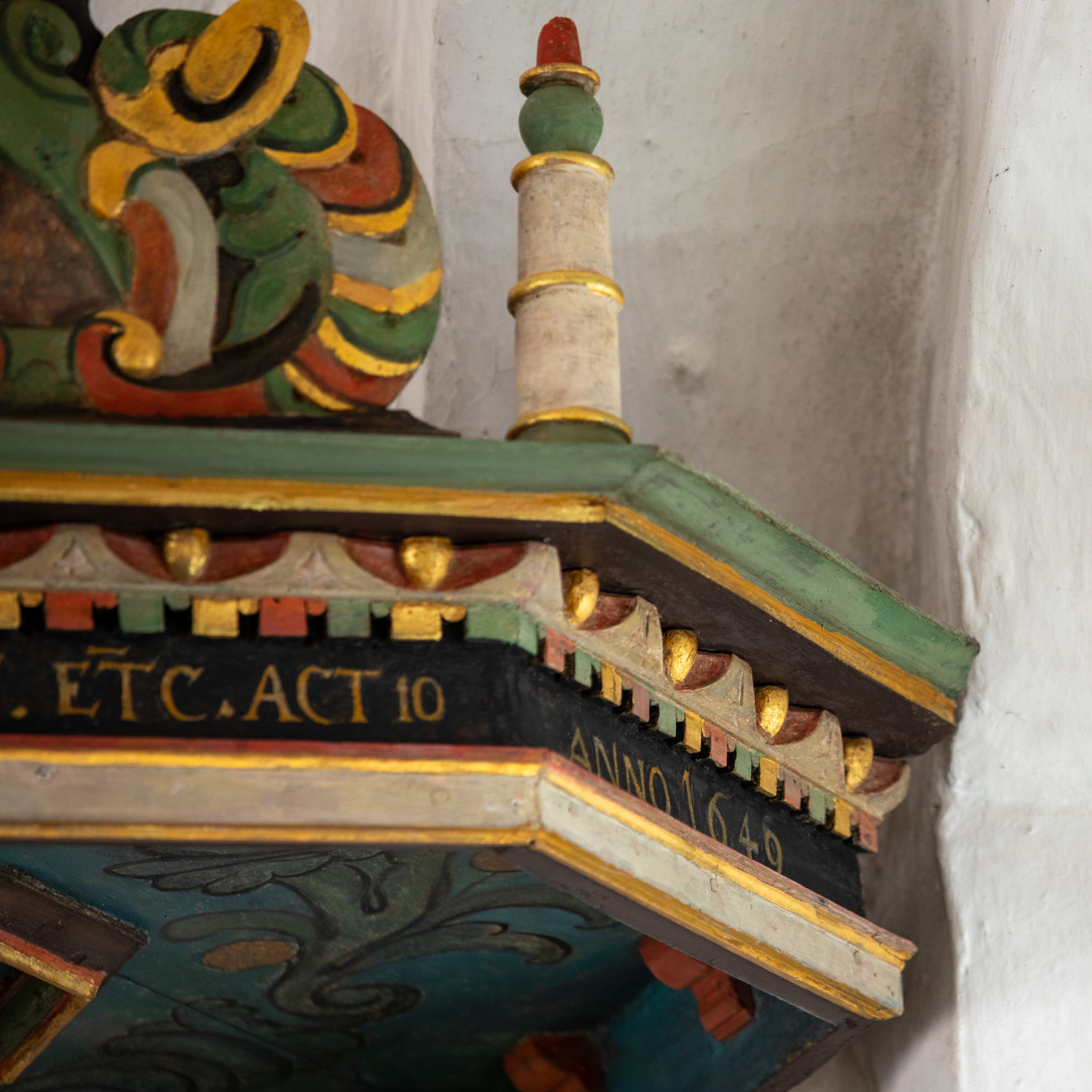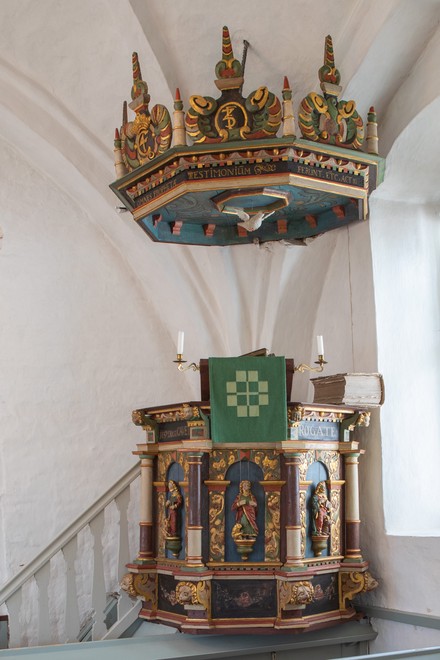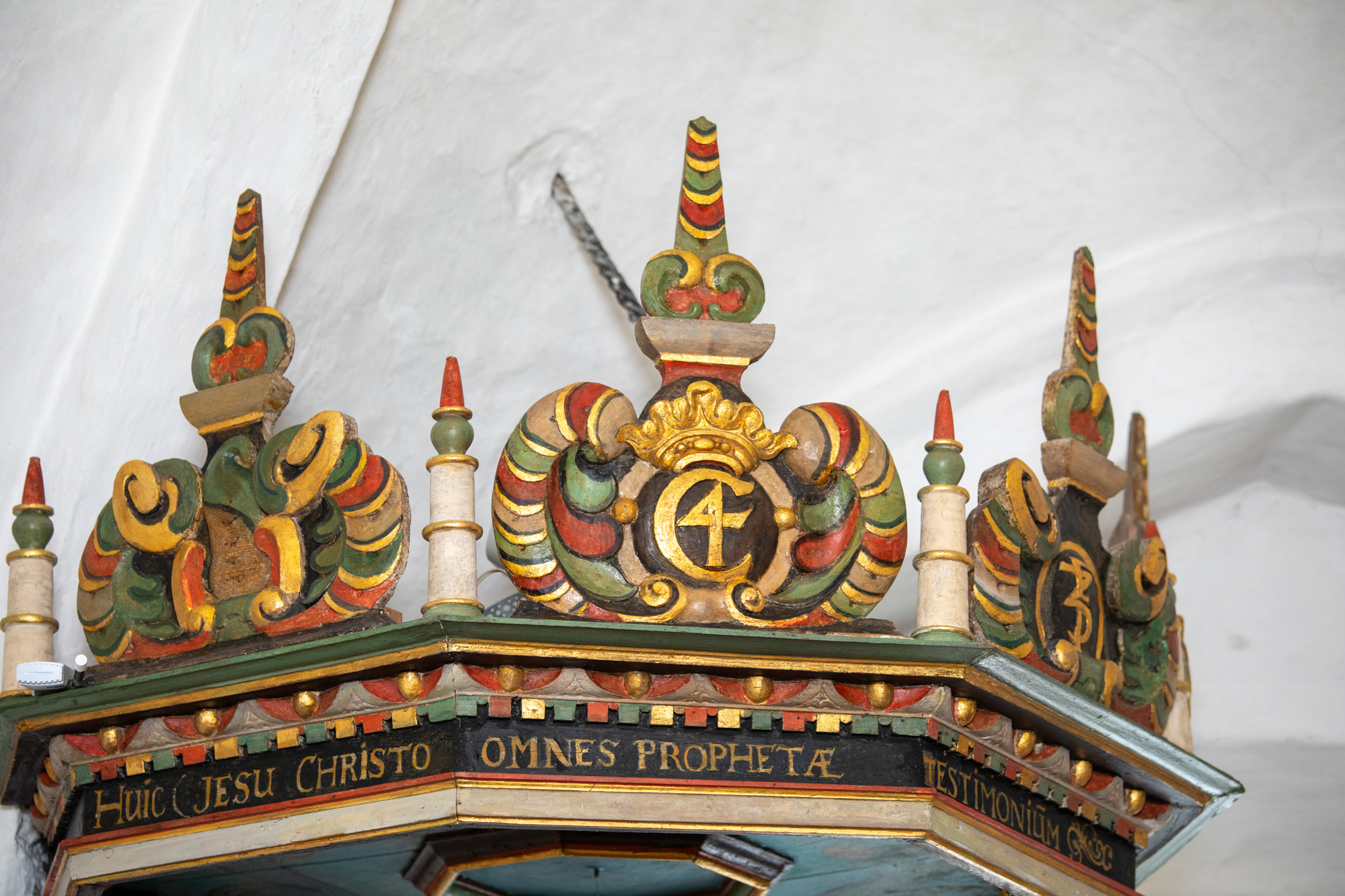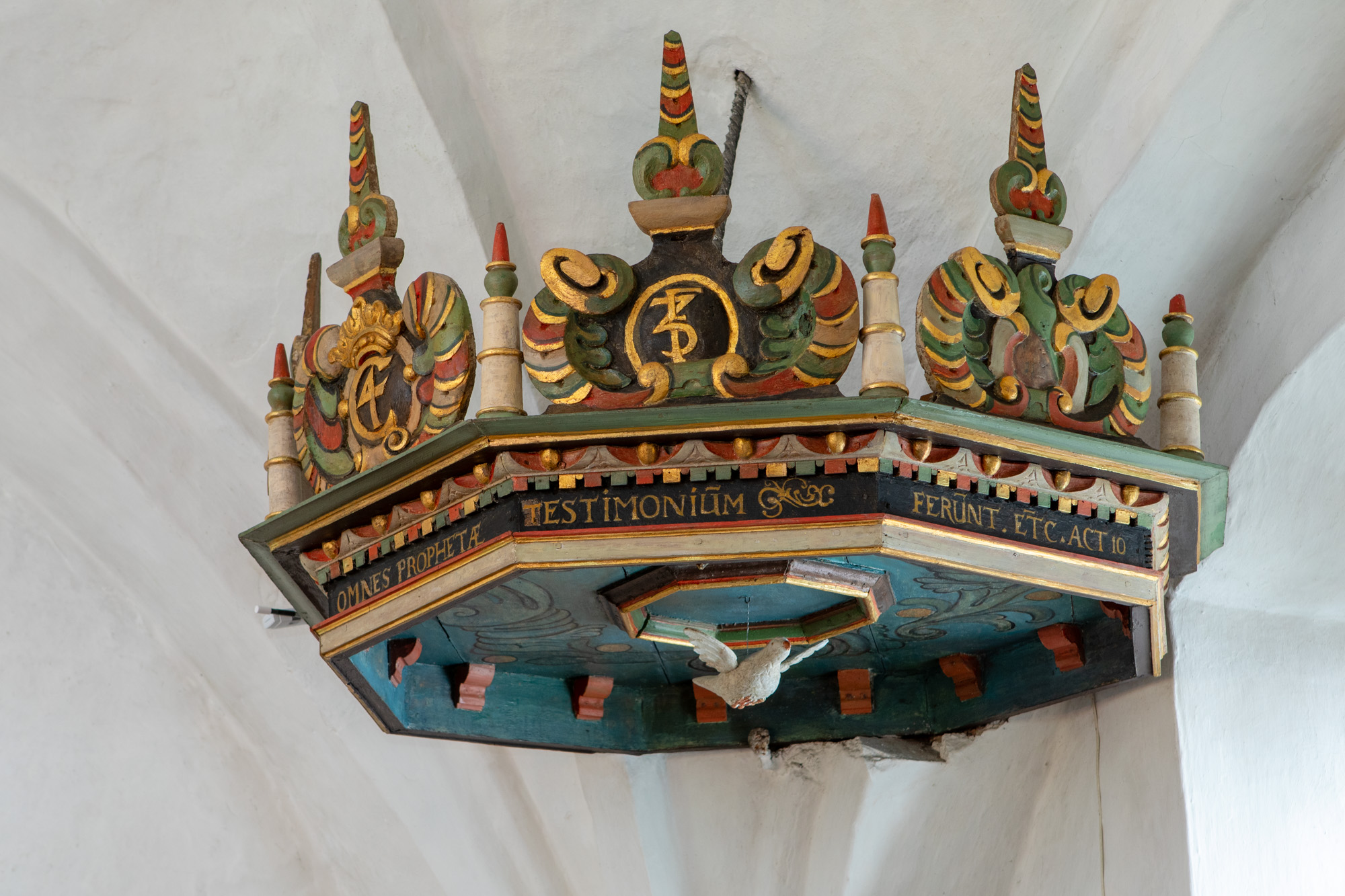 Lydhimlen bærer årstallet 1649 og både Christian IVs og Frederik IIIs monogram. Arbejdet med prædikestolen har formodentlig været i gang, inden Christian IV døde 1648. På kanten står der: ”Huic Jesu Christo omnes prophetæ testimonium ferunt. Etc. Act. 10. Anno 1649.” Om denne Jesus Kristus vidner alle profeterne. Act. 10,43.