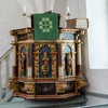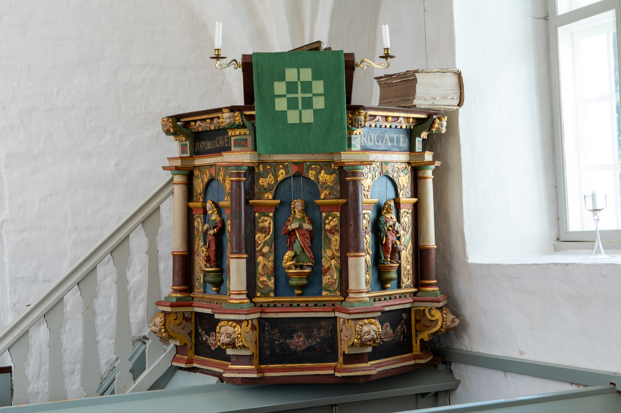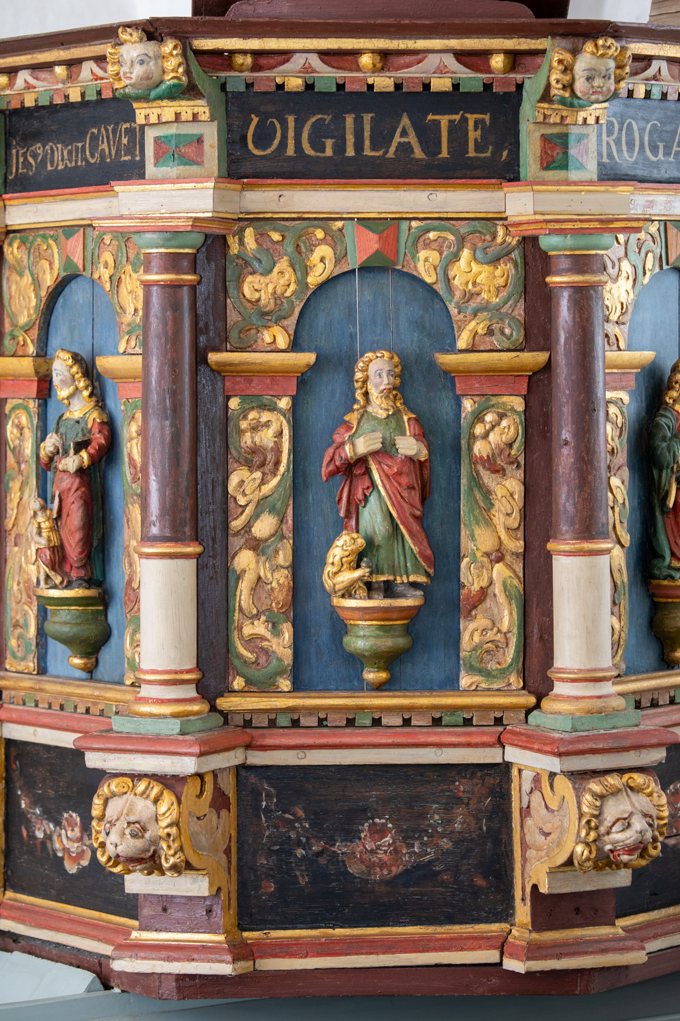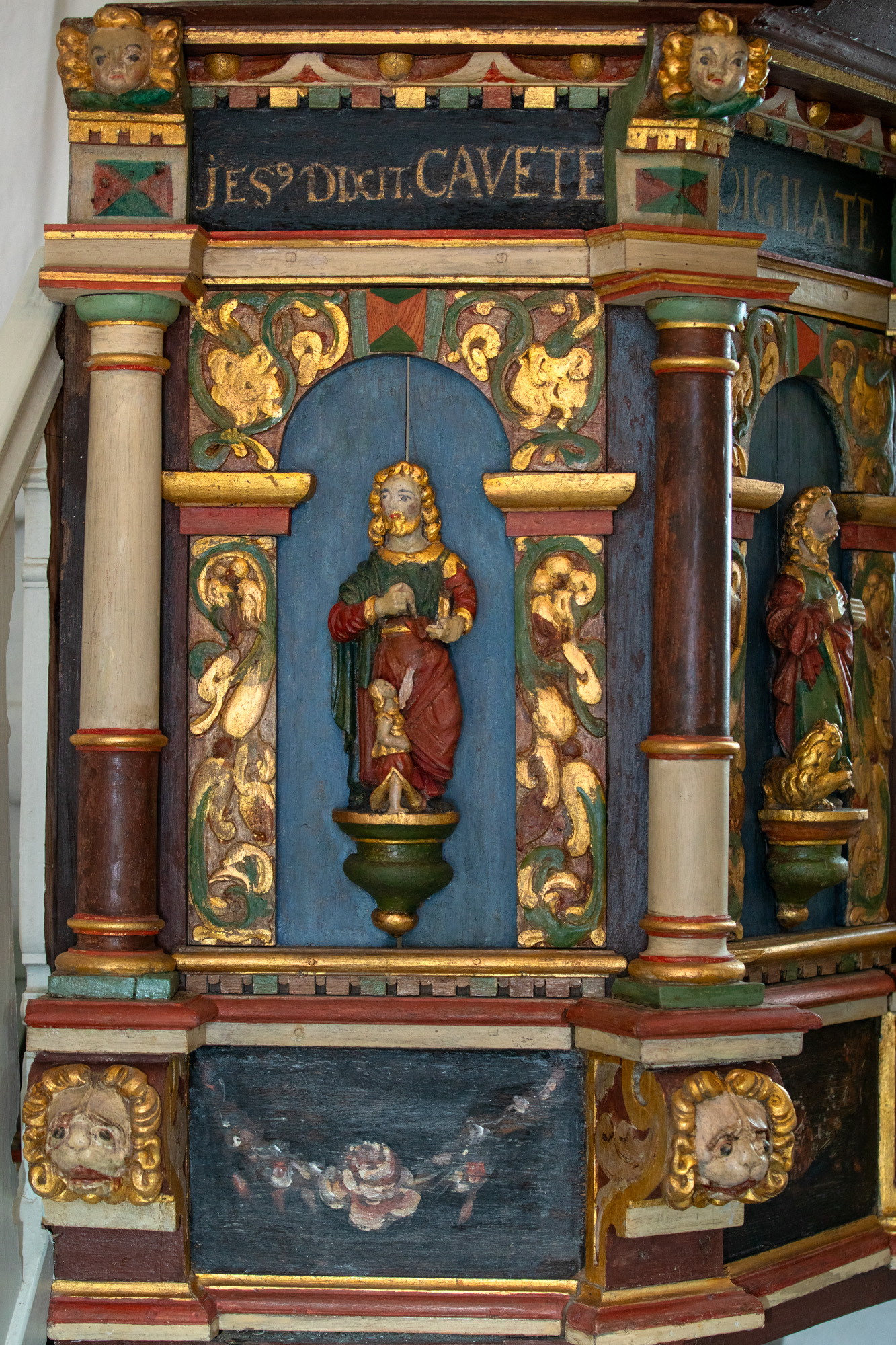 Storfelterne består af buefelter, hvor pilstre og buer er udsmykket med en bruskinspireret ornamentik. De har fremstillinger af tre evangelister, idet Johannes mangler. Prædikestolskurvens fjerde side er tom. Søjlerne er fritstående med glatte skafter står på kraftige fremspring. I de øverste smalfelter står der: ”Jes 9 dixit. Cavete, vigilate, rogate.” Det betyder Vogt dig, våg, bed.” Det har dog ikke været muligt at idenficere ordene i Es. 9. De nederste smalfelter har en malet rankeudsmykning. På fremspringene er der løvemasker.