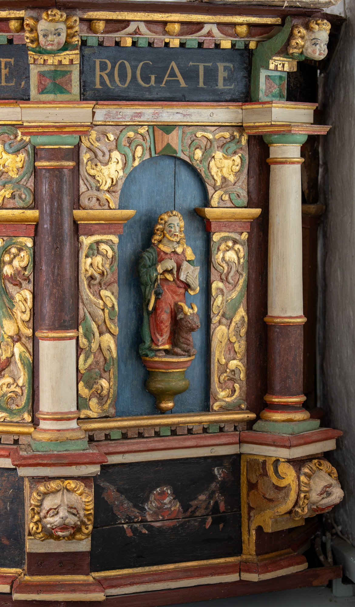 • Bartolomæus med kniv. • Jakob den Ældre med muslingeskal i hatten. • Johannes Evangelist med giftbæger. • Matthæus eller Paulus. Sværdet er attribut for dem begge.