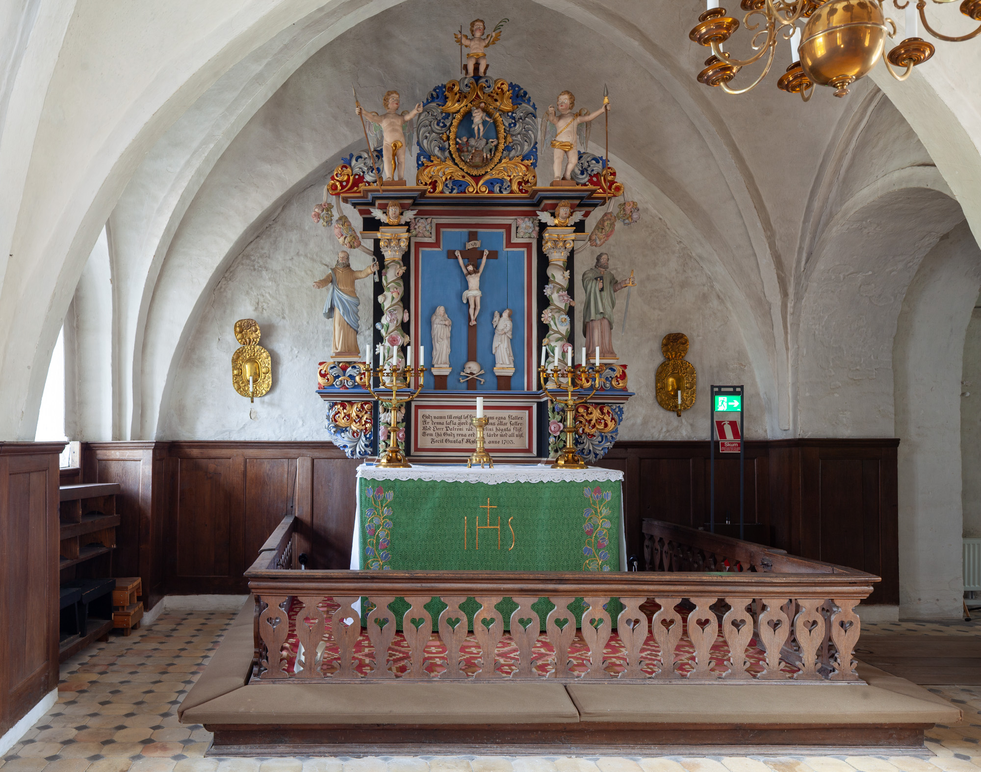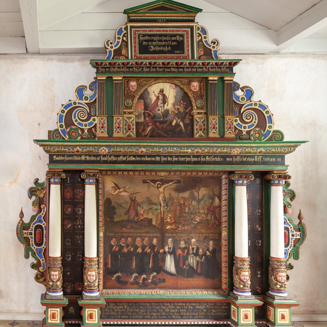 Altertavlen er skåret af Gustaf Kilman 1703.
