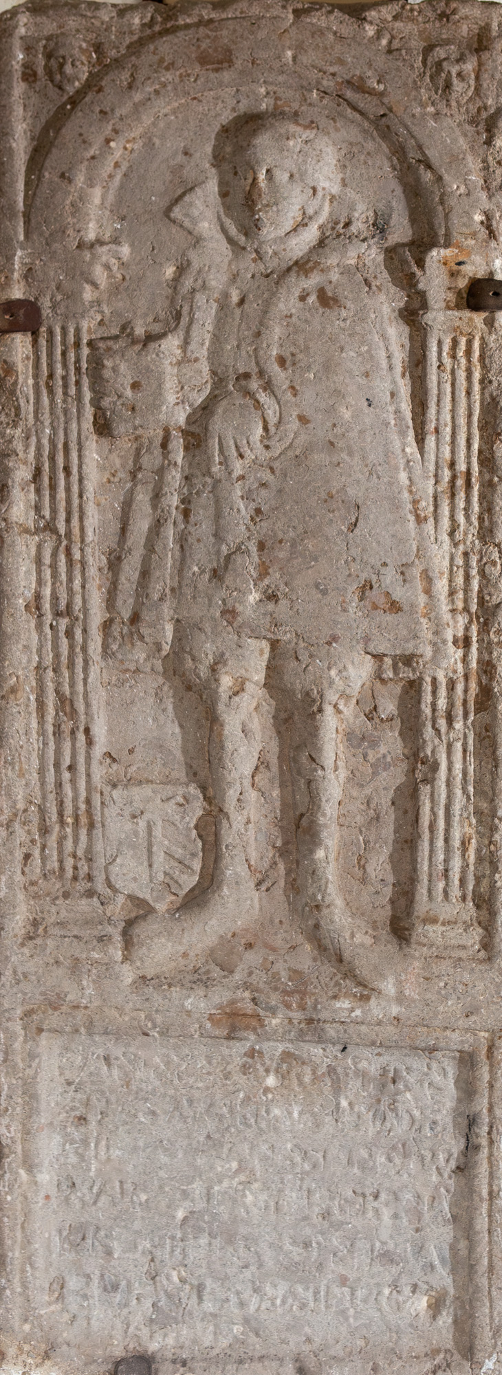 Gravsten over ukendt person. Teksten er slidt og ulæselig. Det er sikkert en gravsten over en præst fra 1560’erne. Han står under en bue mellem to riflede pilastre. I sviklerne er der englehoveder. Ved hans fod står et bomærkeskjold. Indskriftsfeltet er forholdsvis højt.