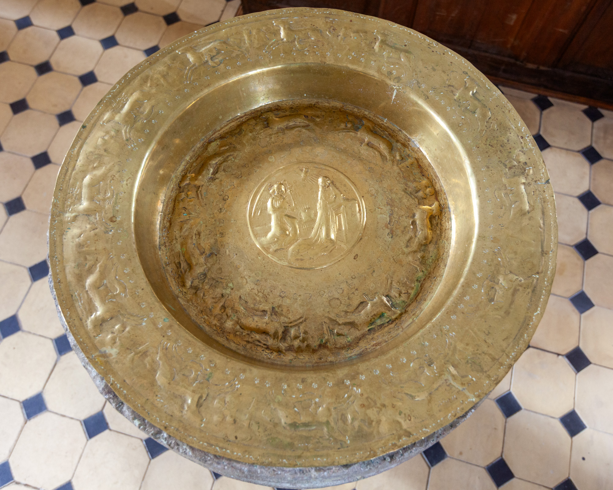 Motiv i bunden: Mariæ Bebudelse. Omkring dette motiv og på fadets rand er der springende hjorte.