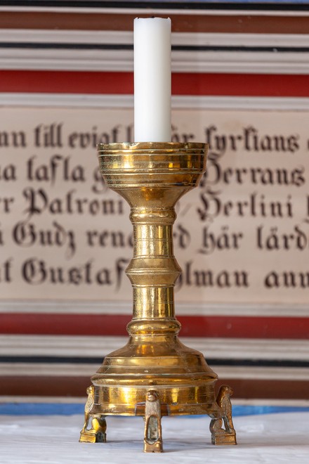 Alterstagerne har en dyb dråbeskål og står på fire høje dyrefigurer, der sidder ned og hviler på forbenene.