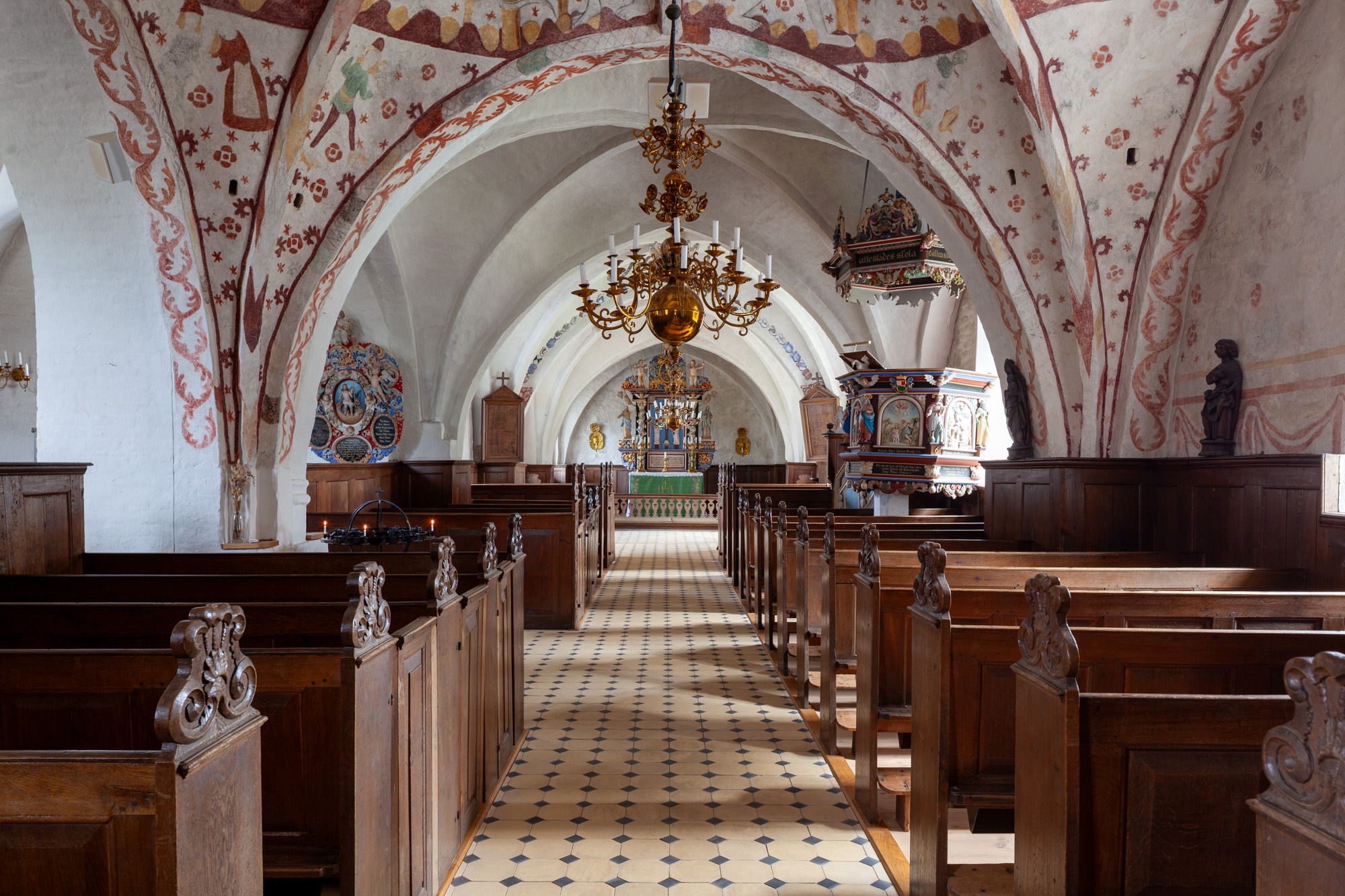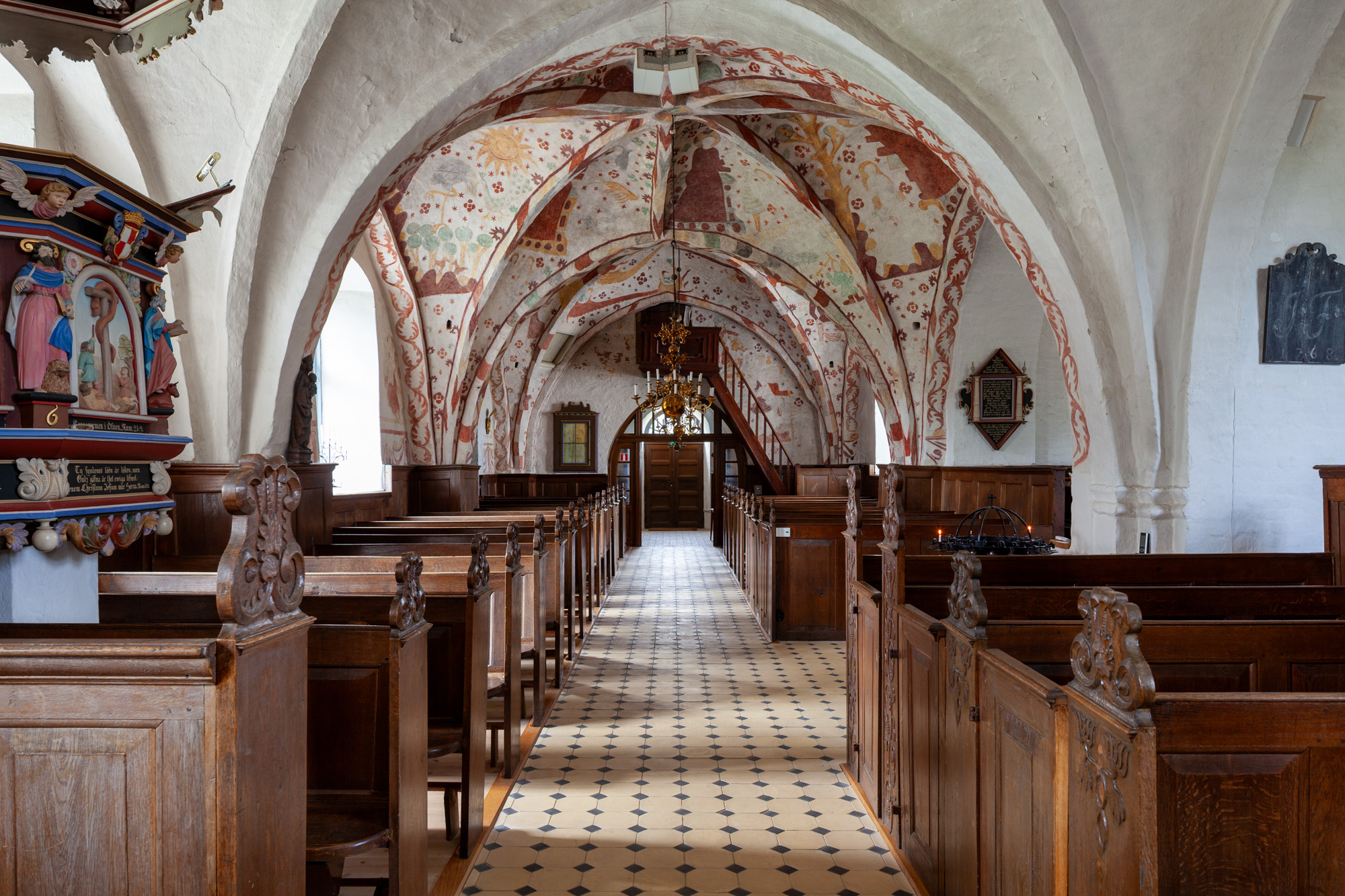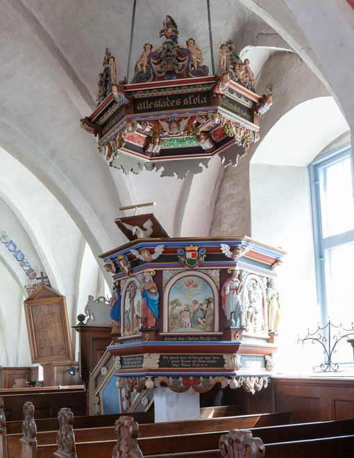 Prædikestolen fra 1696 er udført af Gustaf Kilman.