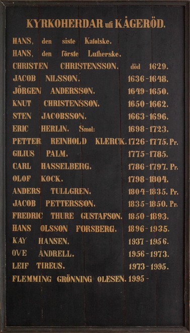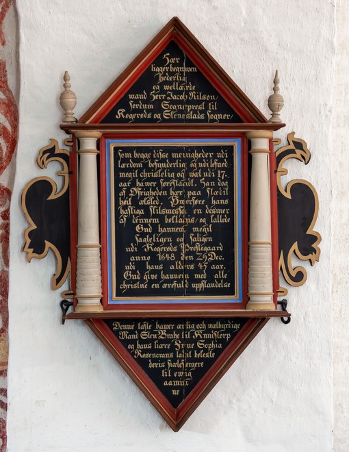 Hær ligger begrawen hederlig og wellærde mand Herr Jacob Nilson fordum Sogneprest til Kogerøds og Stenestads sogner som begge disse menigheder udi lærdom besynderlig og udi lefued megit christelig og wæl udi 17 aar hawer førestaadt. Han dog af Øfrigheden hæer paa stædit høit ælsked. Hworføre hans hasliga skilsmessa en desmer af dennem beklagis og kallede Gud hannem megit sagteligen og saligen udi Kogerøds Prestegaard anno 1648 den 29 Dec. udi hans alders 45 aar. Gud give hannem med alle christne en ærefuld uppstandelse. Denne tafle hawer ærlig och wælbyrdige Mand Sten Brahe til Knudstorp og hans kiære Frue Sophia Rosencrans ladit bekoste deris siælesørgere til ewig aaminne.