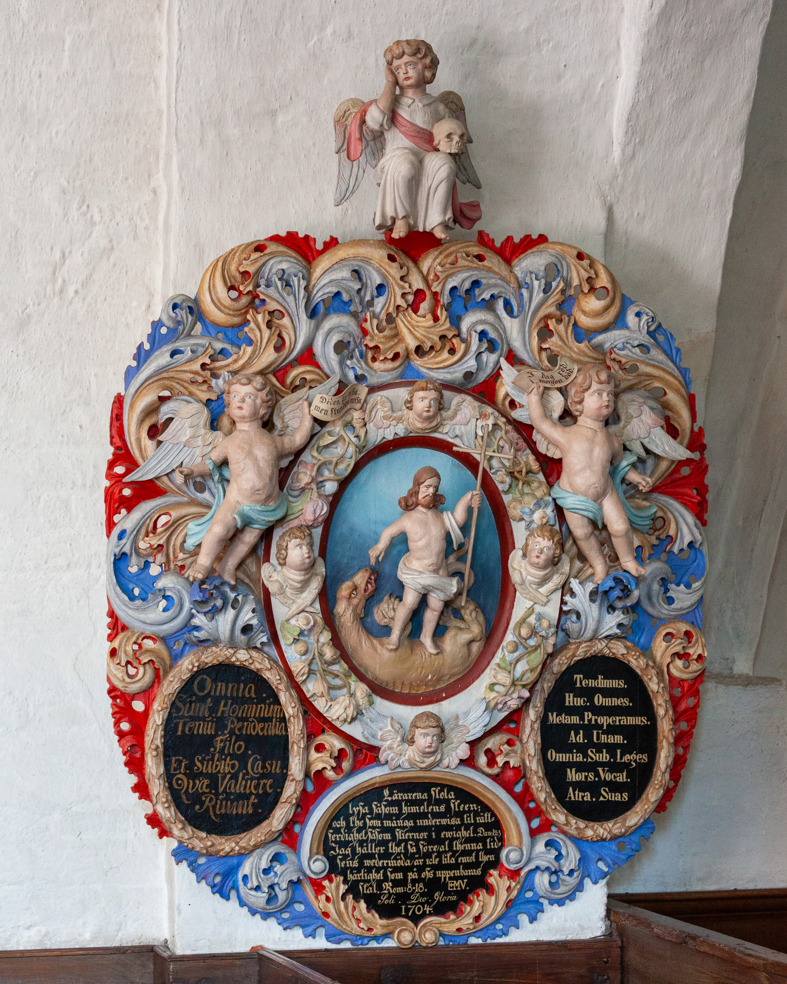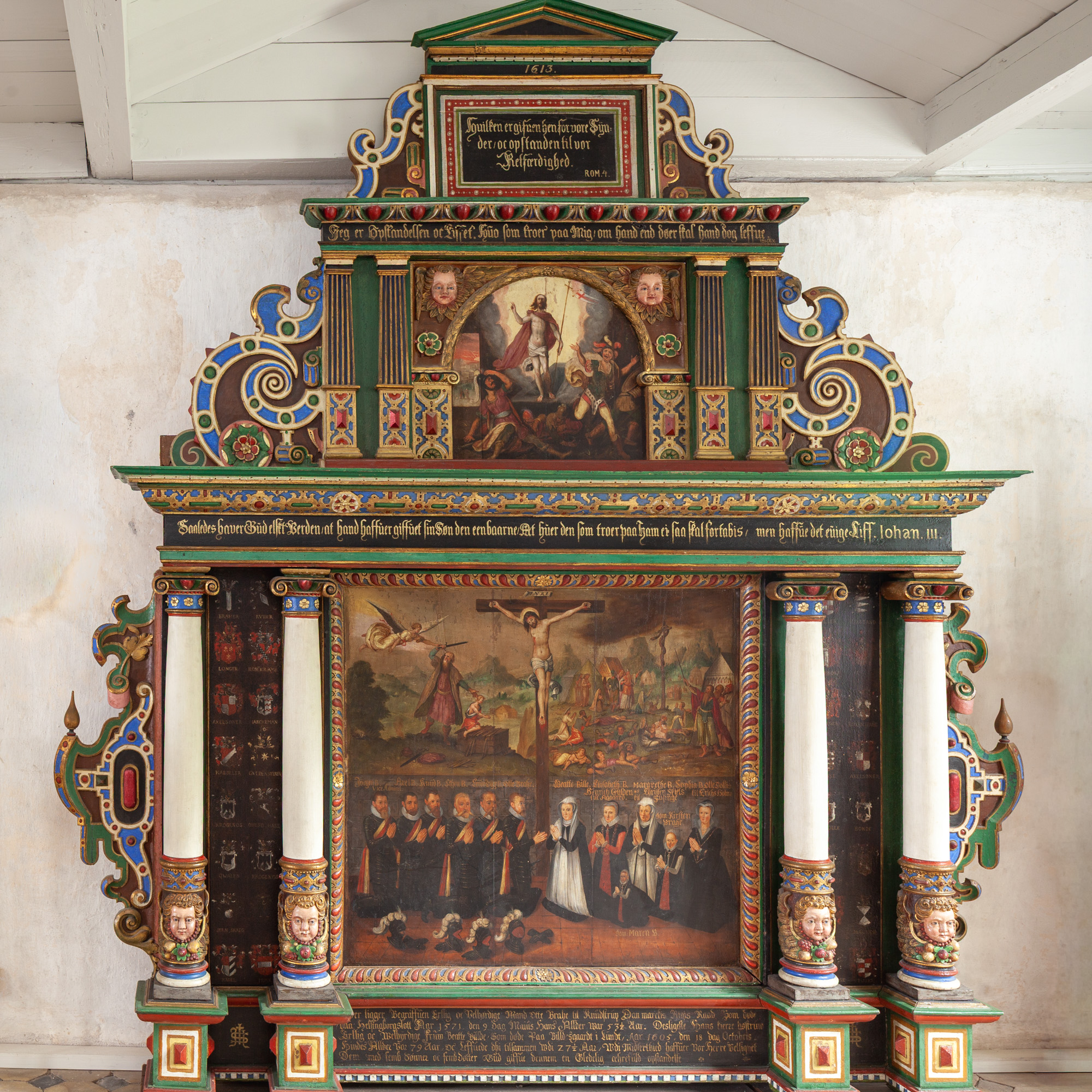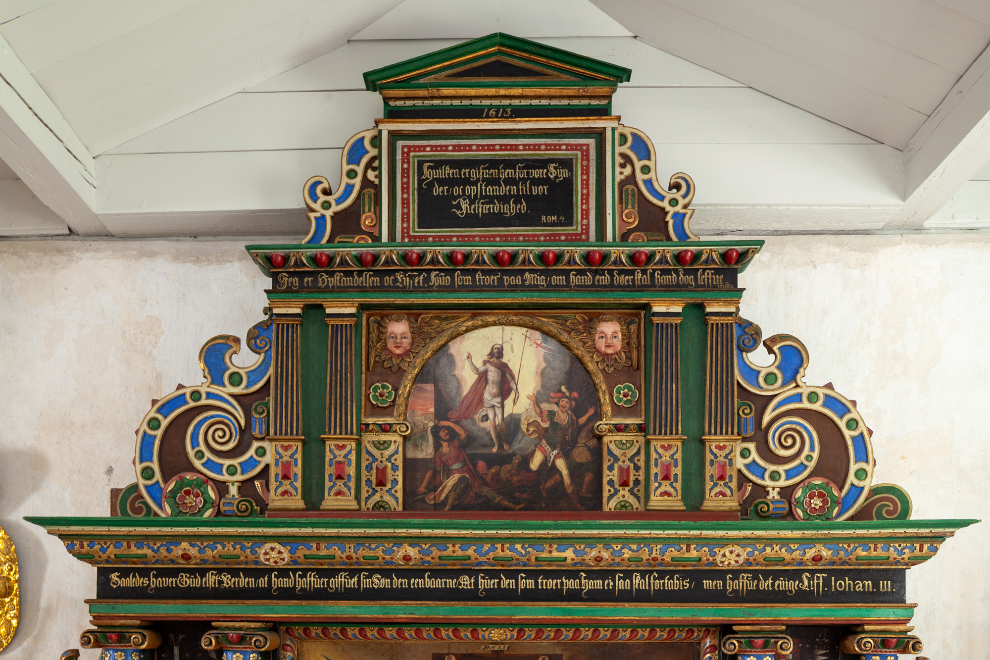 Over gesimsen ses et billede af Kristi opstandelse og øverst under gavlfeltet ses årstalllet 1613. Derunder er et rektangulært felt med teksten: