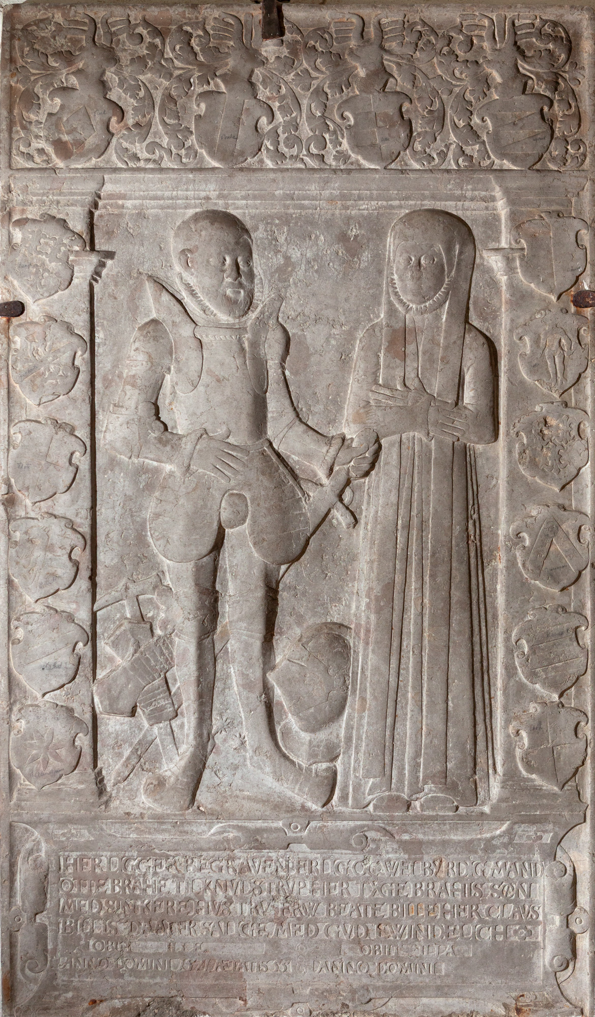 På parrets gravsten er der kun blevet plads til 2 gange 8 anevåben. De fire øverste er hjelmede. 2 gange 6 er anbragt på pilastrene. Otto Brahe er iført rustning og holder højre hånd foran livet og venstre hånd på sværdskæftet, hvis knop berører hendes albue. Imellem parret ligger hans hjelm, og ved hans højre fod en hammer og et par handsker. Forneden er en kartouche med følgende tekst: