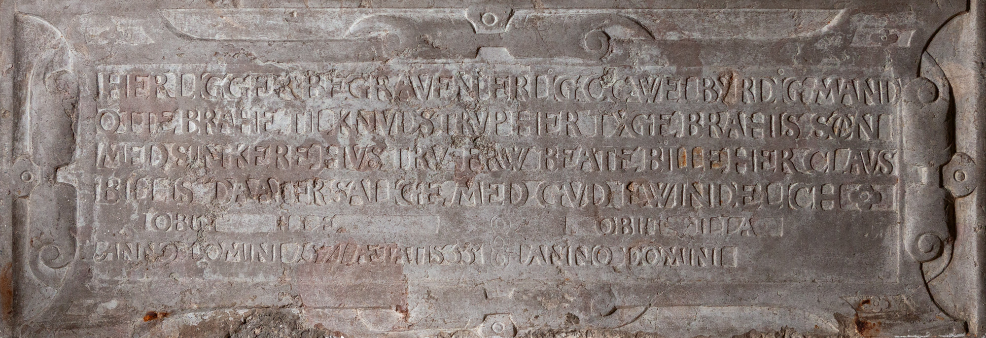 Her ligger begraven erlig oc welbyrdig mand Otte Brahe til Knudstrup Here Tyge Brahis søn med sin kere hustru frw Beate Bille her Claus Billis daater salige med Gud … obiit ille .. obiit illa .. Anno Domini 1571 ætatis 55 Anno Domini …