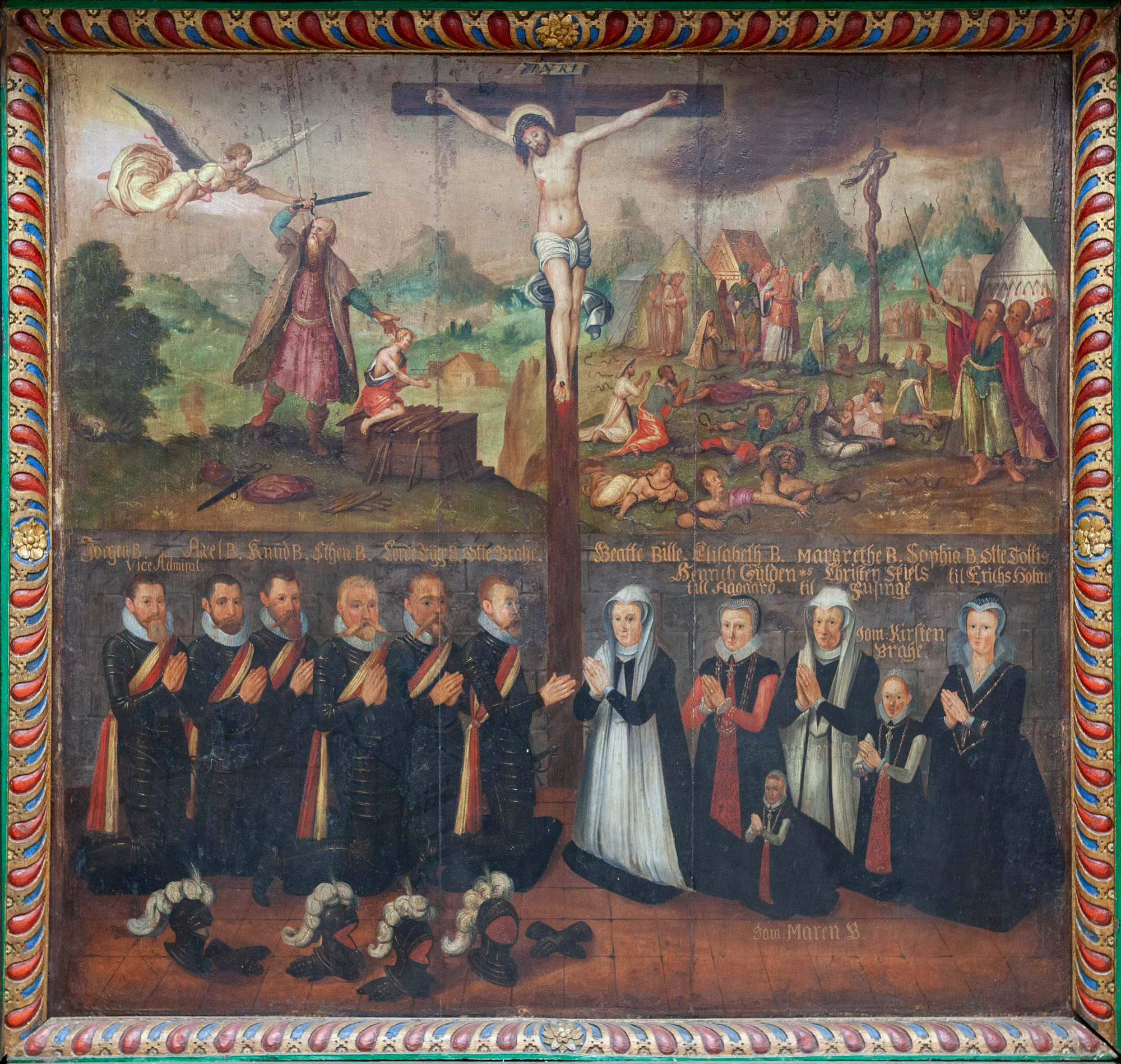 Den nederste del af billedet viser familieportrættet med navne på de enkelte personer. På hver side af korsstammen står Otto Brahe og Beate Bille. Lige bag ham ses deres berømte søn Tycho Brahe – eller som der står: Lerde Tÿge B., den lærte Tyge Brahe.
