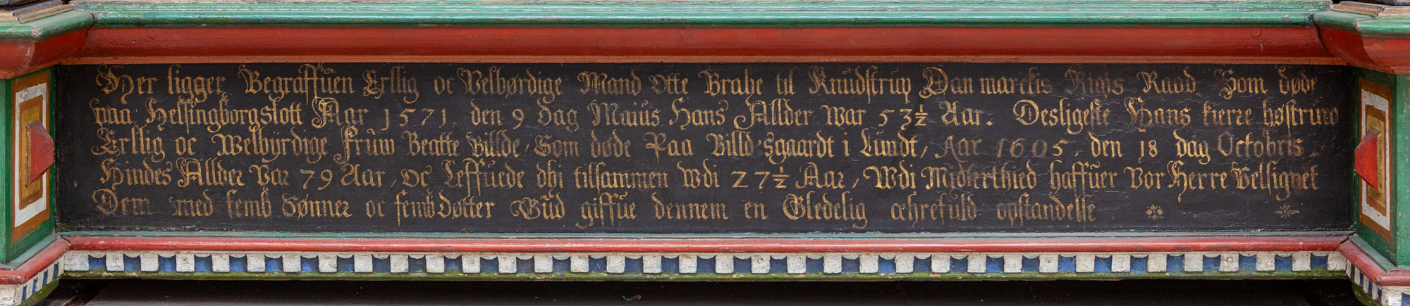 Her ligger Begraffuen Erlig oc Velbørdige Mand Otte Brahe til Knudstrup Danmarckis Rigis Raad Som døde paa helsingborg slott Aar 1571, den 9 dag Maius Hans Allder war 53½ Aar. Desligeste Hans kiere høstruw Erllig oc Welbÿrdige Fruw Beatte Billde, som døde Paa Billdisgaardt i Lundt, Aar 1605, den 18 dag Octobris. Hindes Allder var 79 Aar, oc Leffuede dhi tilsammen wdi 27½ Aar, Wdi Midlerthied (?) haffuer Vor Herre Velsignet Dem med femb sønner oc femb døtter Gud giffue dennem en Gledelig æhrefuld opstandelse.