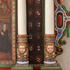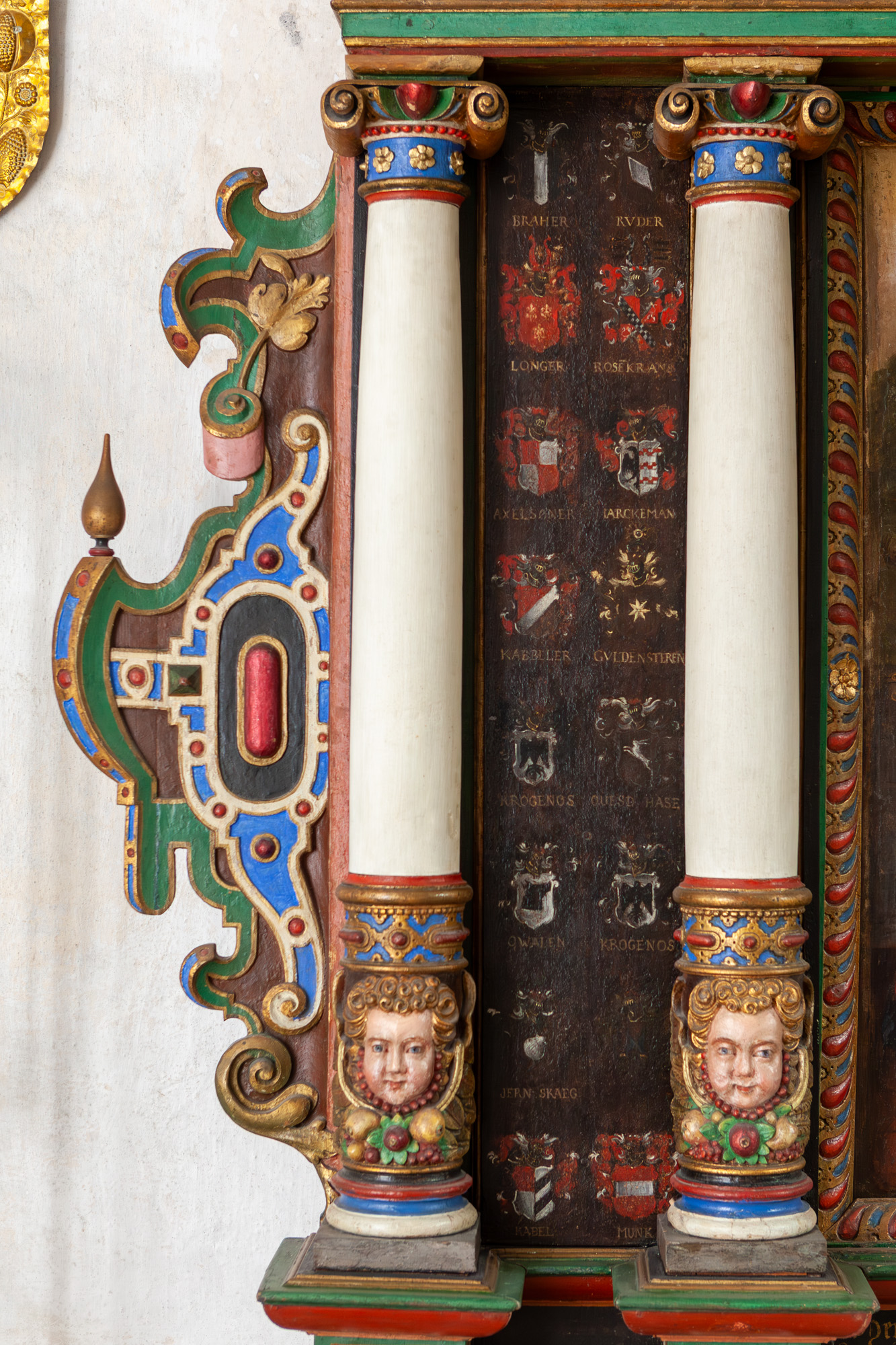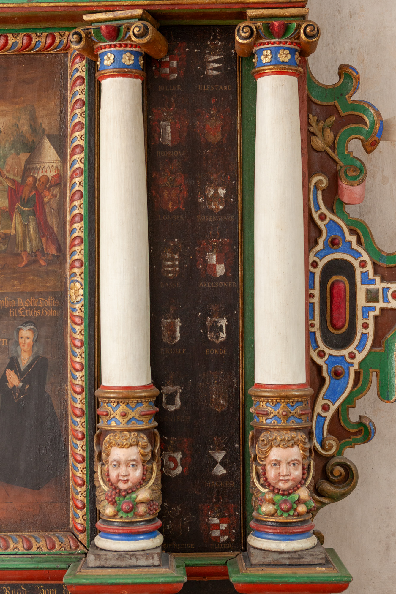 Billedet flankeres af dobbelte søjler og mellem dem de to gange 16 anevåben. Storstykket har små vinger.