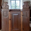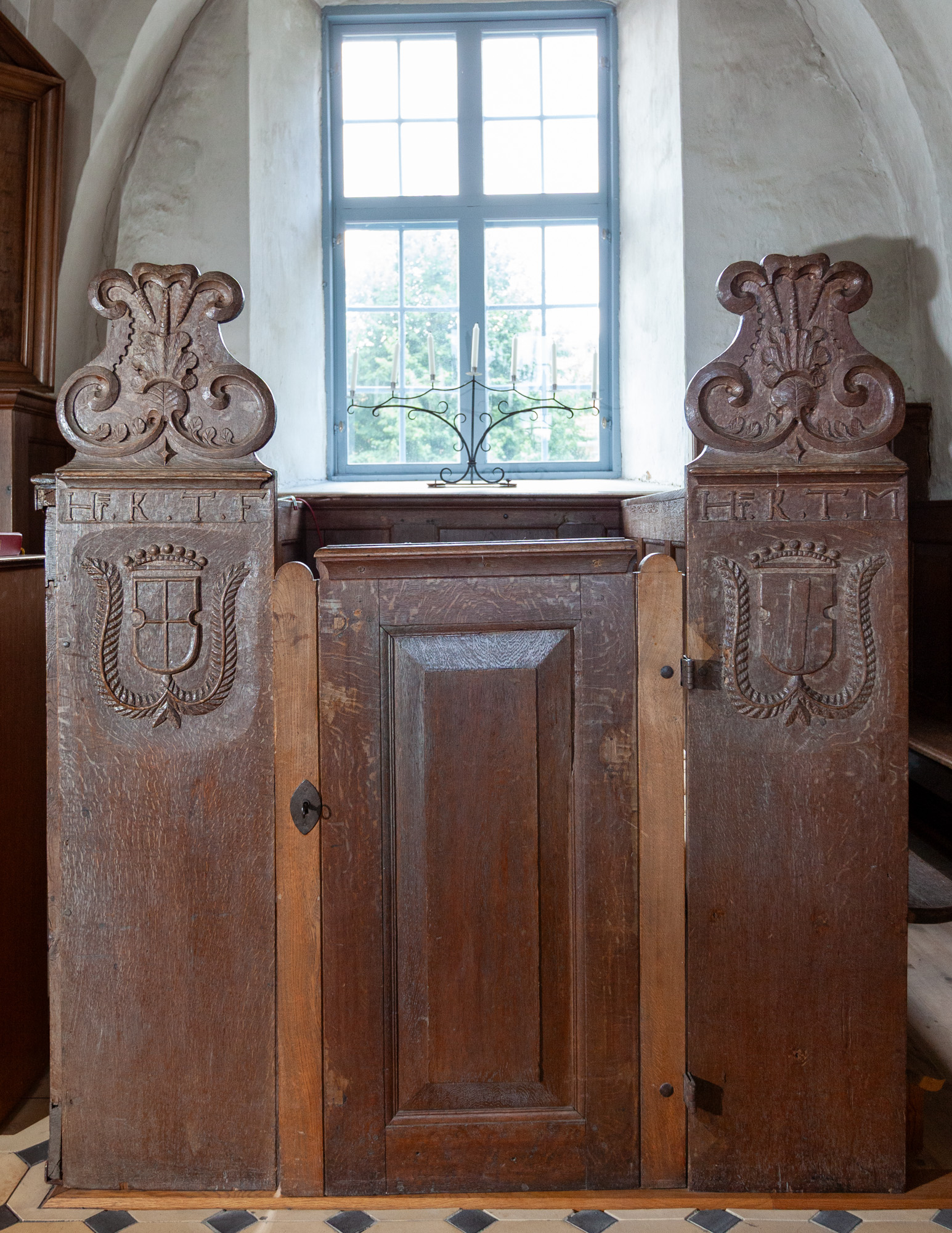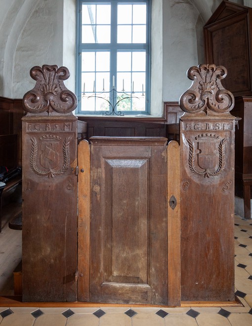 Herskabsbænke med våbenskjold, initialer og årstallet 1695.