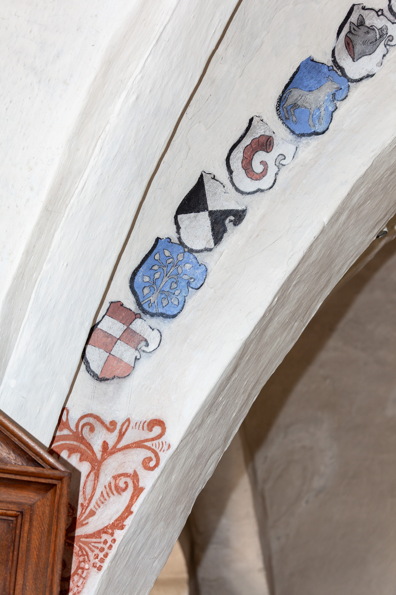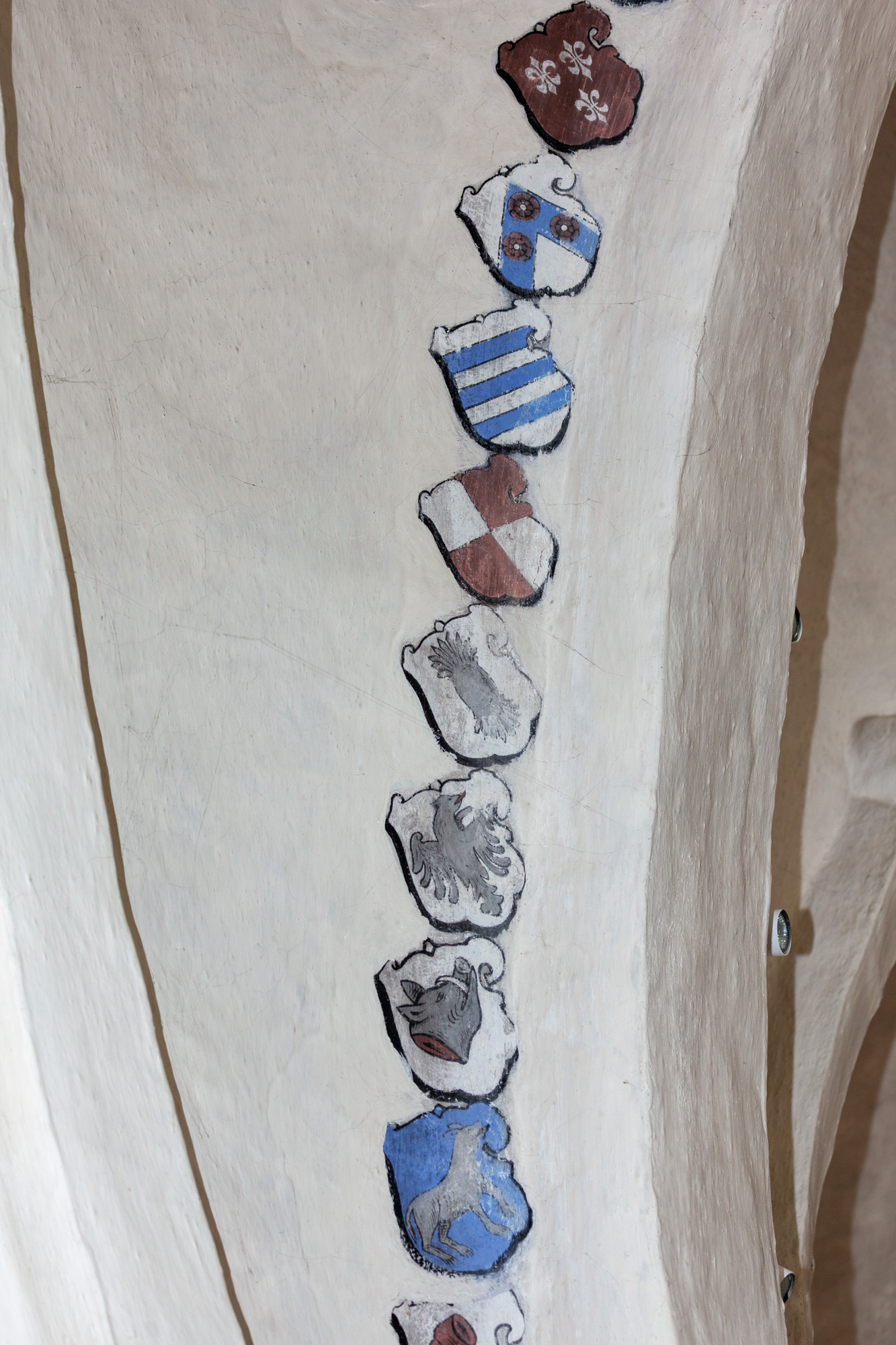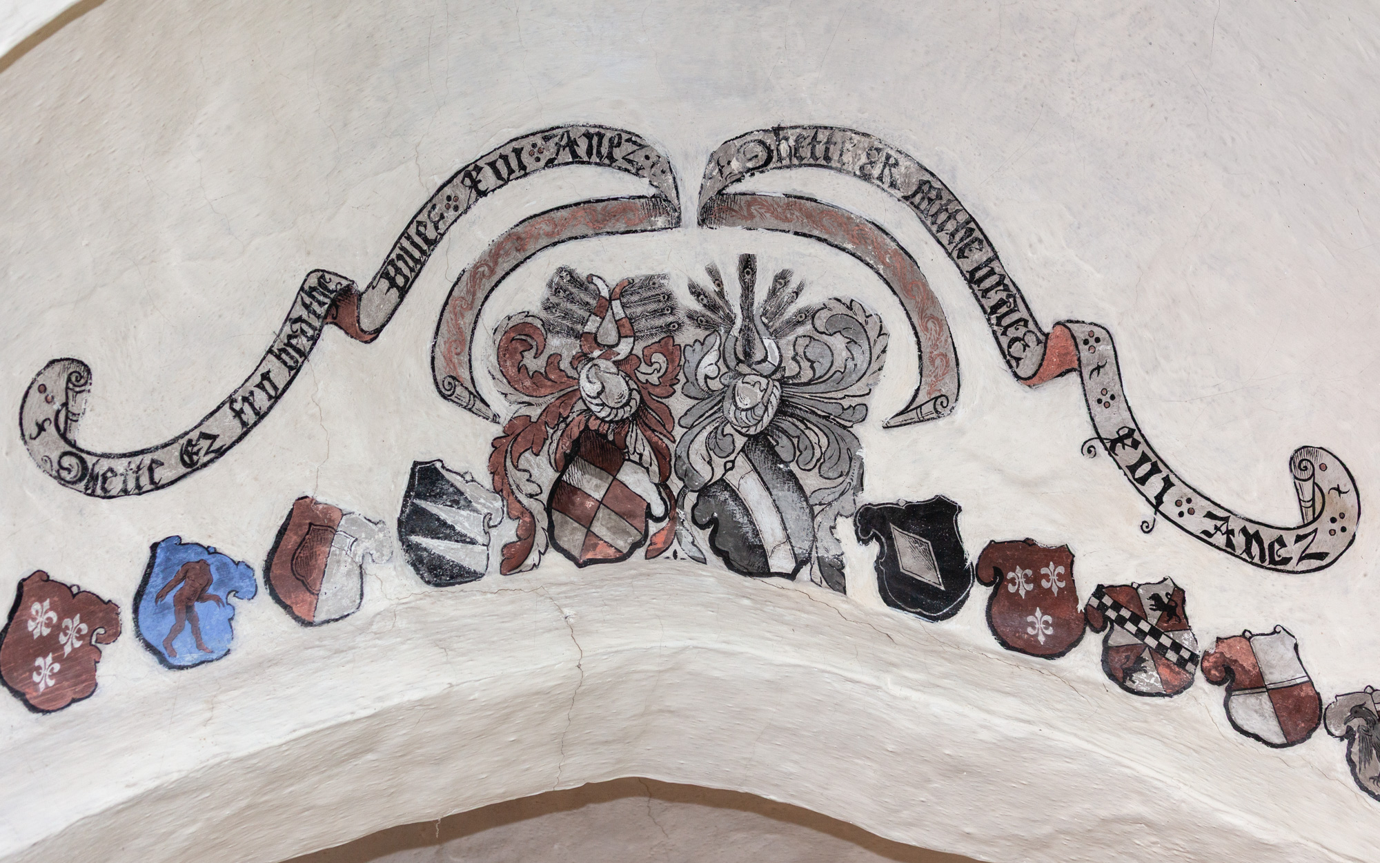 I koret findes 2 gange 16 anevåben for Otto Brahe, 1510-1571, og Beate Bille, 1526-1605. De blev gift i 1544. Derfor kan de dateres til perioden 1544-1571. På båndene står der: