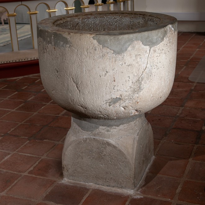 Døbefonten er af sandsten. Kummen har næsten lodrette sider og er helt glat uden udsmykning. Den har fals og udtømningshul. Foden er en omvendt terningkapitæl.