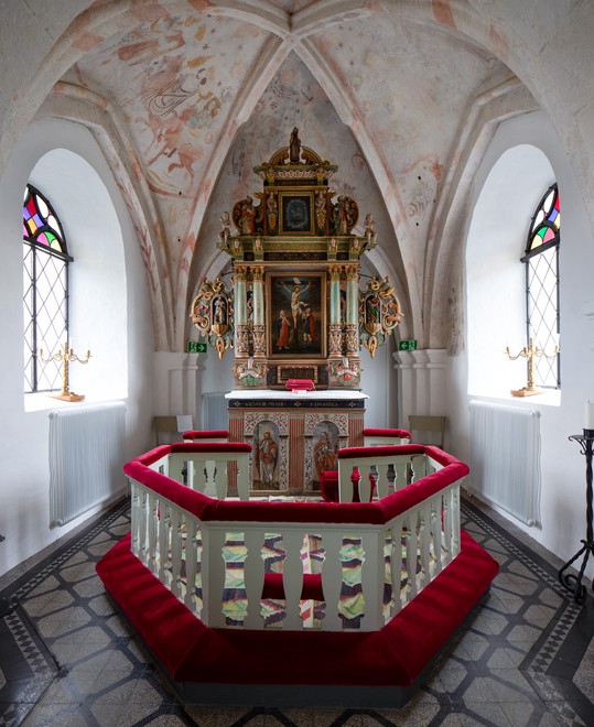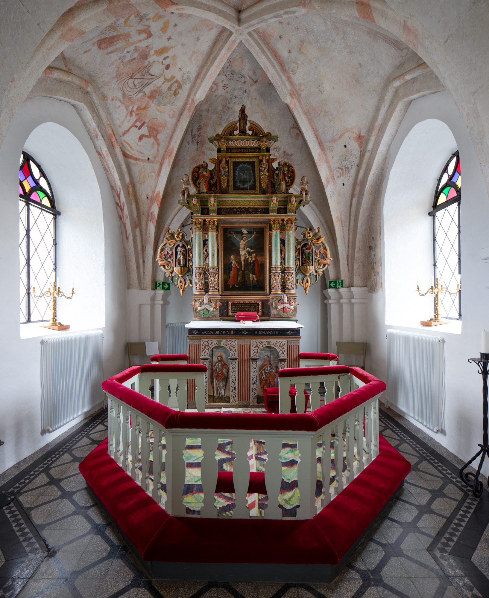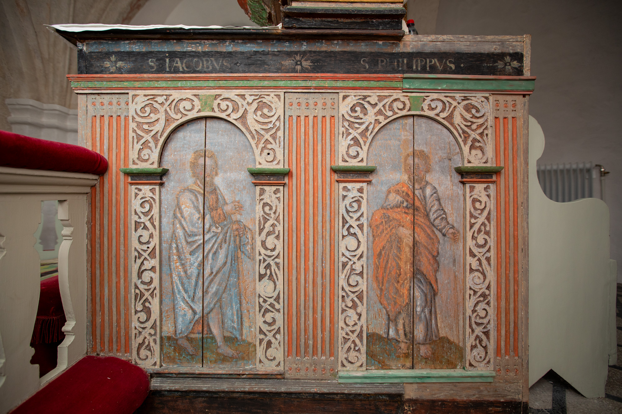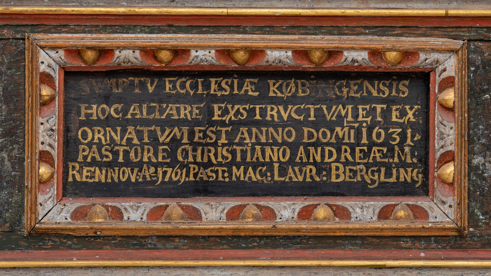 Sumptu ecclesiæ købingensis hoc altare exstructum et exornatum est anno Domini 1631. Pastore Christiane Andreæ. M. Rennov Ao. 1761 past. Mac. Lavr. Bergling.