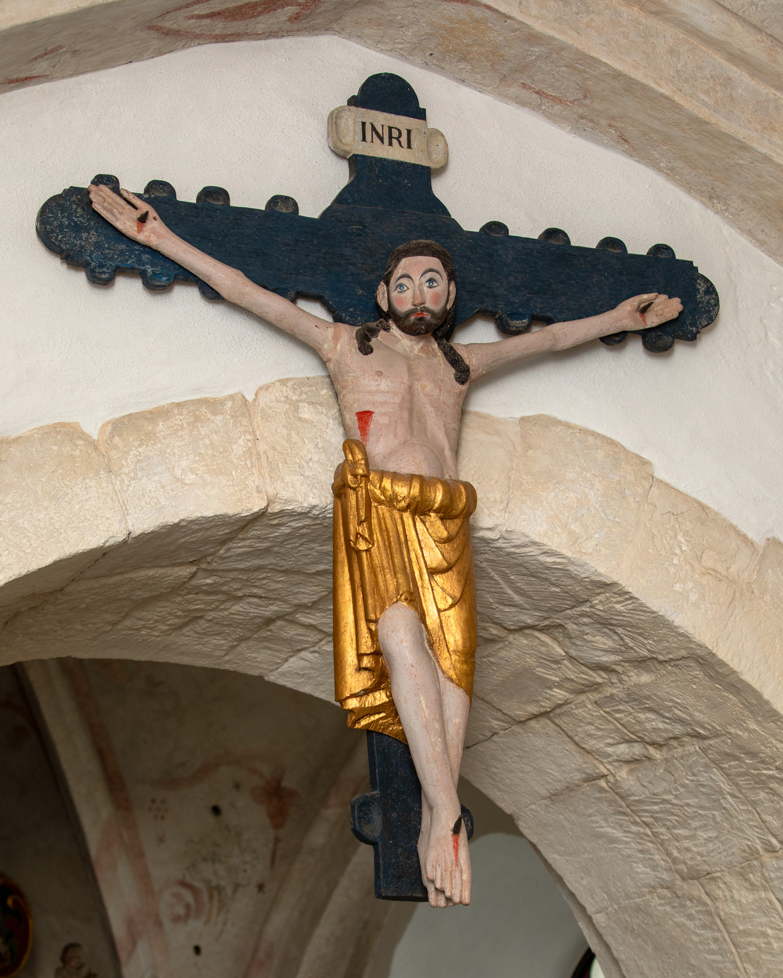 Hovedet er drejet lidt mod højre. På hovedet findes spor af en krone. Armene er udstrakt diagonalt med åbne hænder og udstrakte fingre. Lændeklædet har en kraftig vulst omkring livet med en stor knude i højre side og mange folder. Højre fod er lagt ind over venstre.