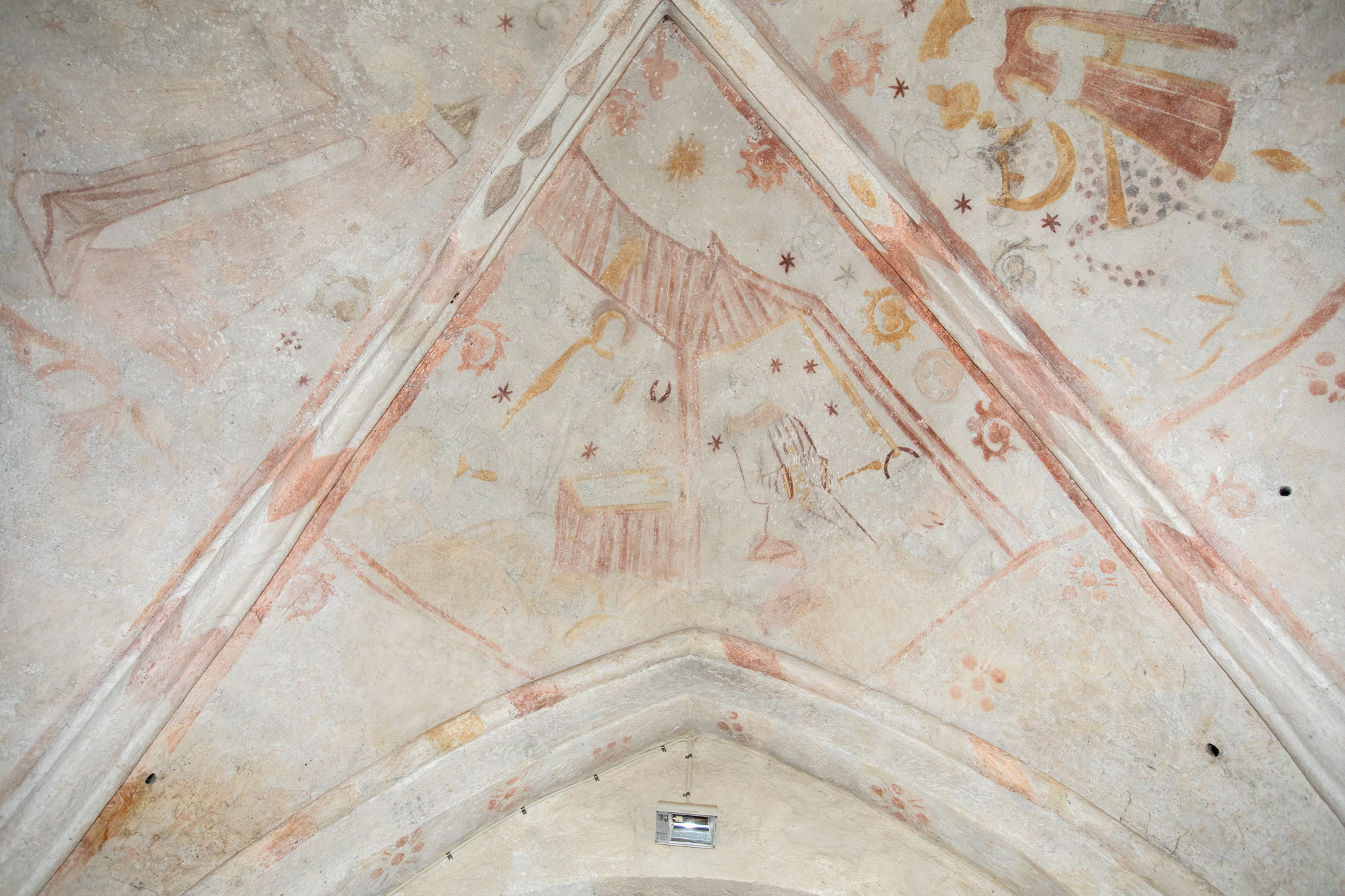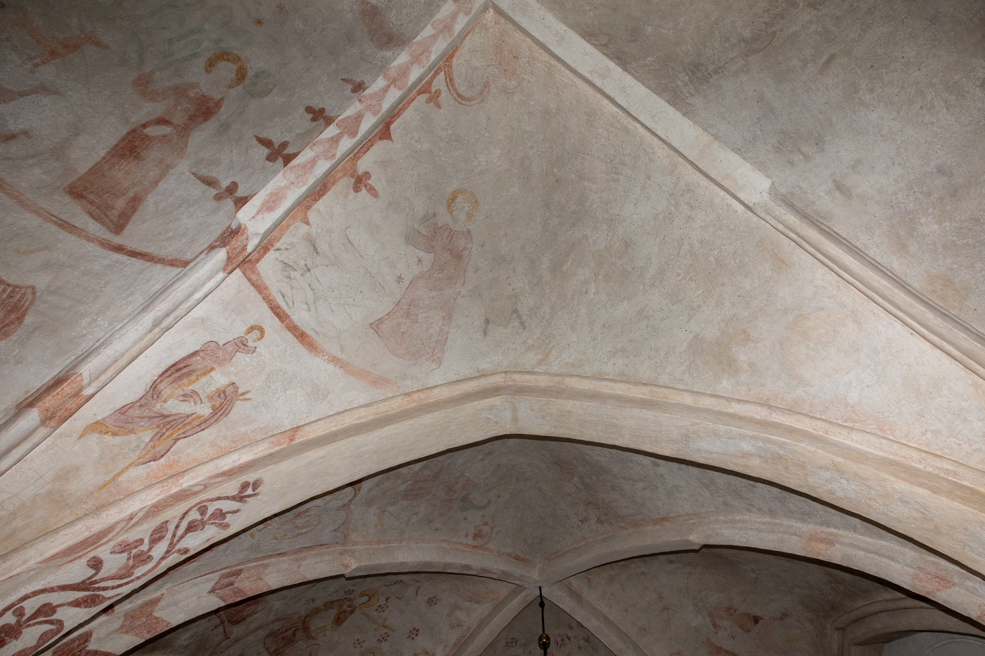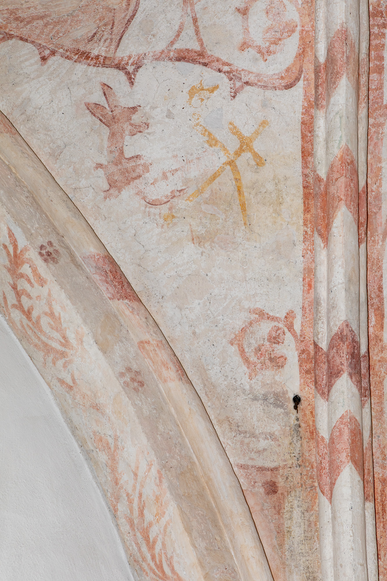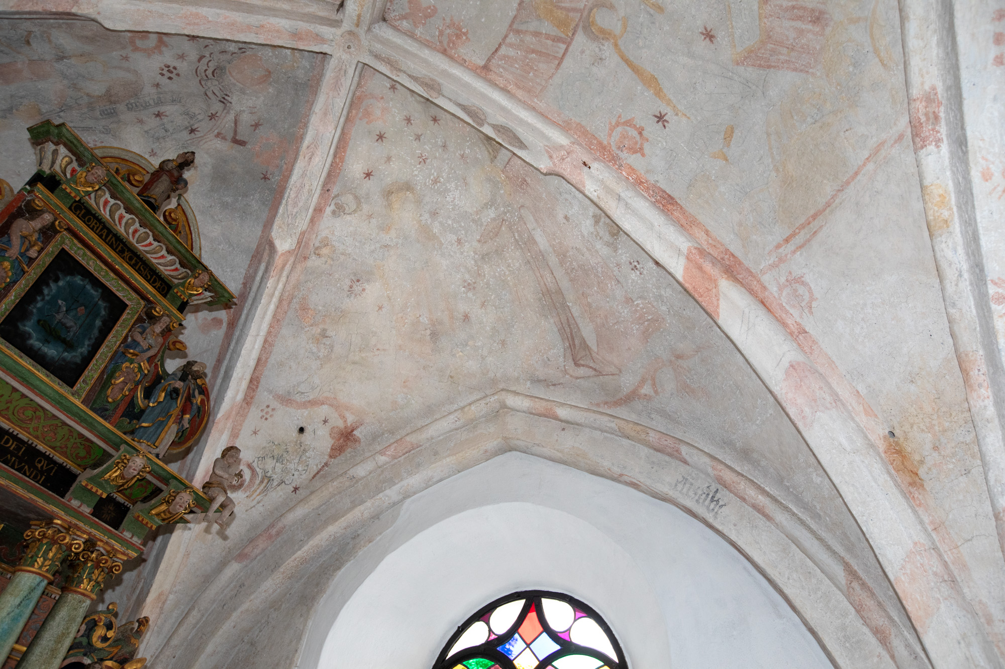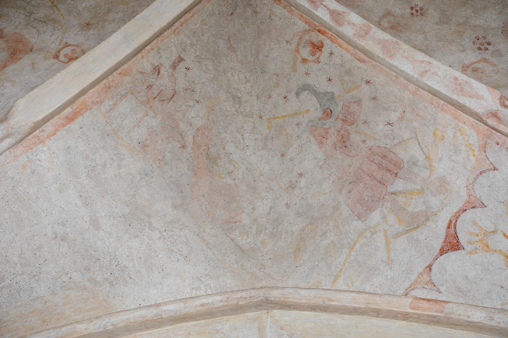 I sviklerne ses S. Gertrud med tårn og en udvisket fremstilling af S. Margareta.