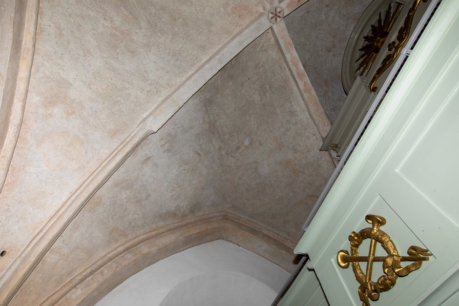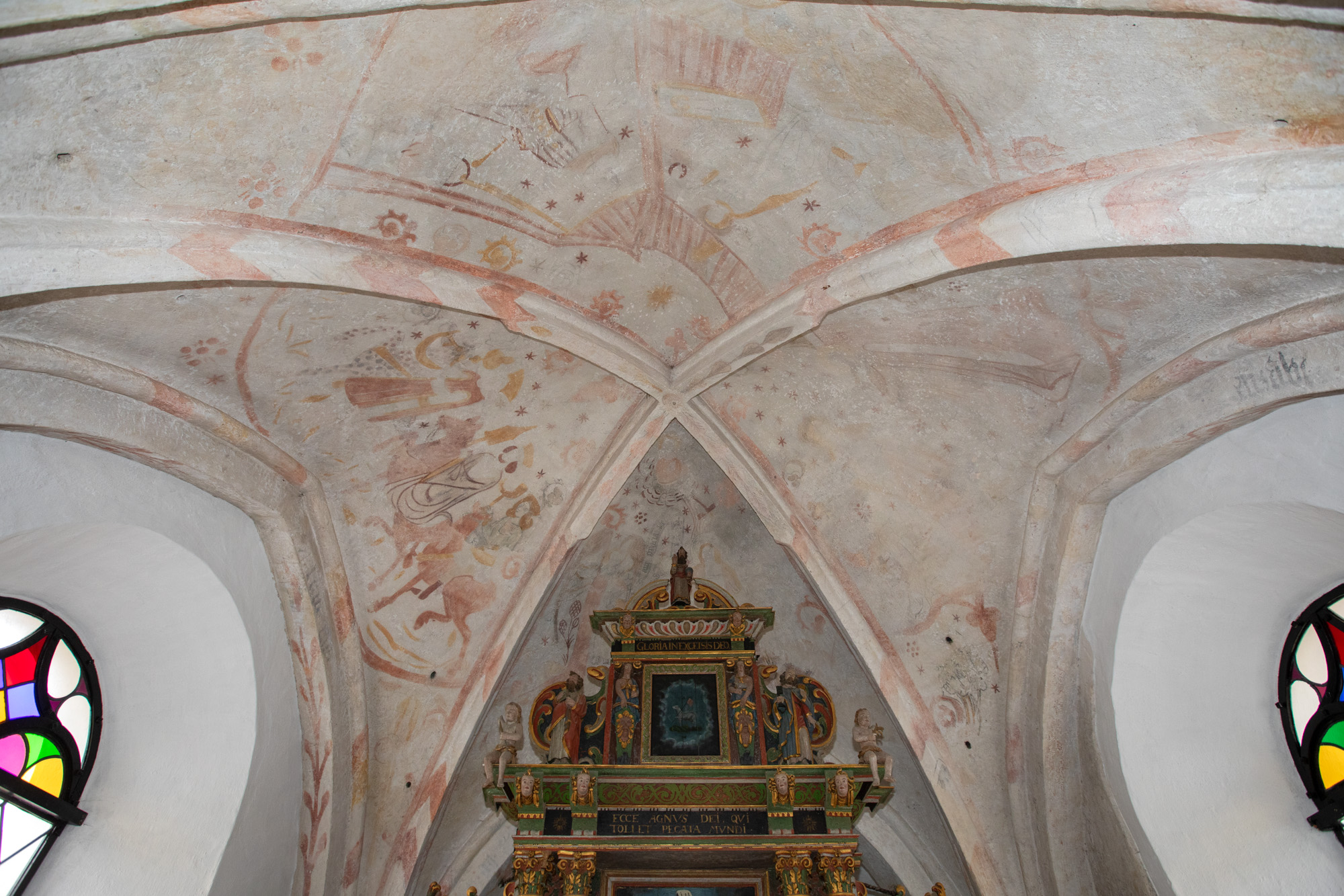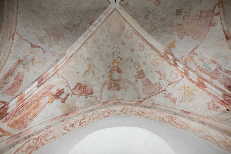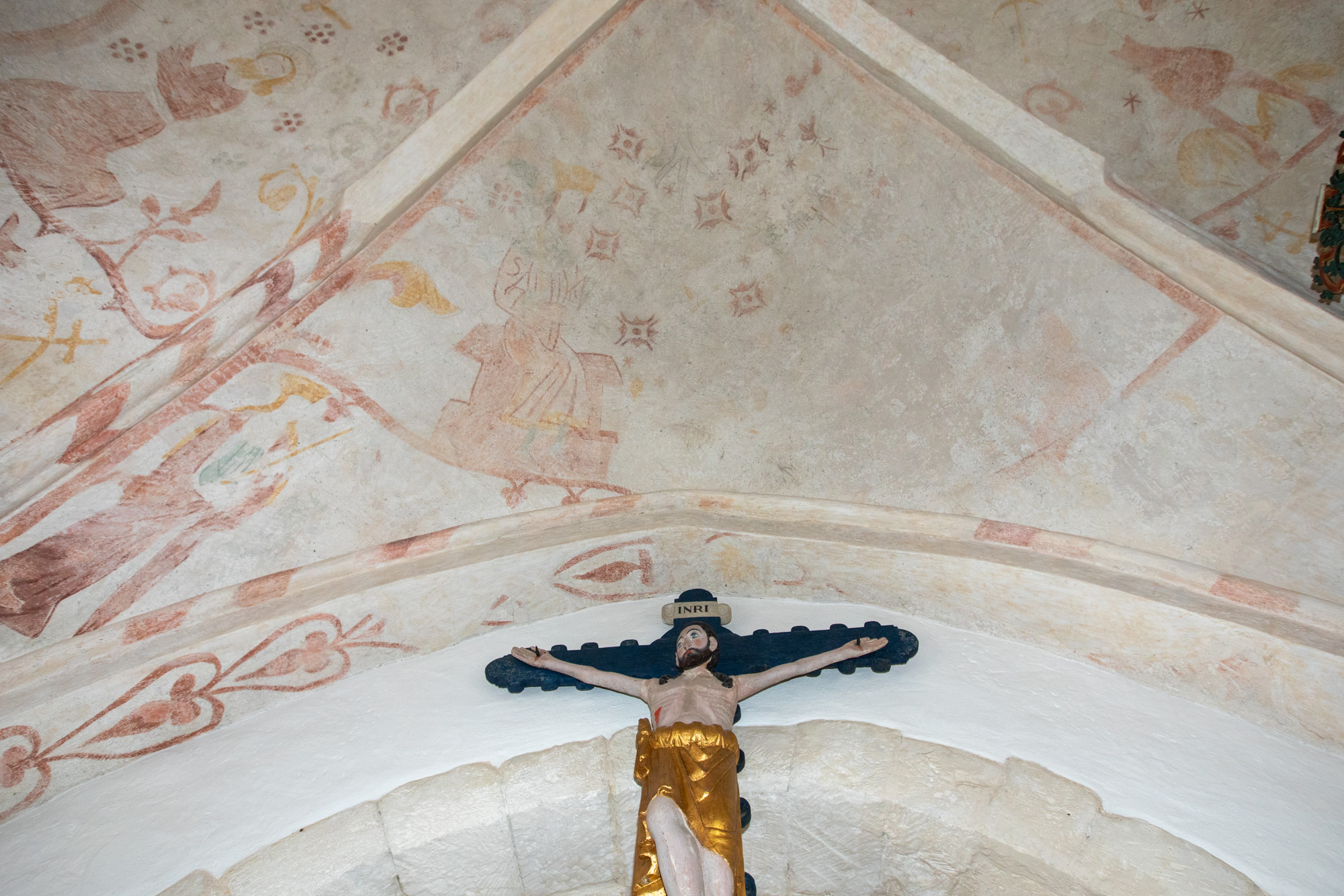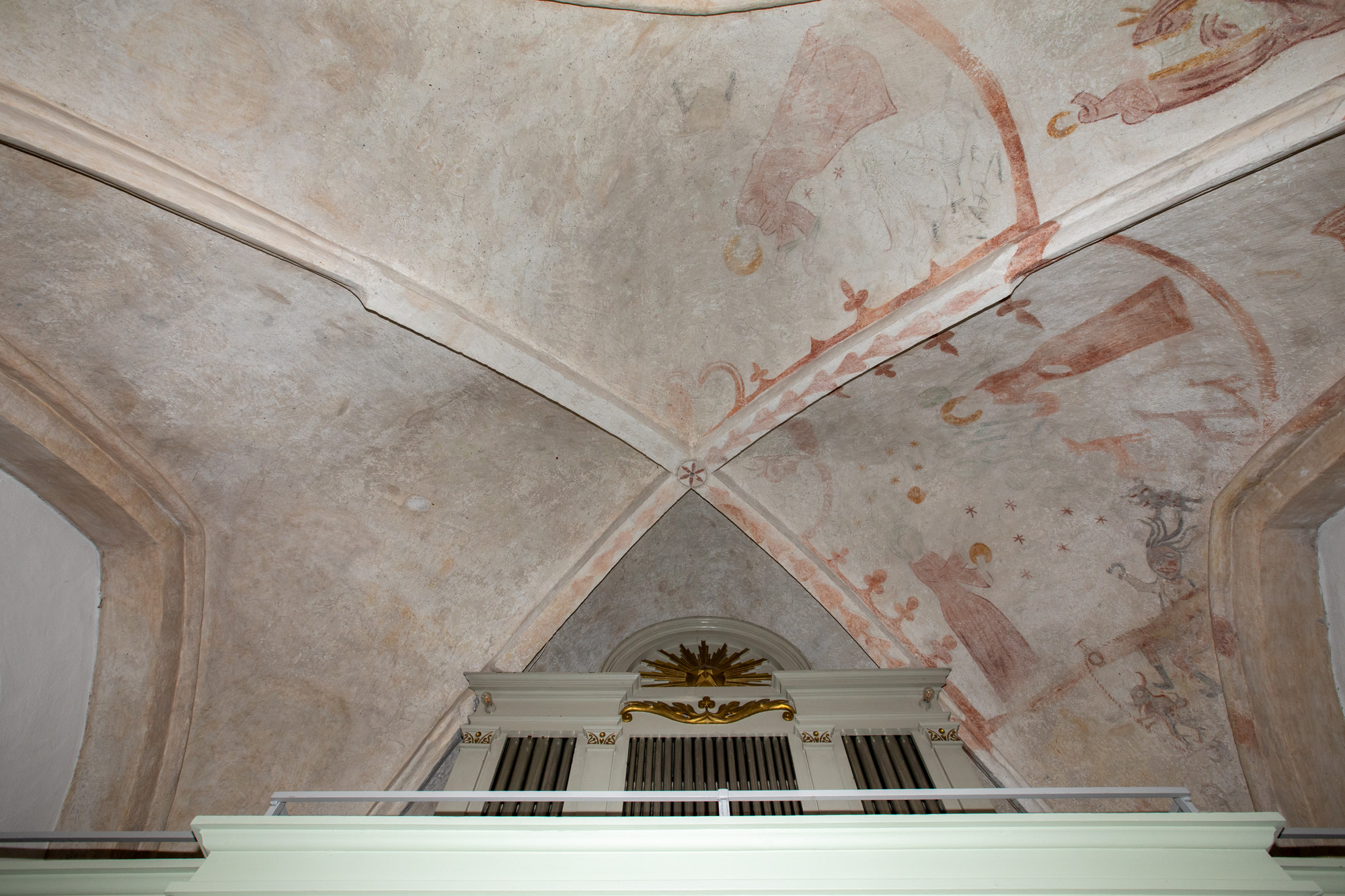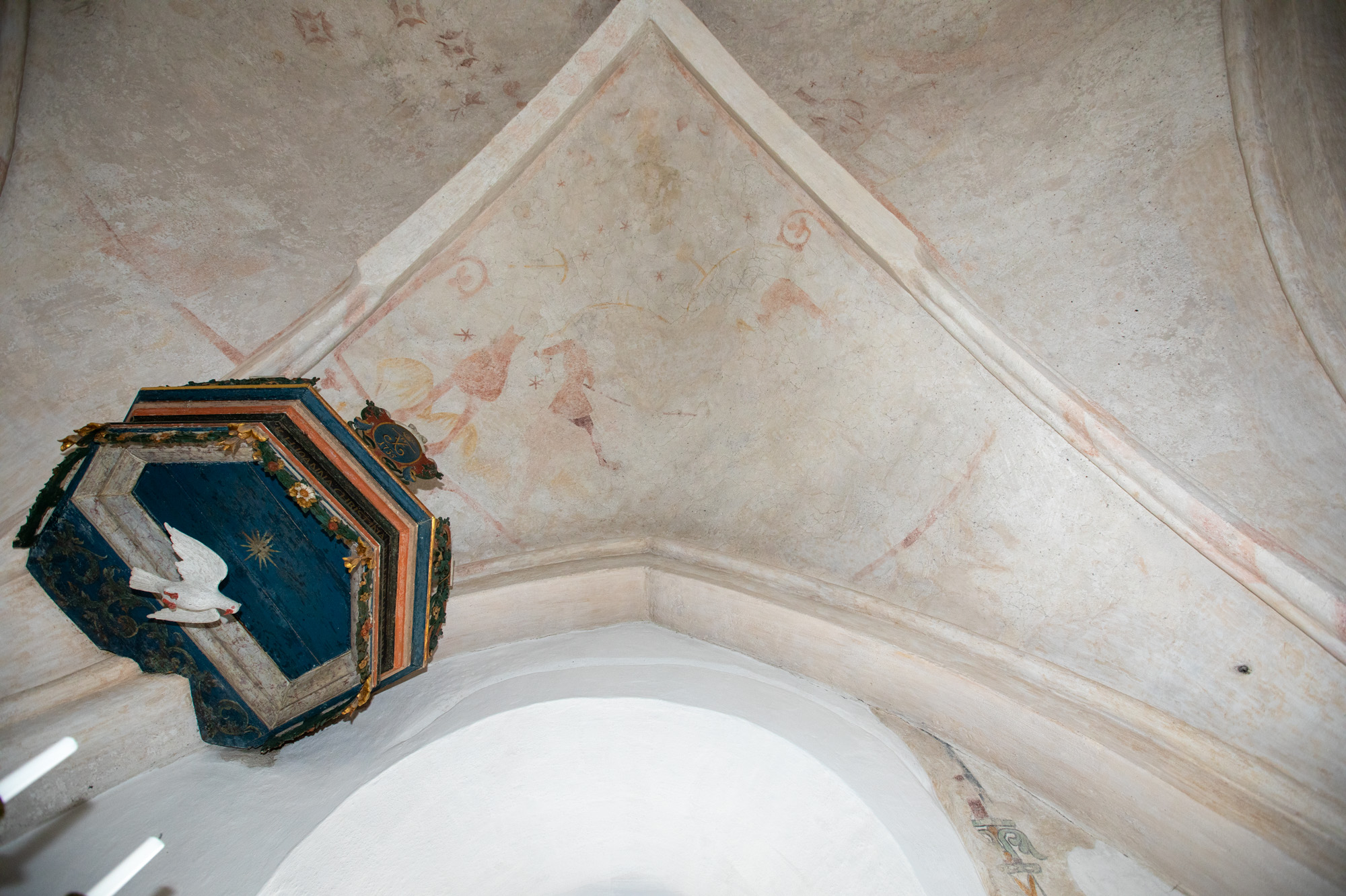 I sviklerne ses S. Gertrud med tårn og en udvisket fremstilling af S. Margareta.