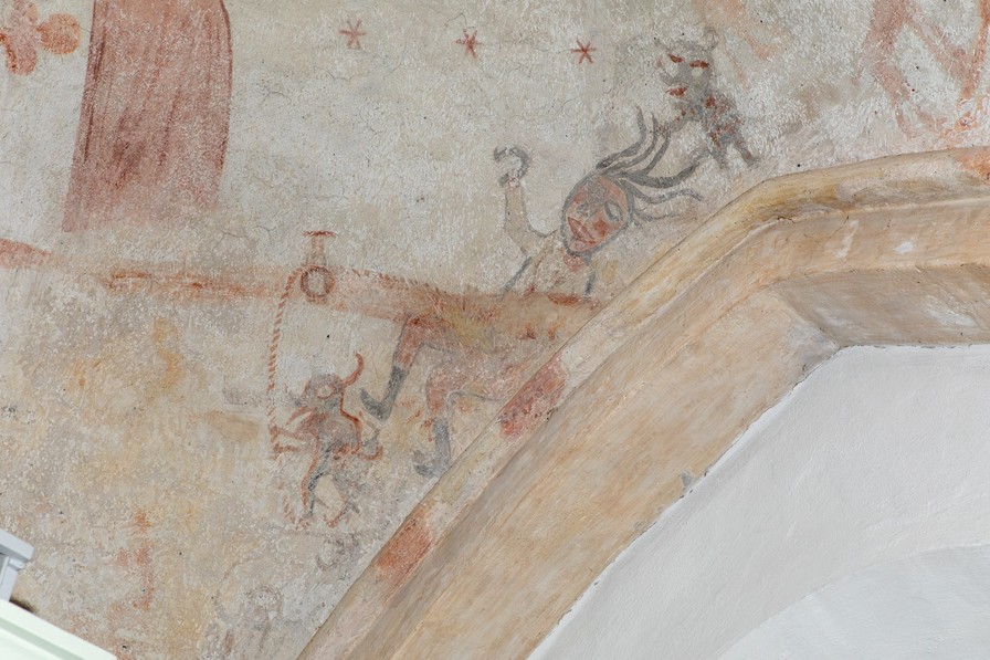 Nordkappe. Kvinde bliver tortureret af to små djævle. Den ene trækker hende i håret, mens den anden trækker i et reb, som er bundet til hende. Dette billede tilhører en anden periode end de øvrige. Det er dog uklart, om det er før eller efter.