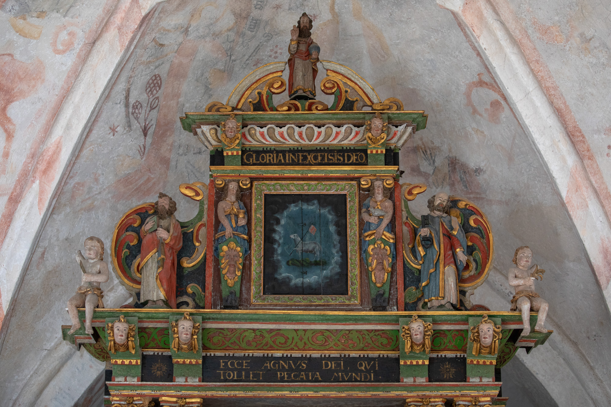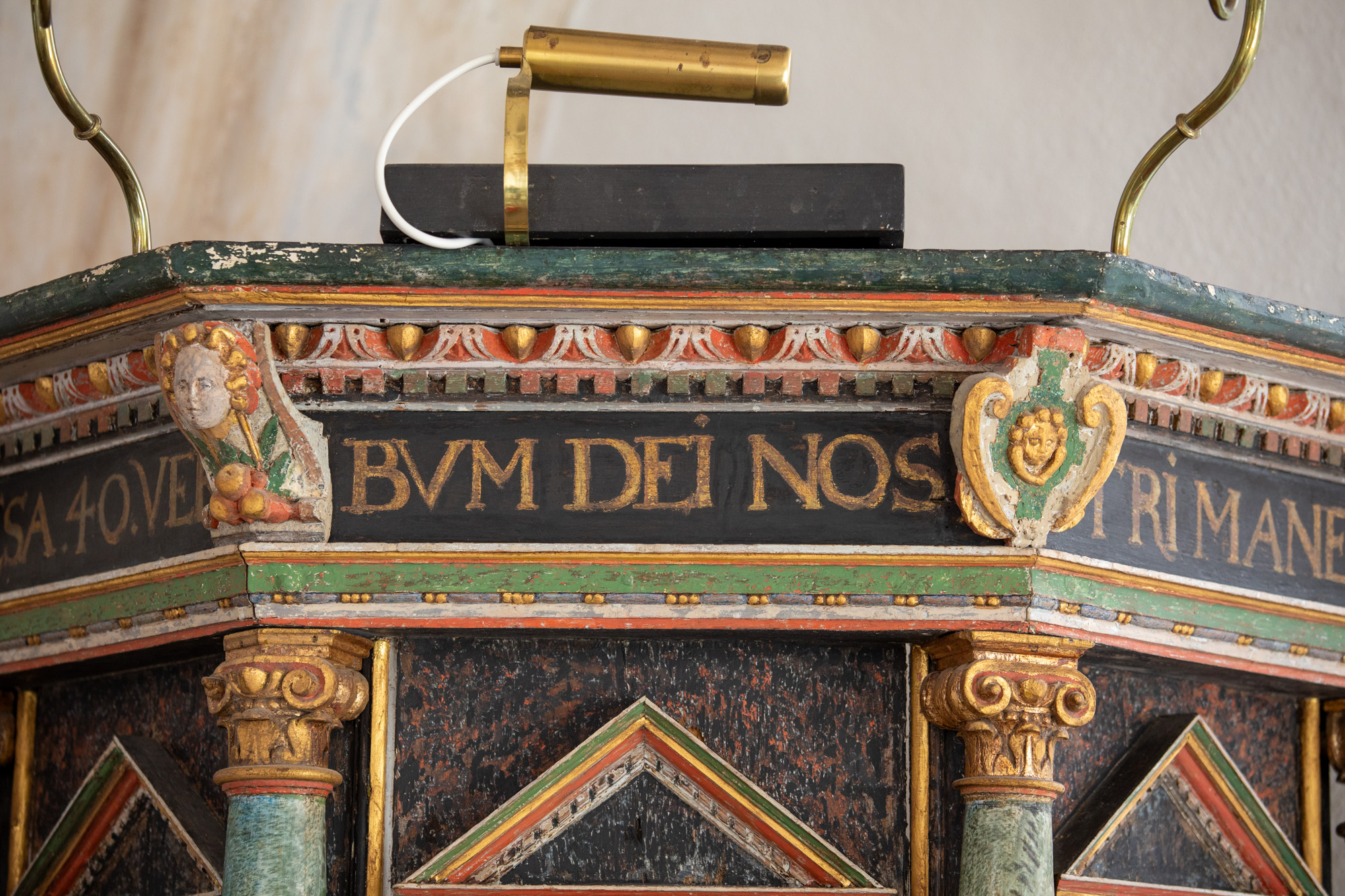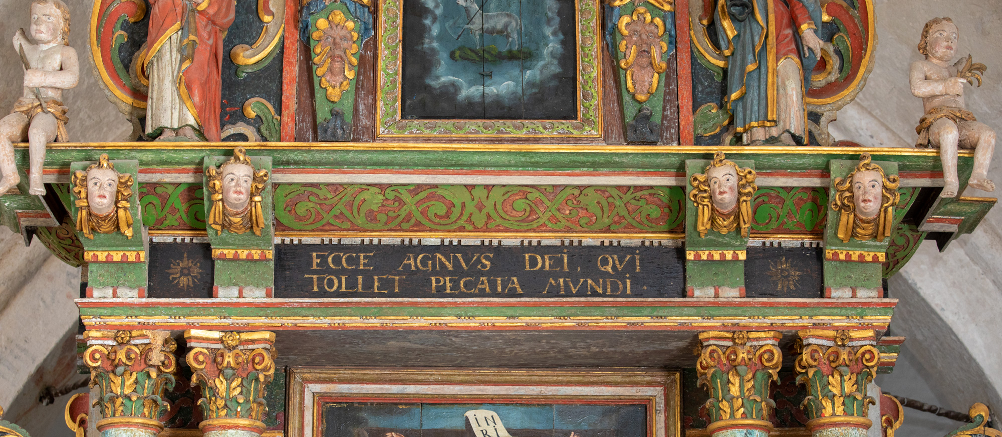 På arkitraven står der ”Ecce agnus dei, qvi tollet pecata mundi.” (Se det Guds Lam, som bærer verdens synder). På hver ende af arkitraven sidder en putto.