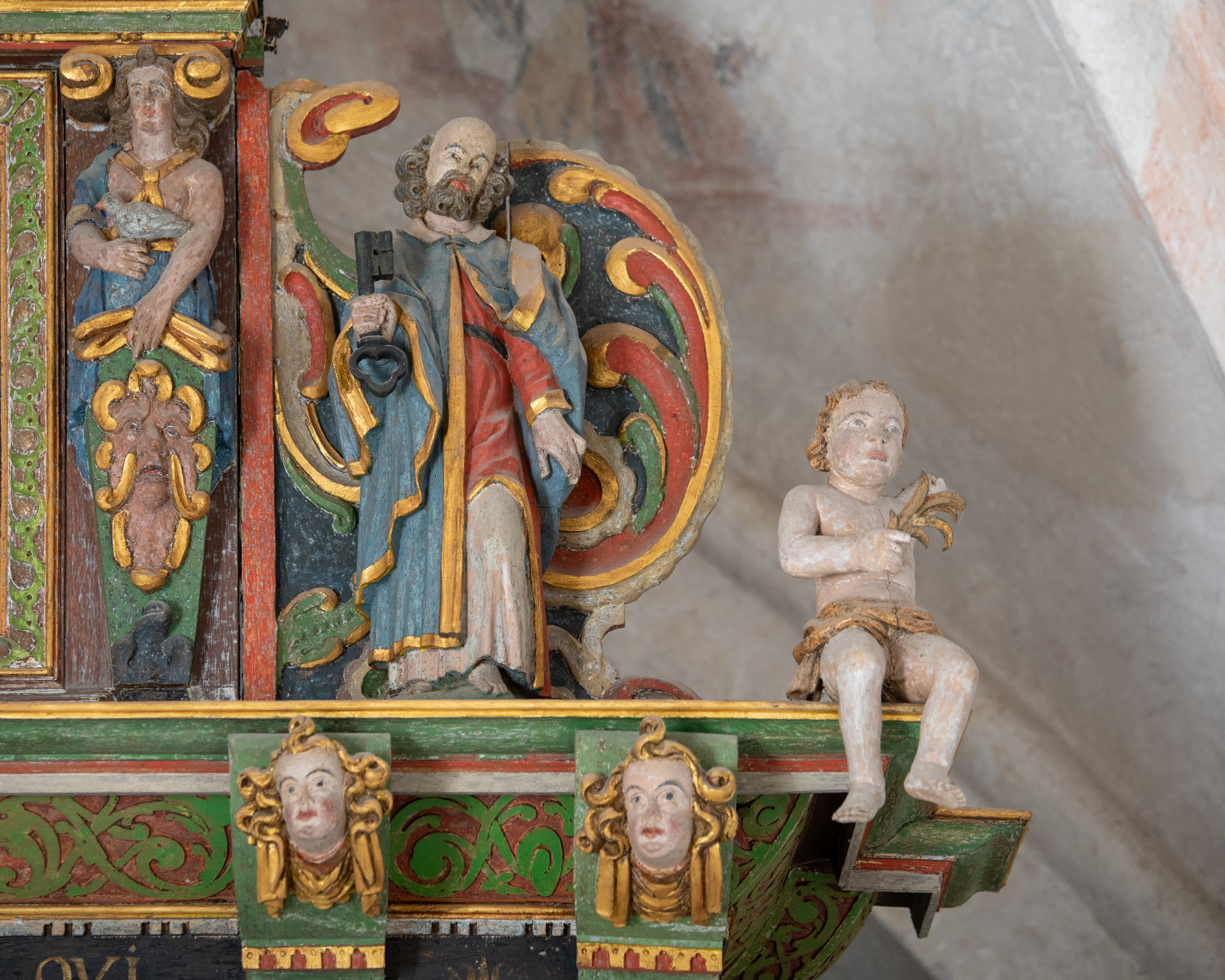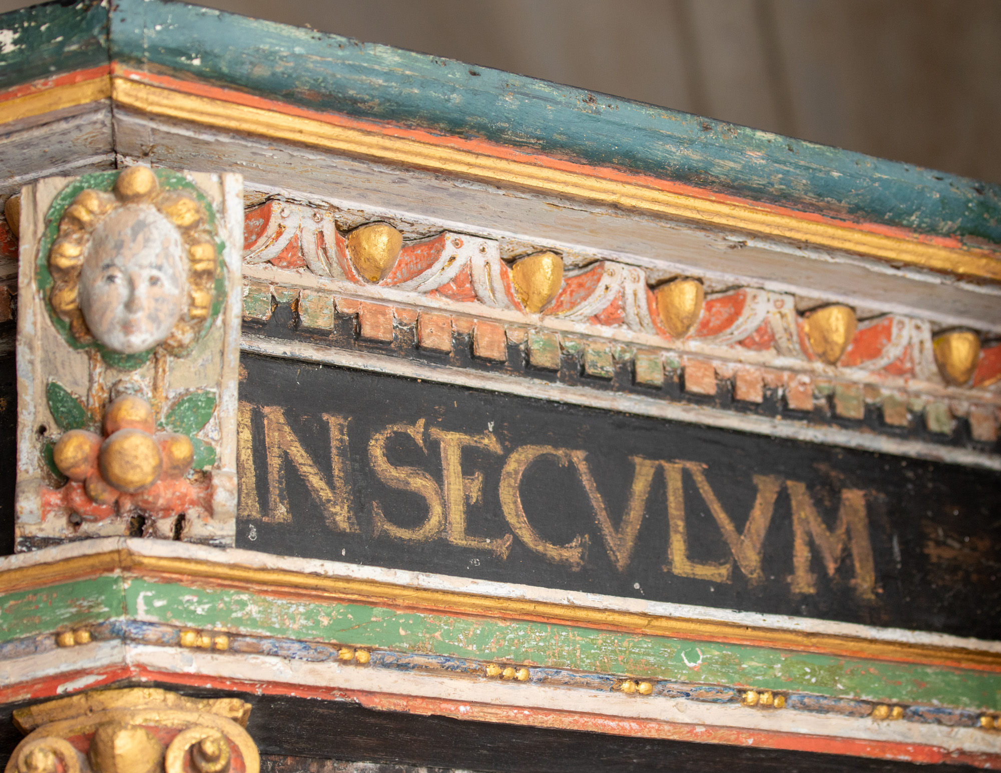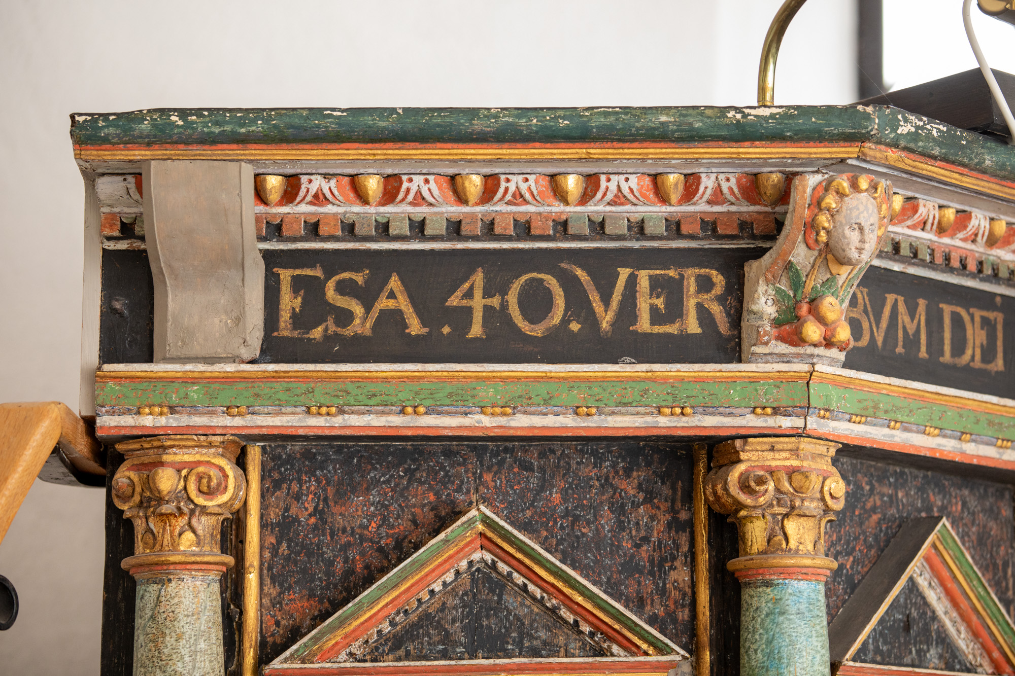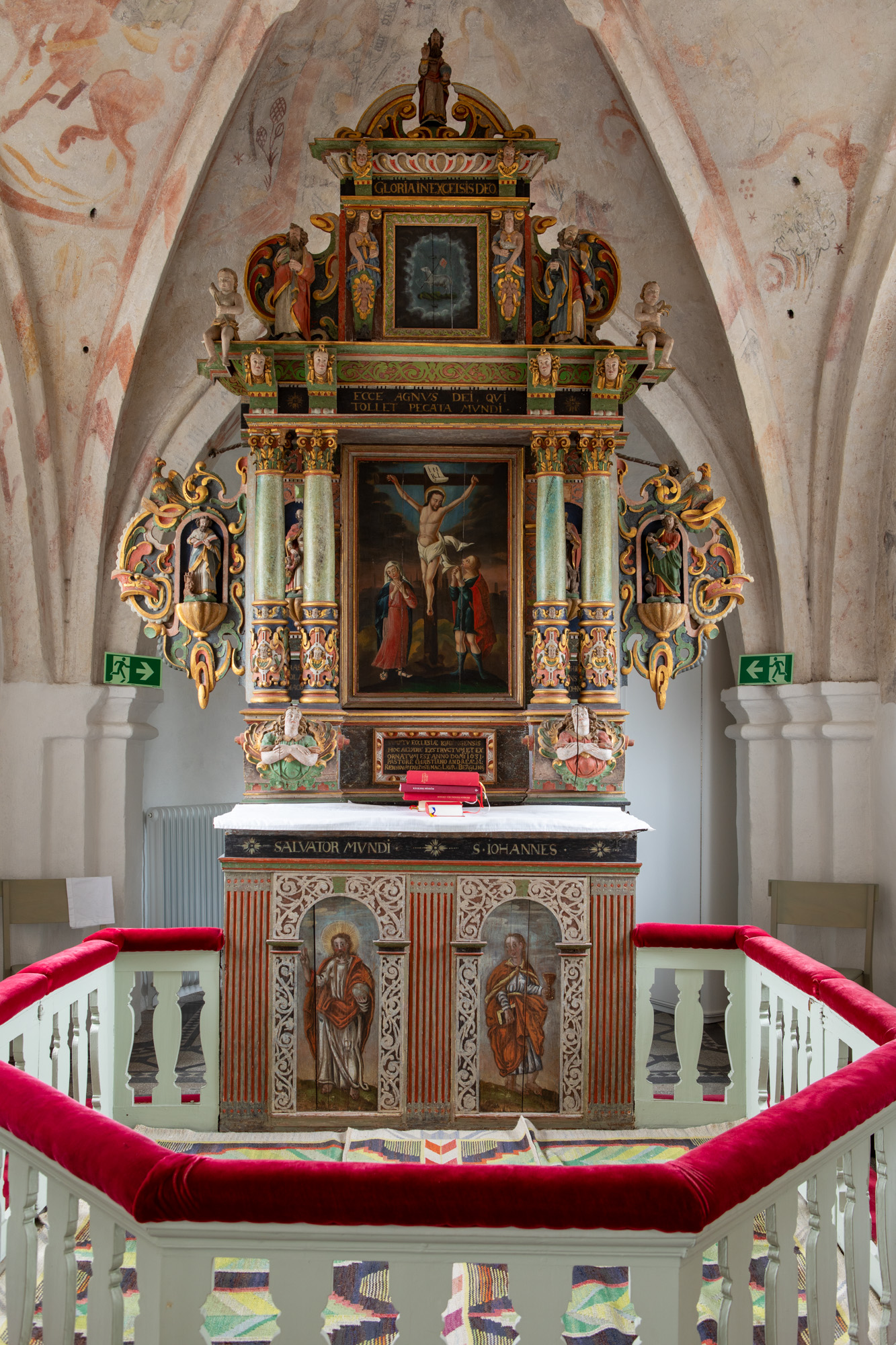 På arkitraven står der ”Ecce agnus dei, qvi tollet pecata mundi.” (Se det Guds Lam, som bærer verdens synder). På hver ende af arkitraven sidder en putto.