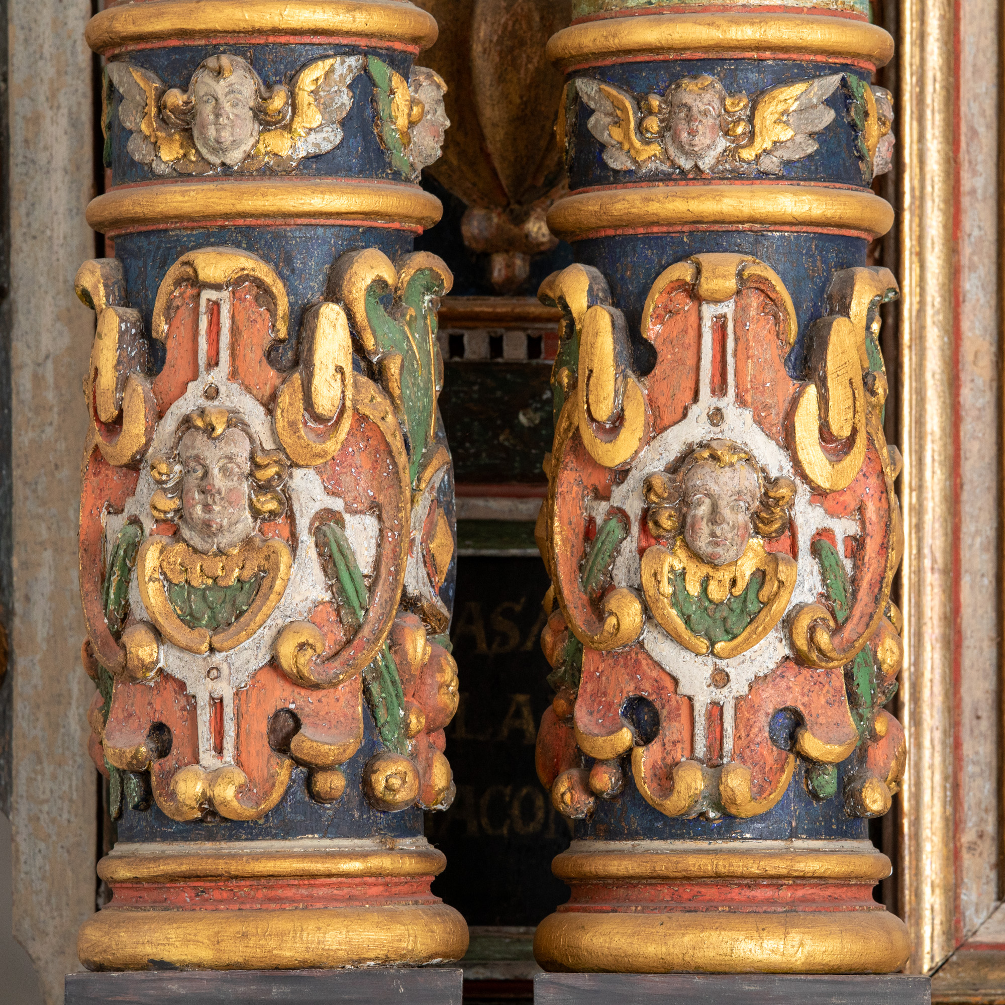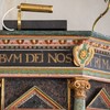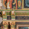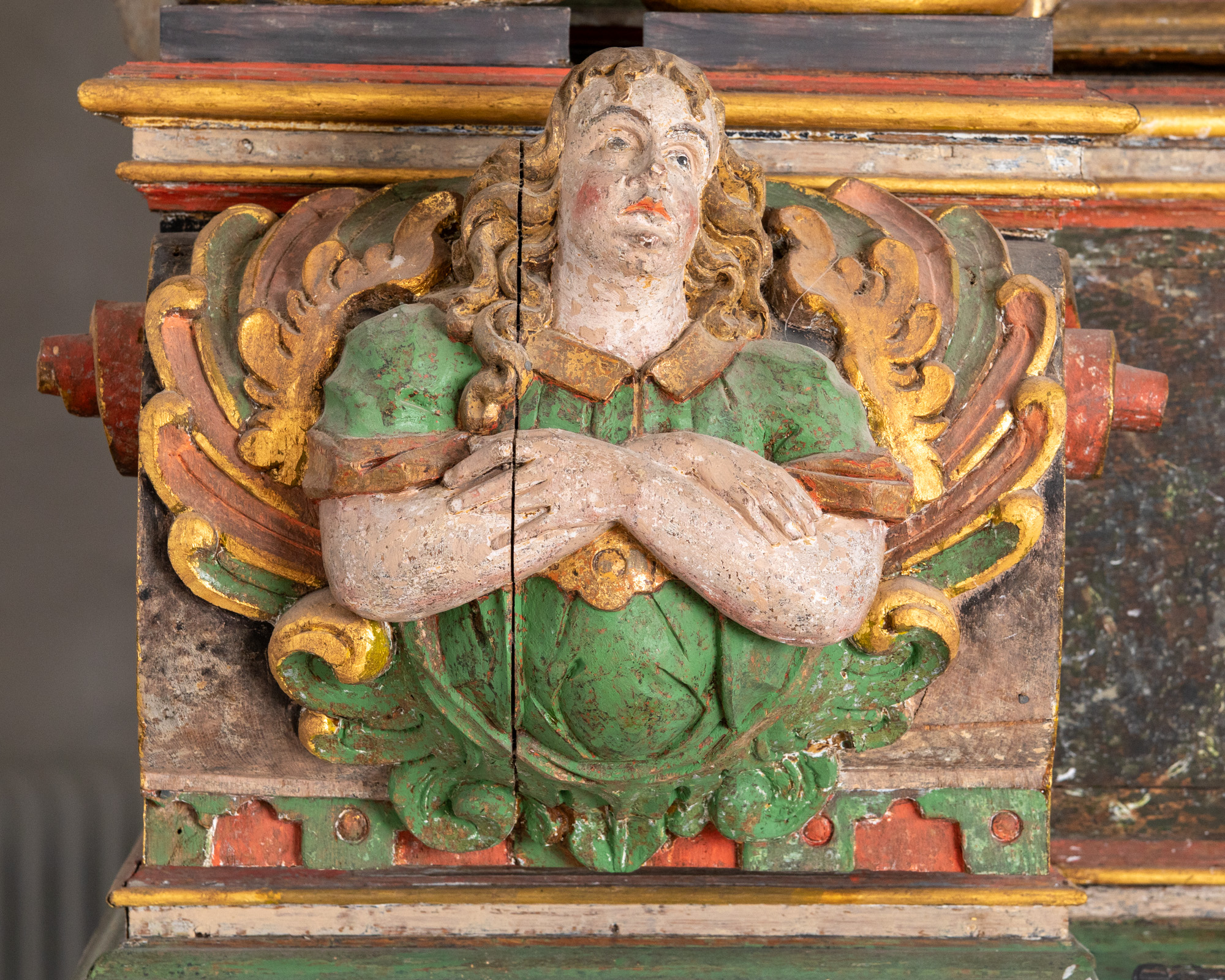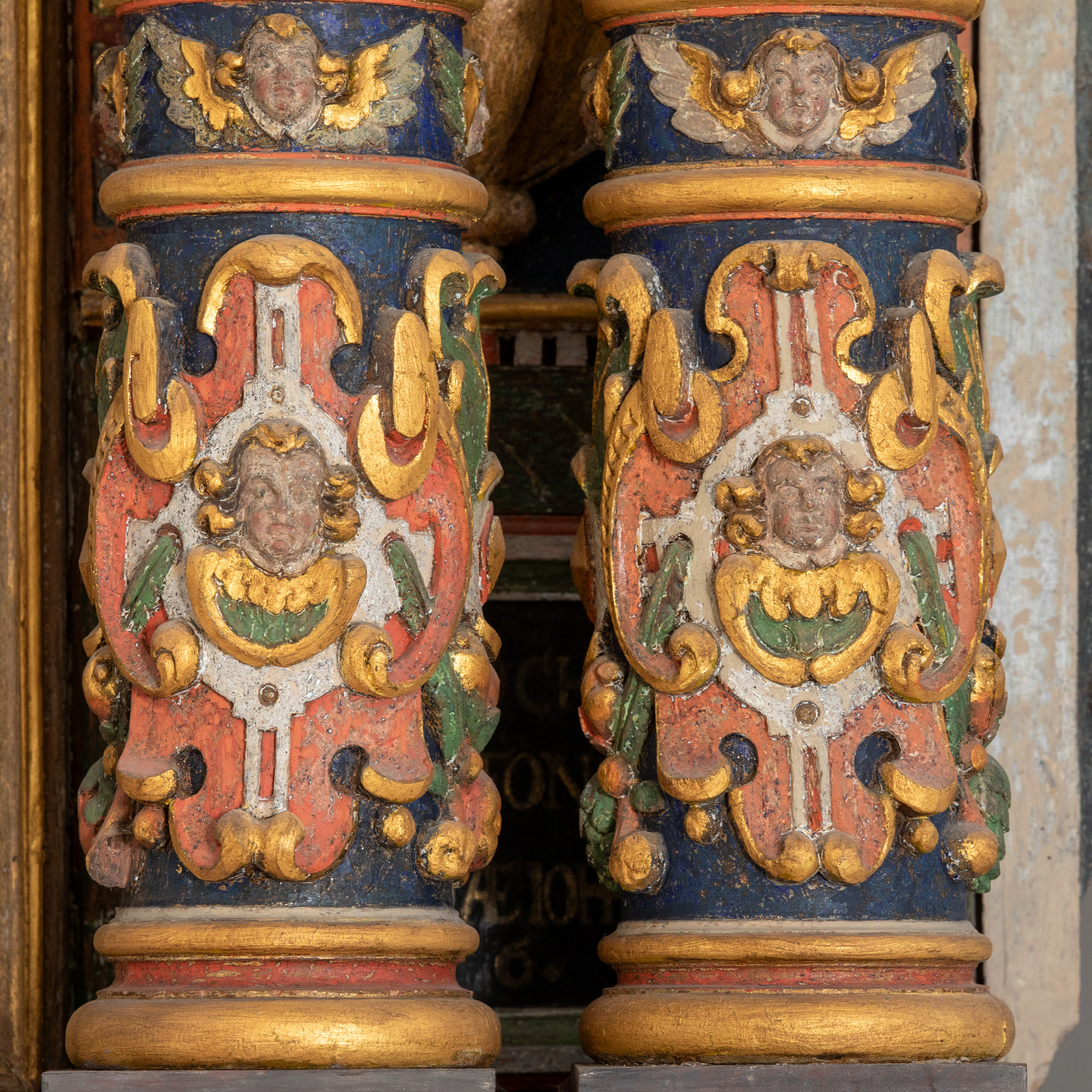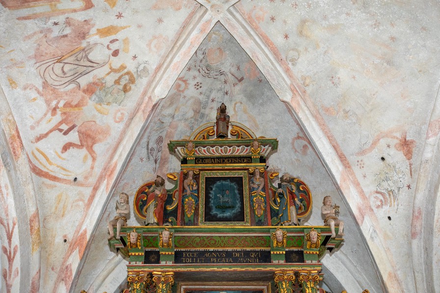 På arkitraven står der ”Ecce agnus dei, qvi tollet pecata mundi.” (Se det Guds Lam, som bærer verdens synder). På hver ende af arkitraven sidder en putto.