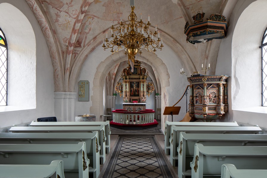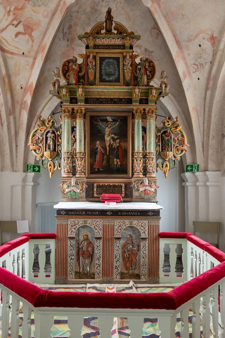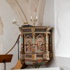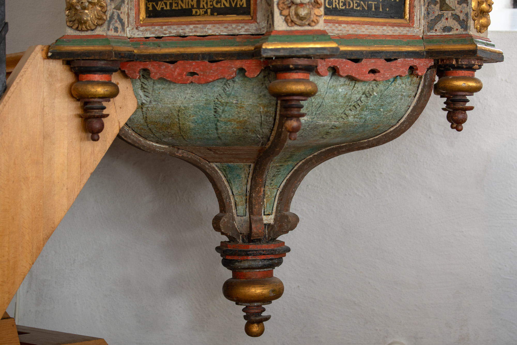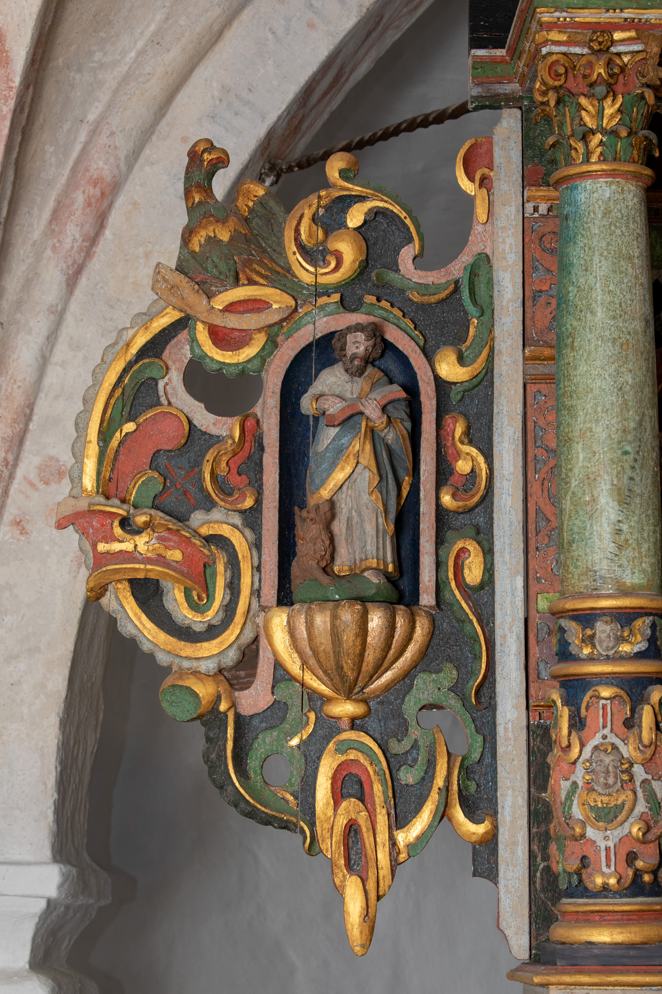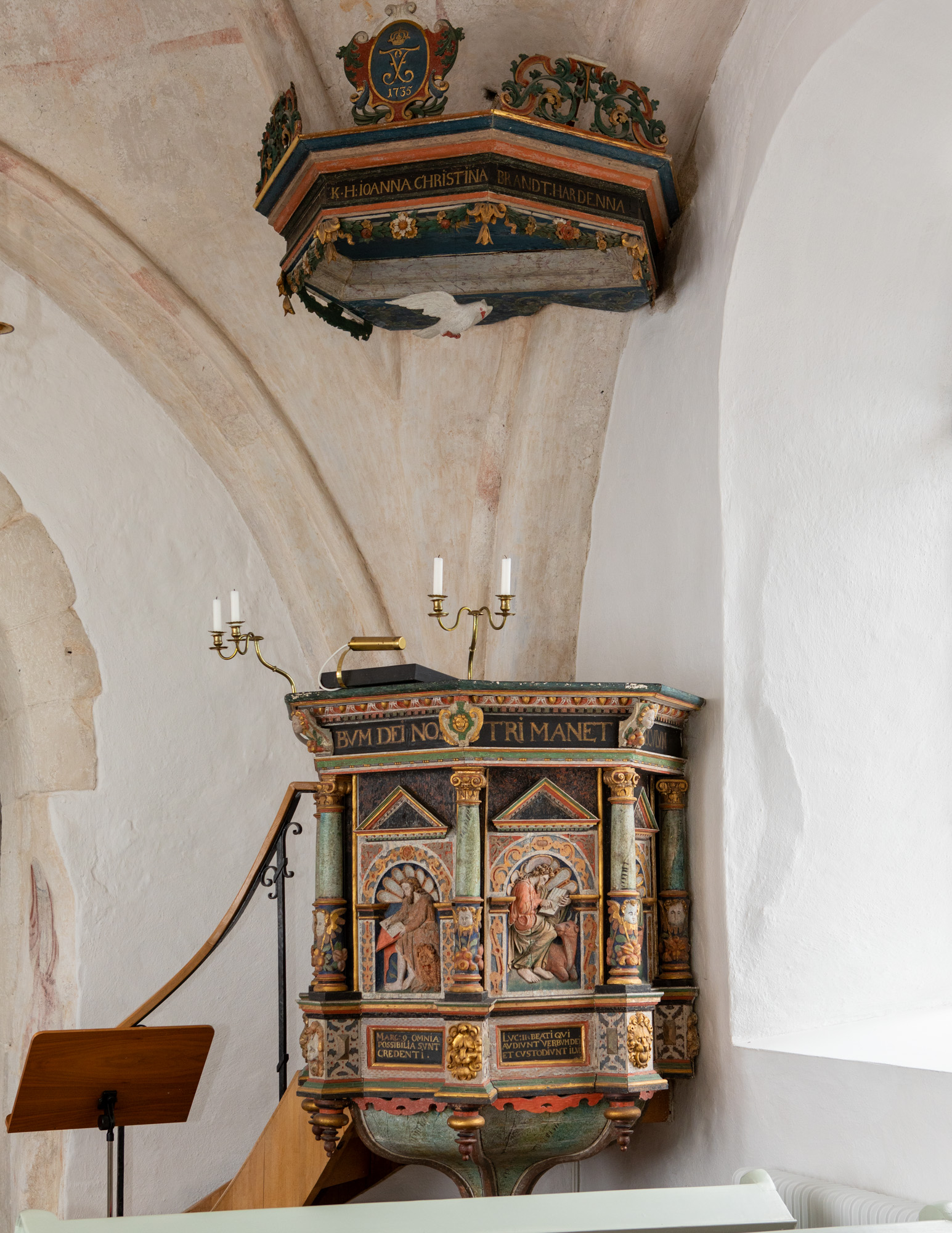 Prædikestolen menes at være samtidig med altertavlen, der er fra 1631, mens lydhimlen er fra 1735. De oprindelige farver blev fremdraget ved en restaurering i 1960’erne.