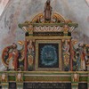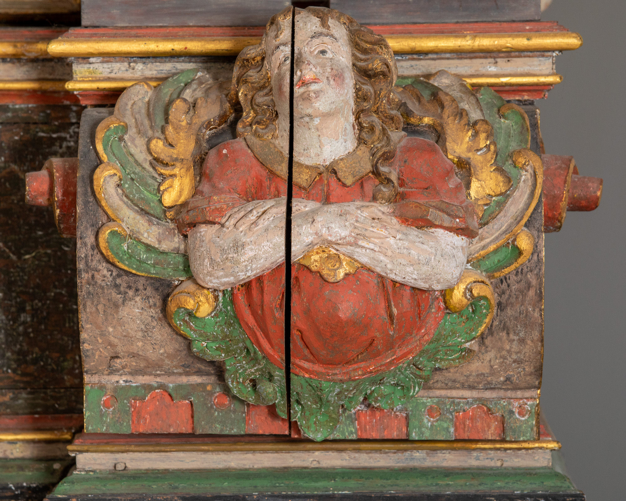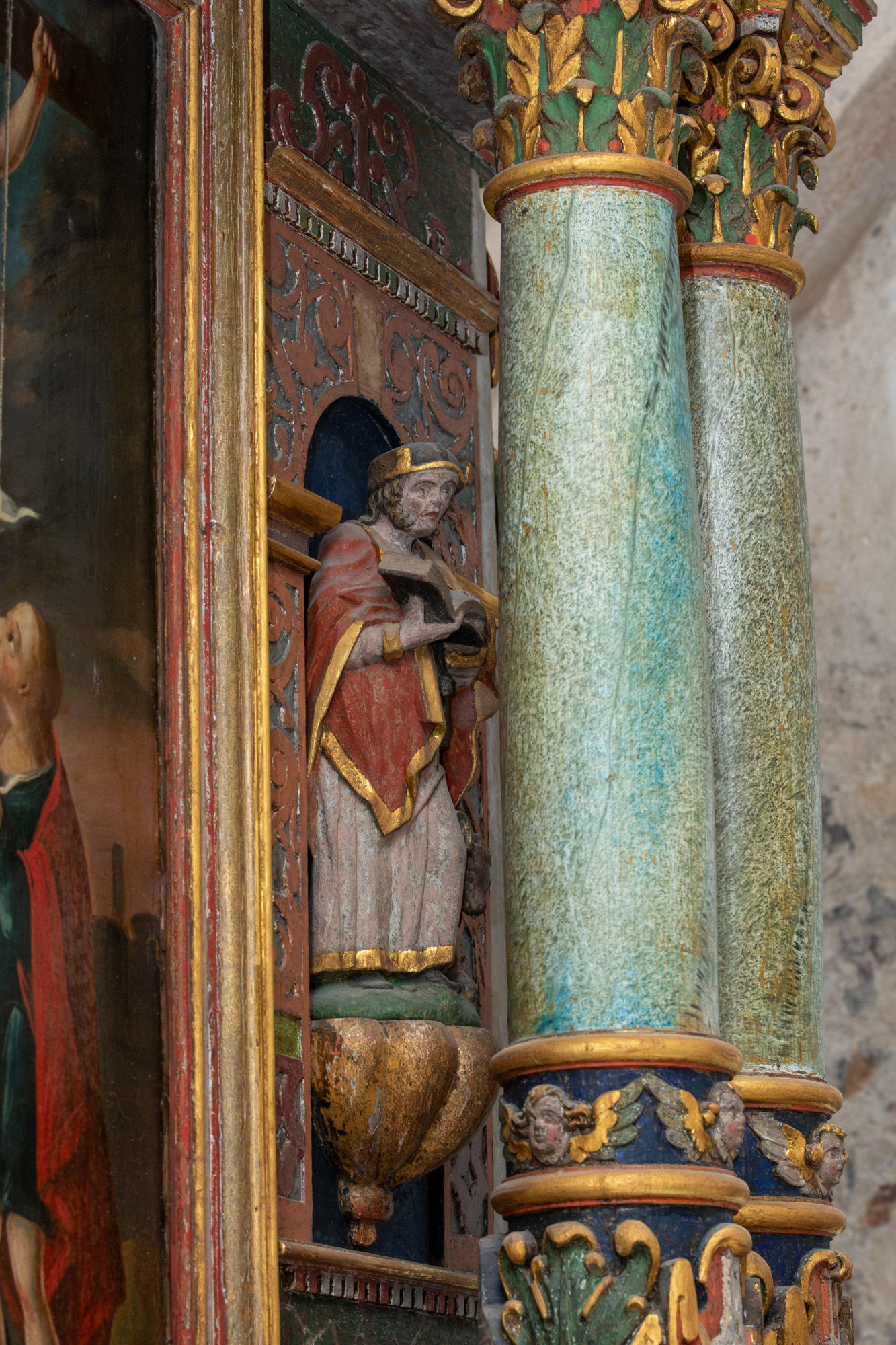 Billedet på topstykket viser Gudslammet med sejrsfane. Det er flankeret af to dyder, som igen er flankeret af Paulus og Peter. Øverst står den opstandne.