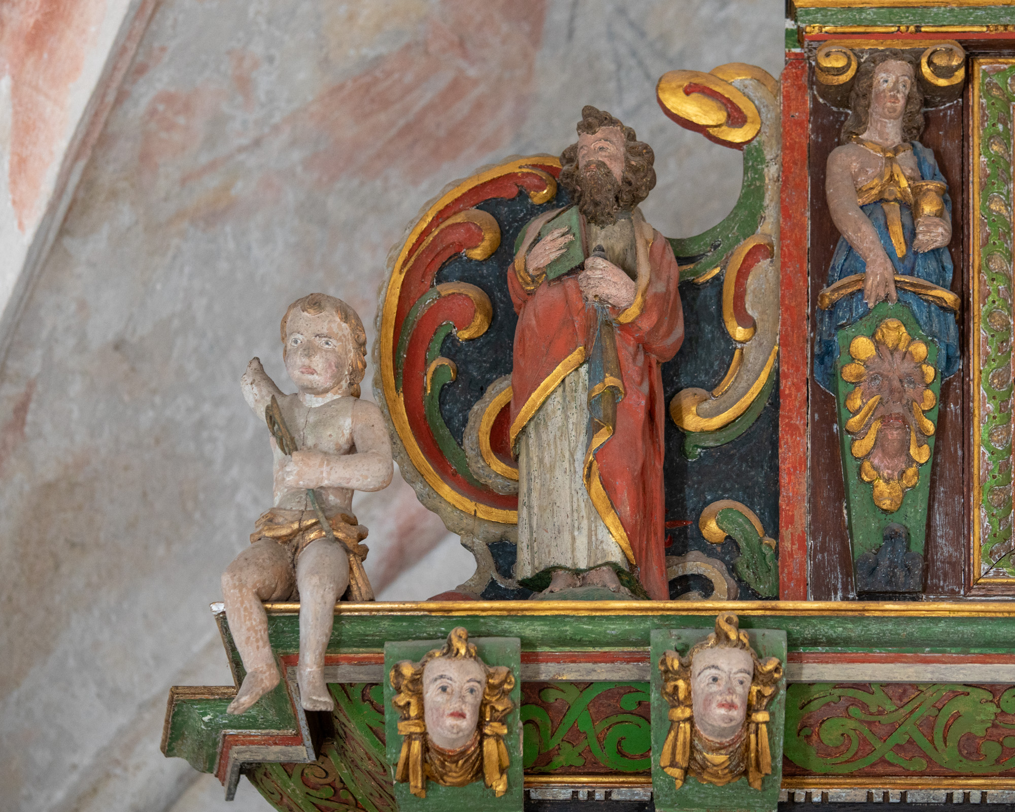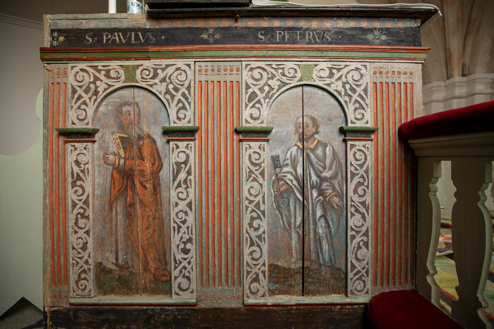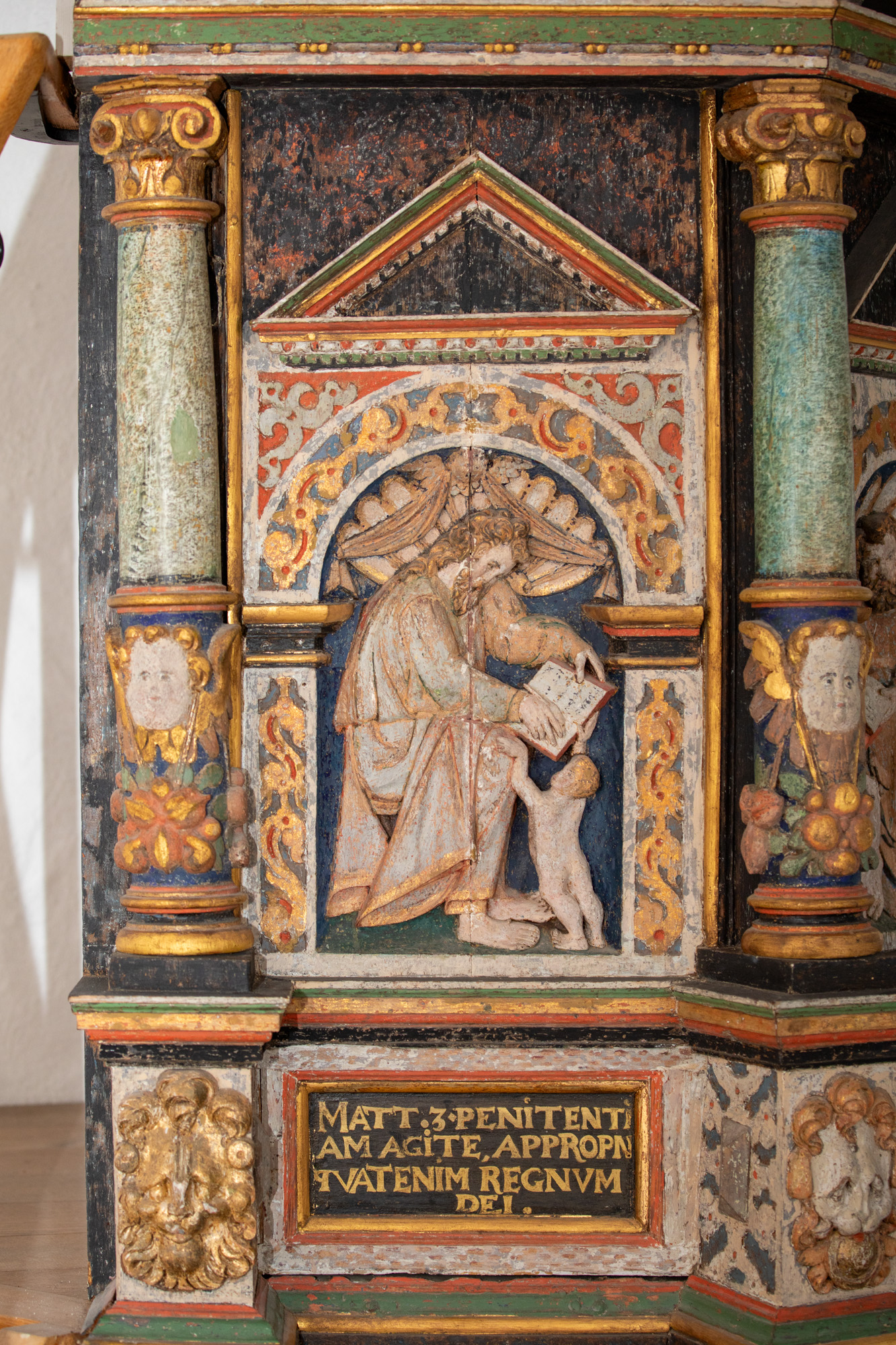 Storfelterne har fremstillinger af evangelisterne. Der er kun få prædikestole, hvor de som her ses siddende arbejdende ved et skrivebord. De er indrammet af et rundbuefelt, hvorover der er anbragt et gavlstykke. Pilastre og rundbuer er udsmykket med ranker, som har en efterglans af beslagornamentikken. Det kan siges om udsmykningerne i sviklerne. Søjlerne er fritstående med kapitæler og prydbælter. De står på konsoller med løver.