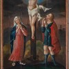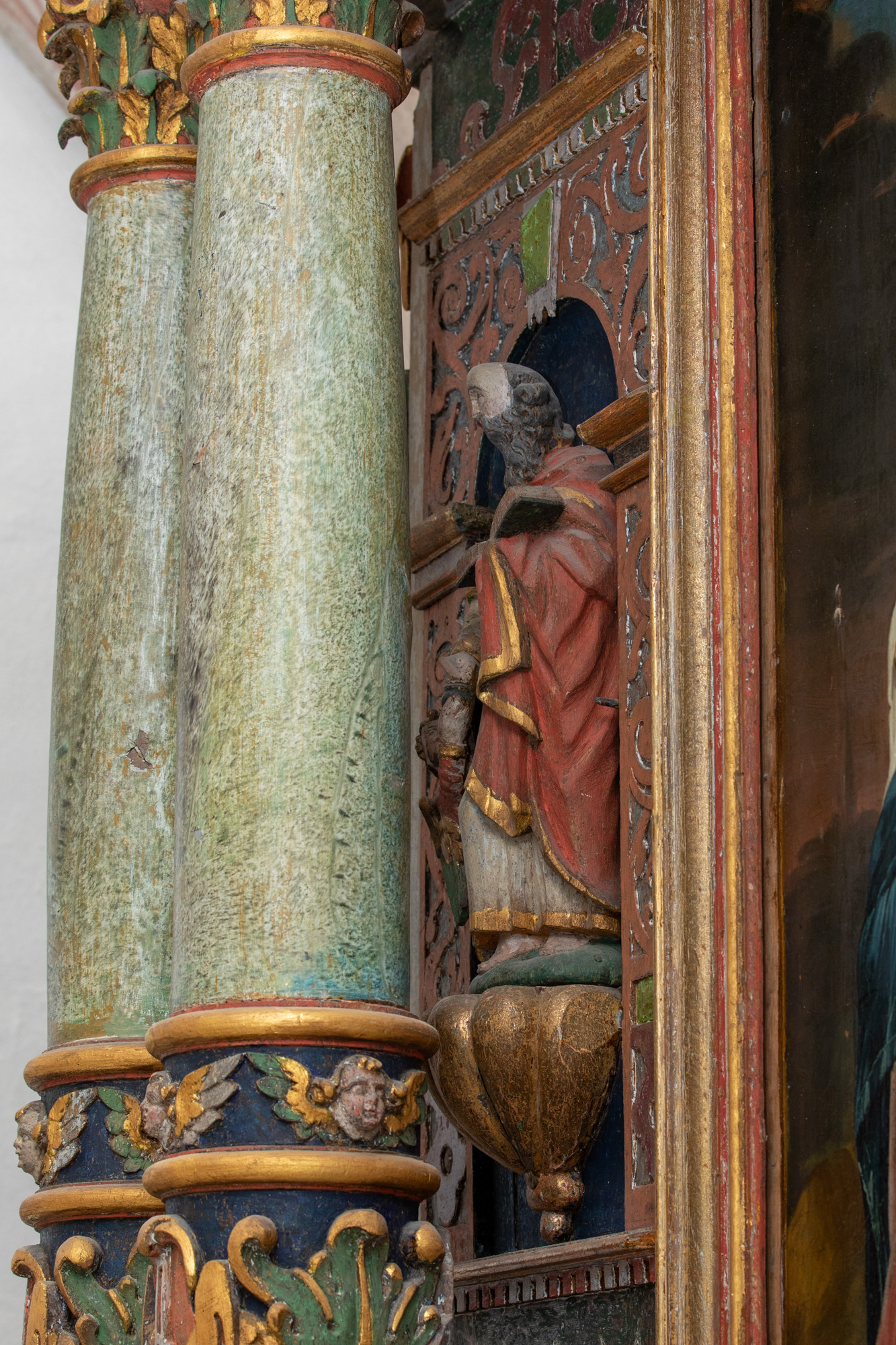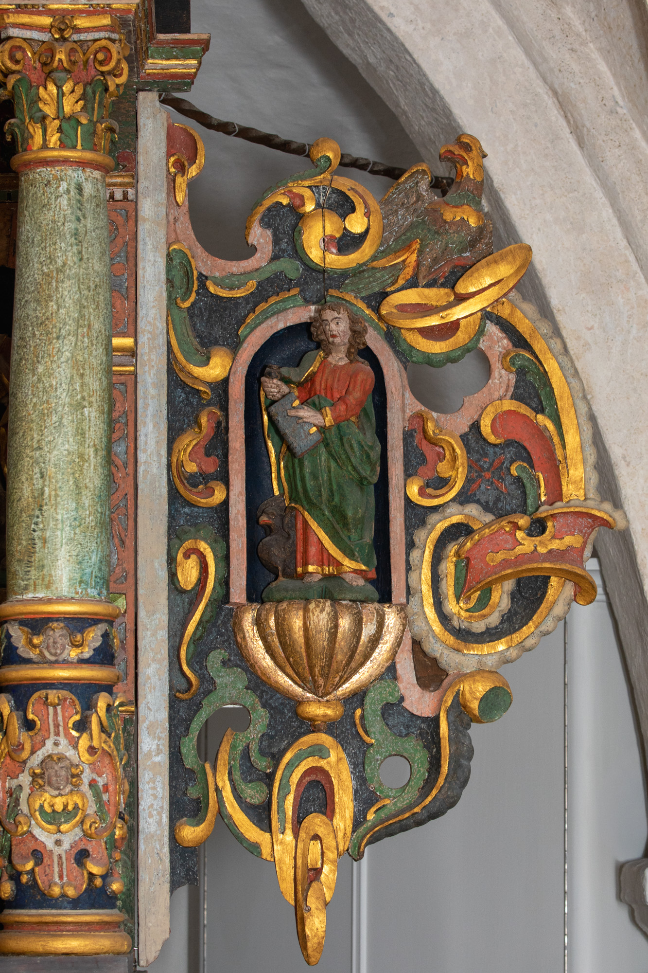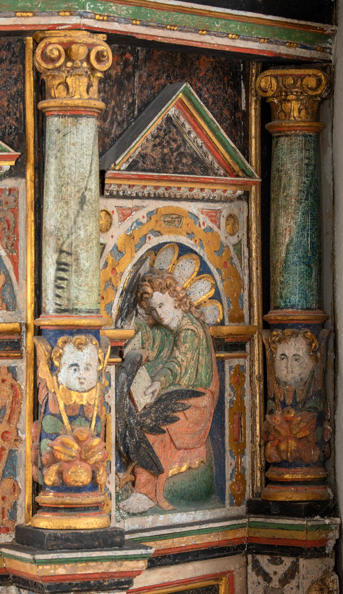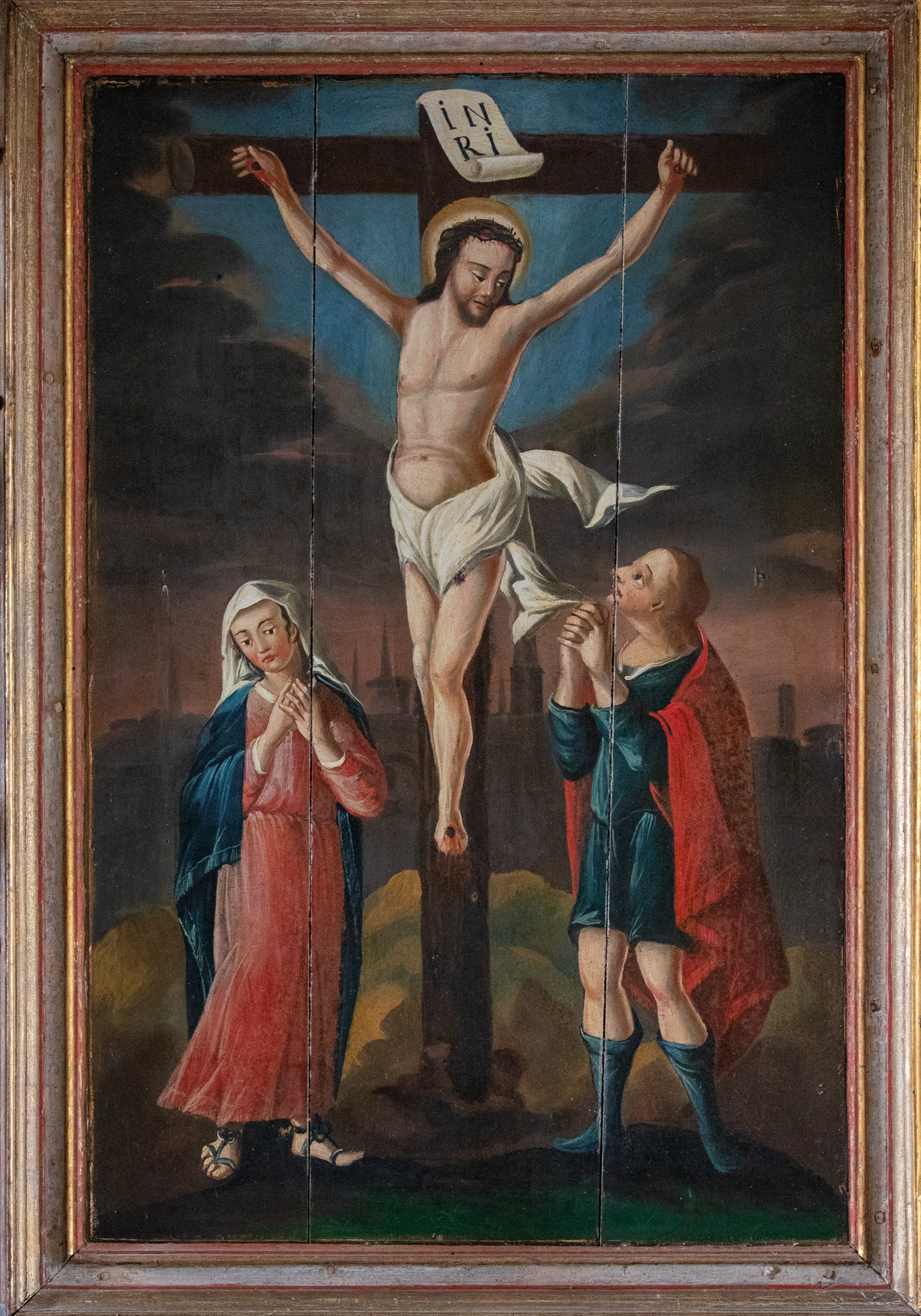 Alterbilledet har korsfæstelsen som motiv. Det flankeres af dobbeltsøjler med korintiske kapitæler, glatte søjler og prydbælter. Vingerne har bruskværk og figurer, der fremstiller Lukas og Johannes. De to andre evangelister kan skimtes mellem søjlerne.