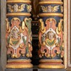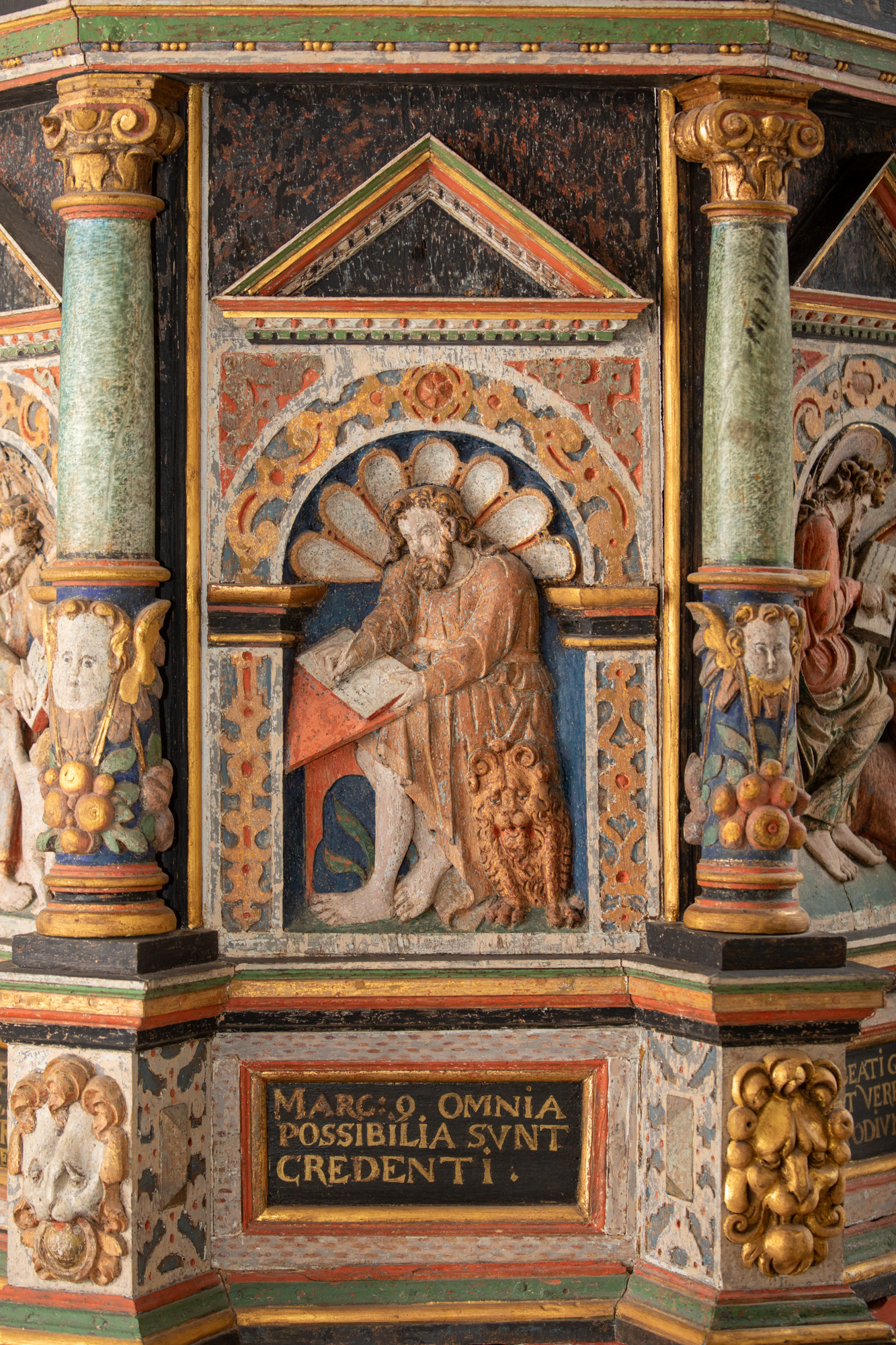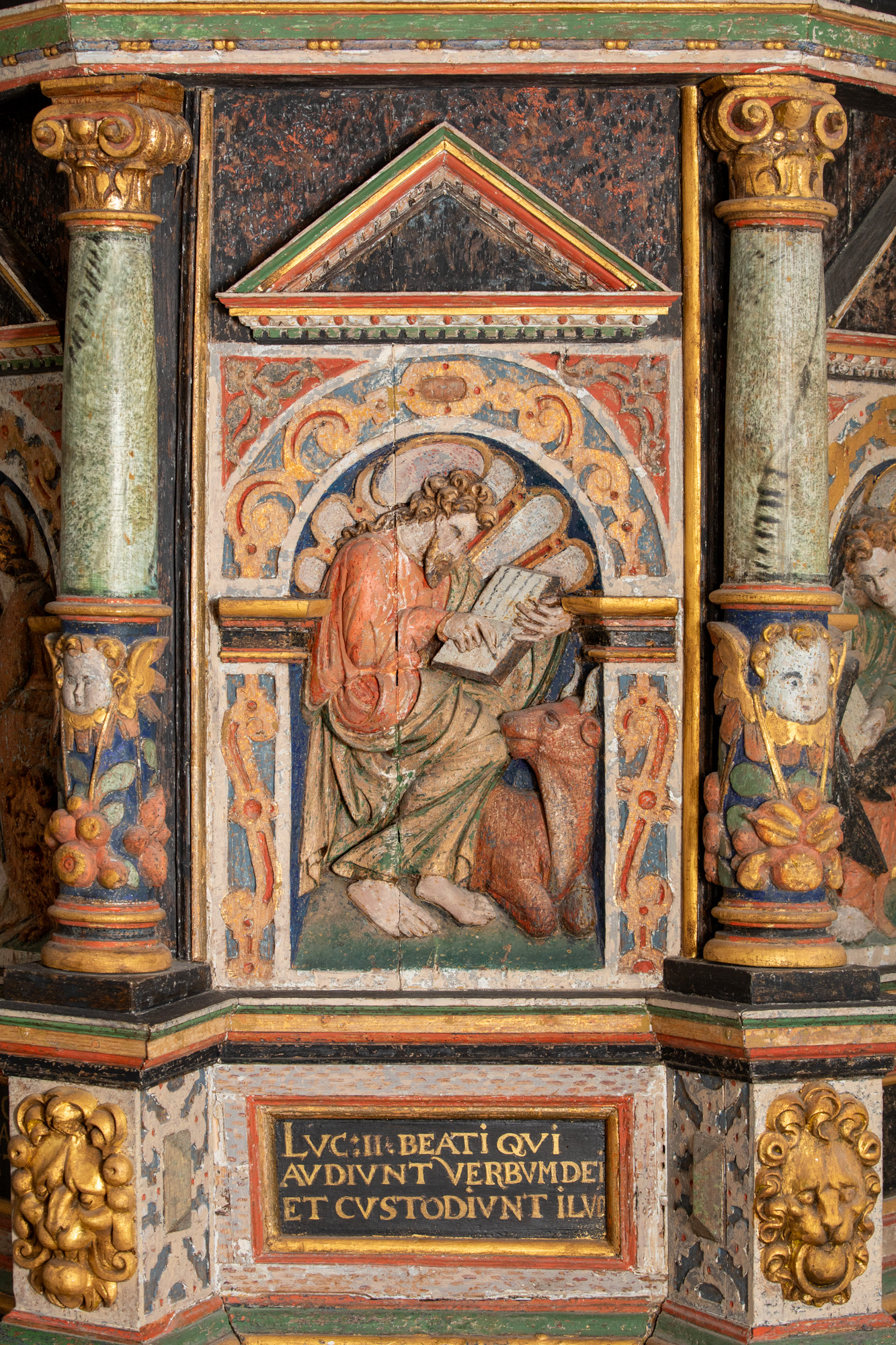 I de nederste smalfelter står et skriftsted svarende til evangelisten ovenover: