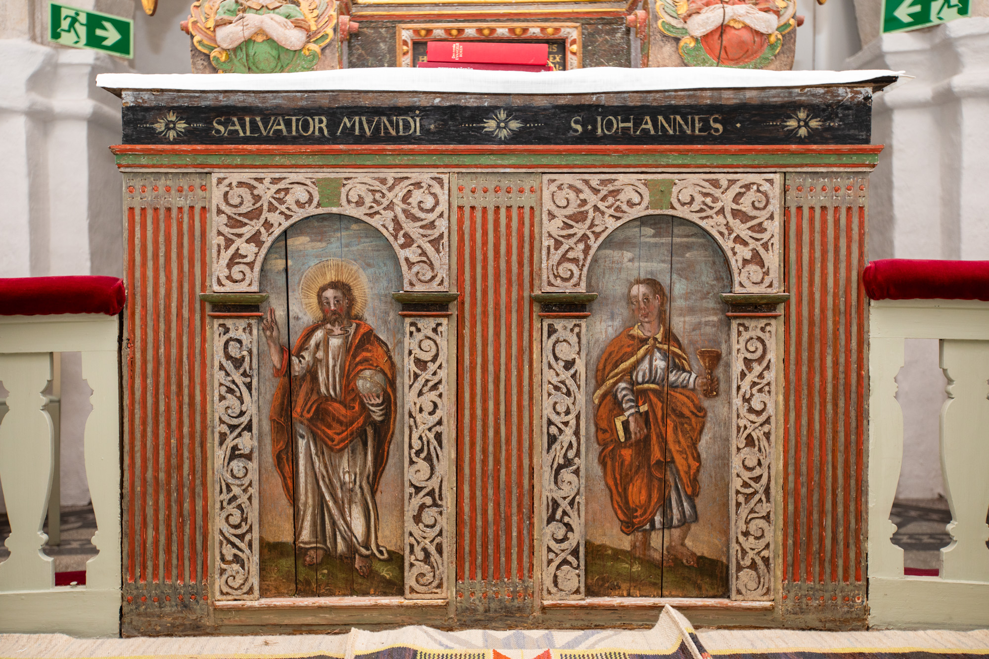 Antemensalet af træ er fra 1600-tallet. I rigt udskårne rundbuer står Kristus, Salvator Mundi, og apostle. Rundbuefelterne adskilles af riflede pilastre. Billederne skal være nymalet i 1761.