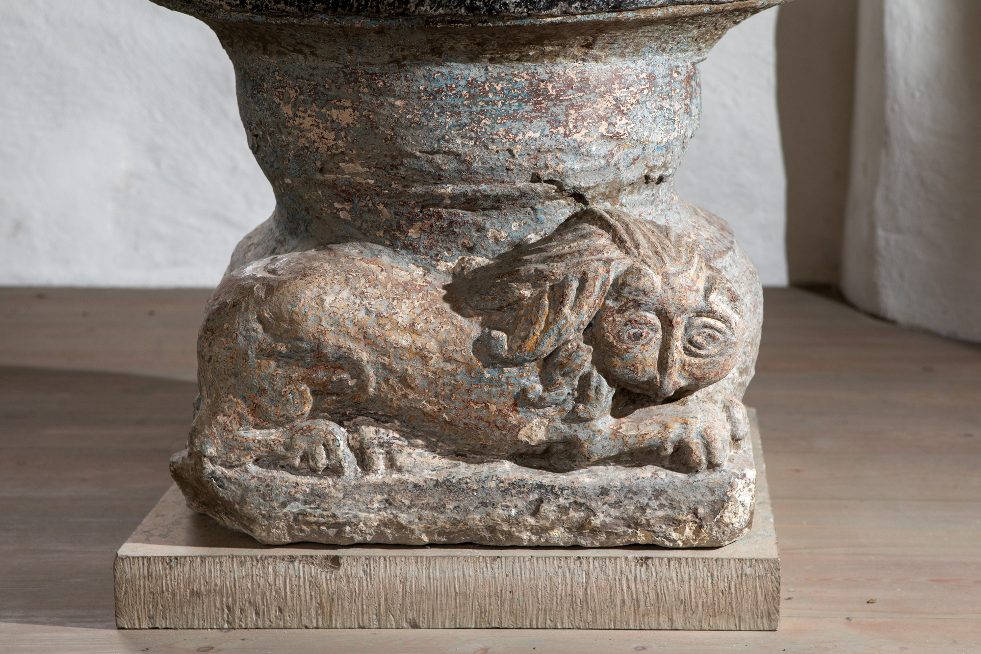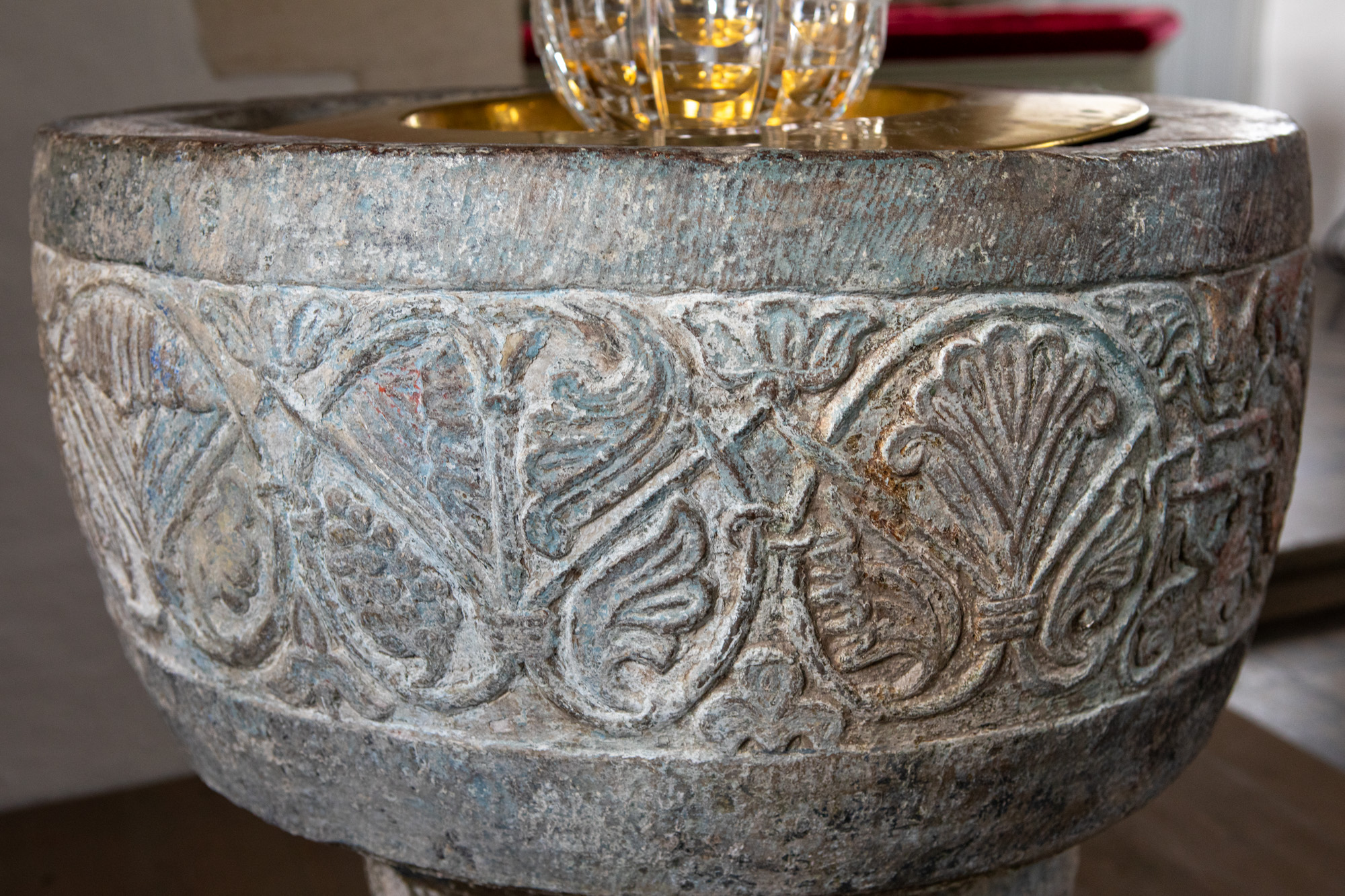 Døbefont af sandsten, som tilhører Hørgruppen. Den har udtømningshul, men ikke fals. Kummen er udsmykket med en palmettefrise, der indeholder drueklaser. Kummens profil er let bøjet med en svag hulkehle mod bunden. På den ene side af foden er en liggende løve.
