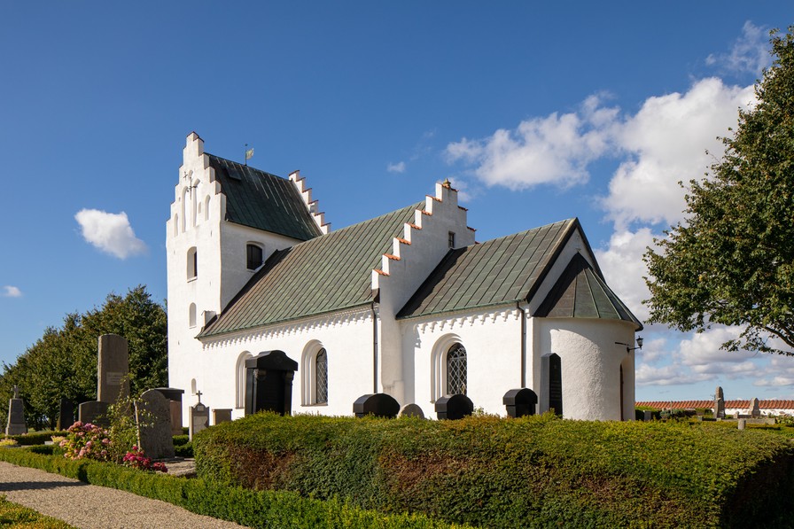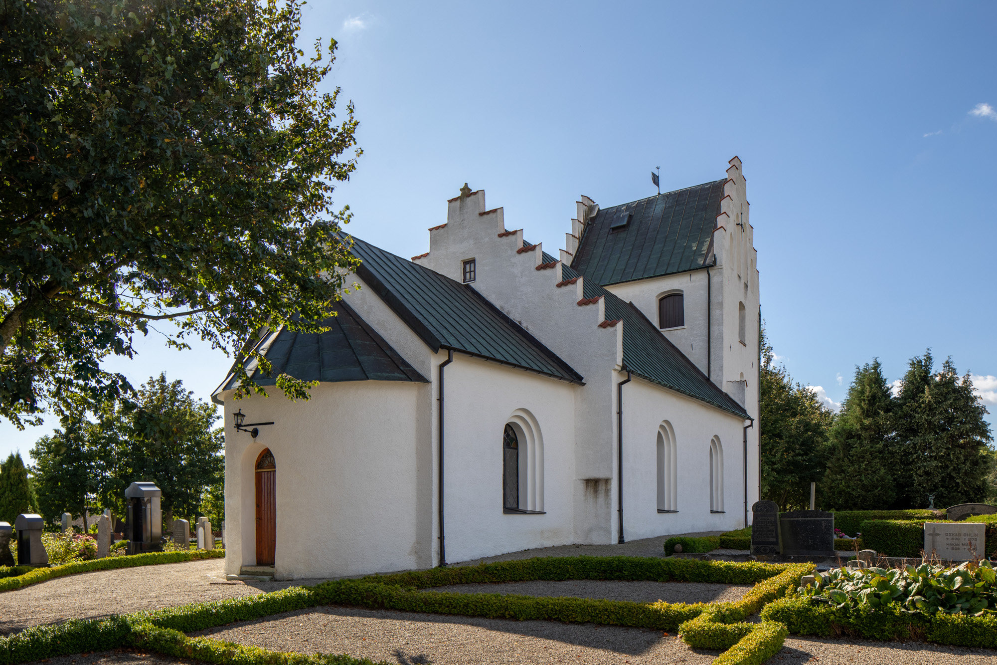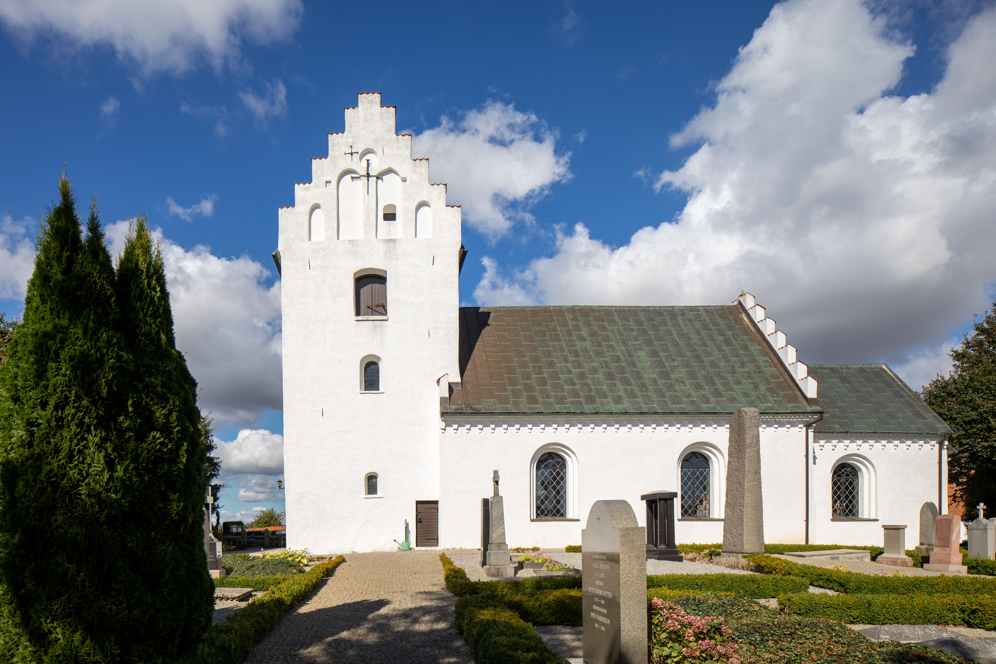 Kirken menes at være opført i anden halvdel af 1100-tallet. Måske er den bygget ovenpå en bronzealdergrav. Dens ældste dele er skib, kor og apsis. 100 år efter opførelsen blev de indvendige vægge pudset, og kirken fik sine første kalkmalerier. I 1300-tallet fik kirken krydshvælv. Nye kalkmalerier blev dog først malet i slutningen af 1400-tallet. Tårn og et nu ikke længere eksterende våbenhus foran syddøren blev opført i senmiddelalderen. Tårnet har kvadratisk grundplan, og gavlene, der vender forkert, er forsynet med kamtakker og blændinger. 1834 blev syddøren muret til, da man flyttede indgangen til tårnets vestfacade. I den forbindelse blev våbenhuset fjernet. Nyt kobbertag blev lagt 1988. Skib og kor har på sydsiden en rundbuefrise og en tandsnitfrise, som er tilkommet senere. På korets østgavl over apsis sidder et ansigt med hjælm.