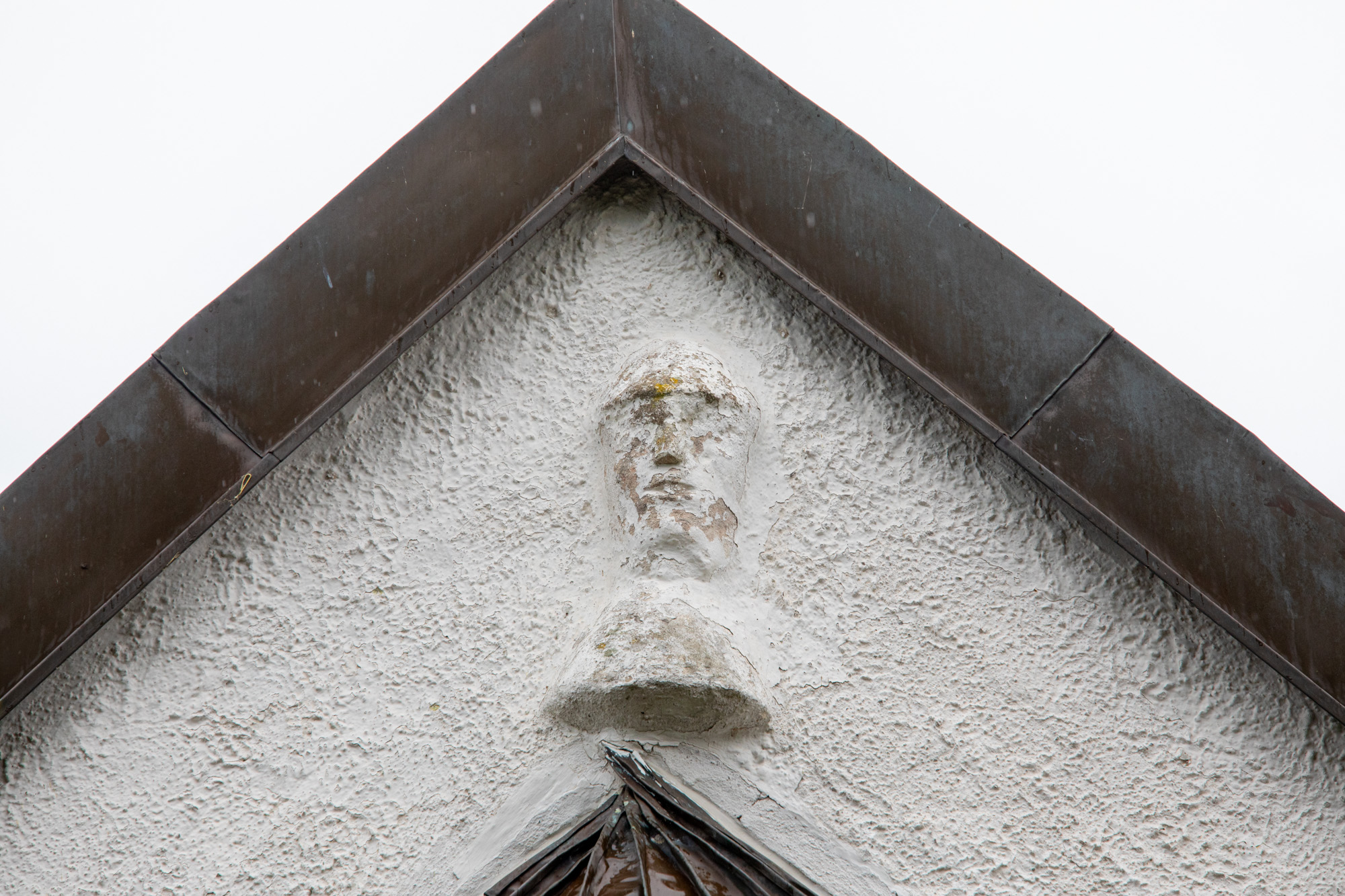 Søjlerne står på postamenter med en kraftig engel med korslagte arme. Mellem postamenterne er et enkelt tekstfelt med følgende tekst: