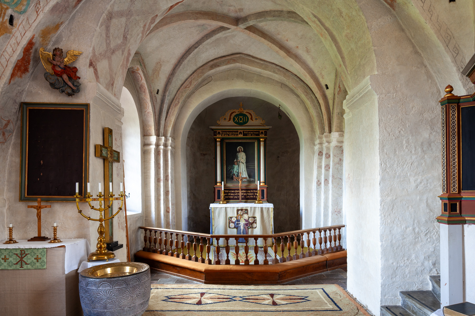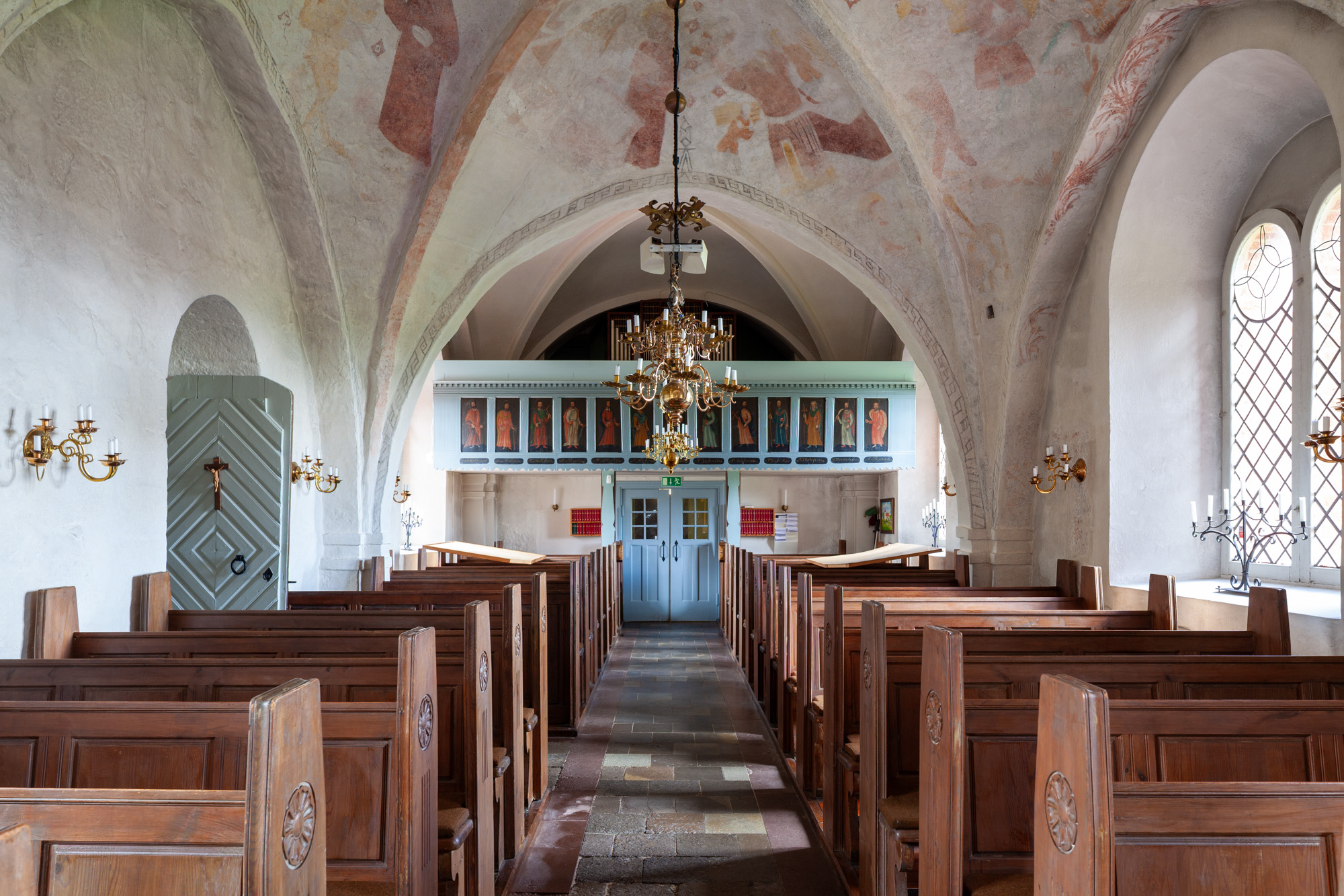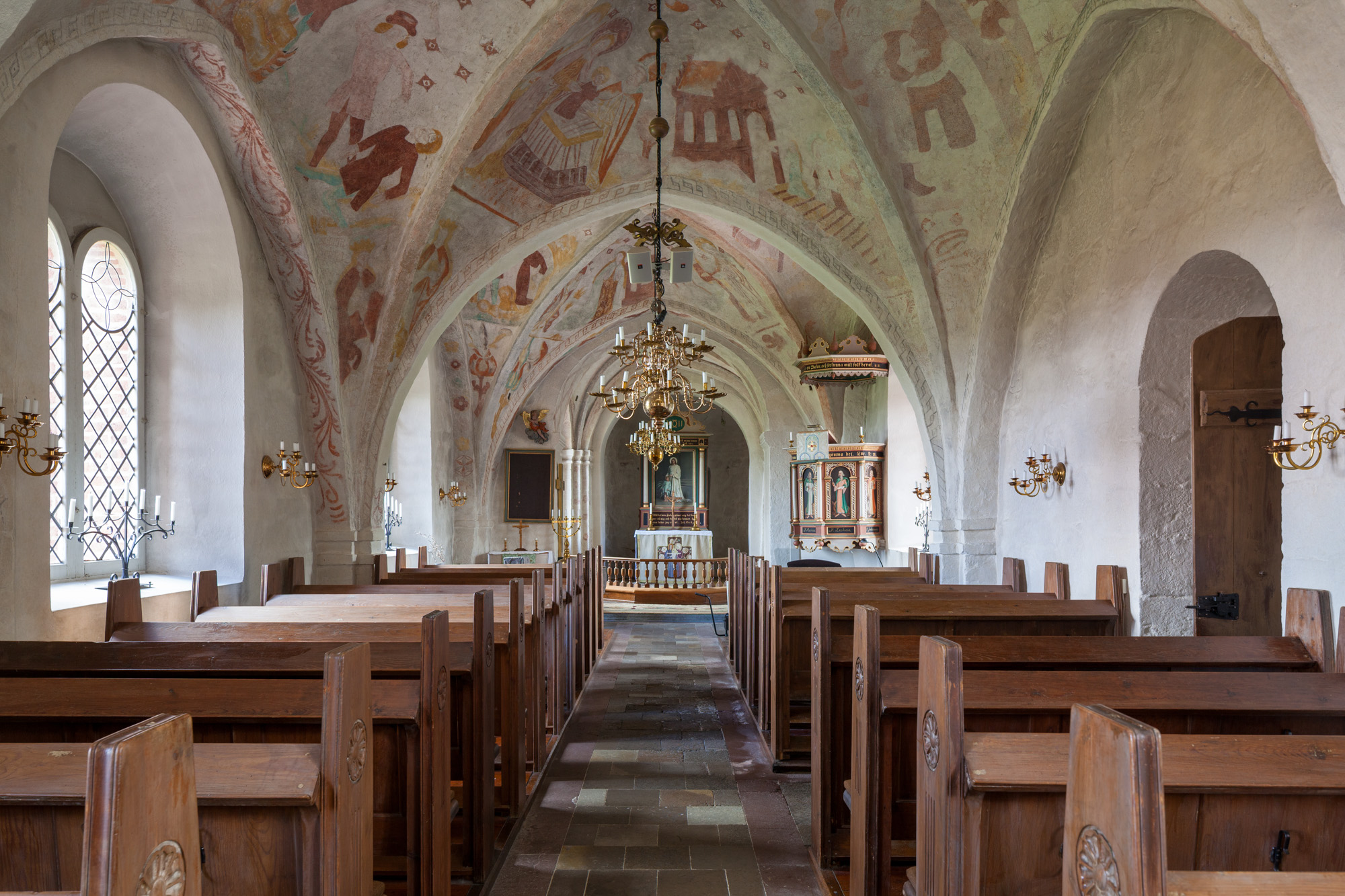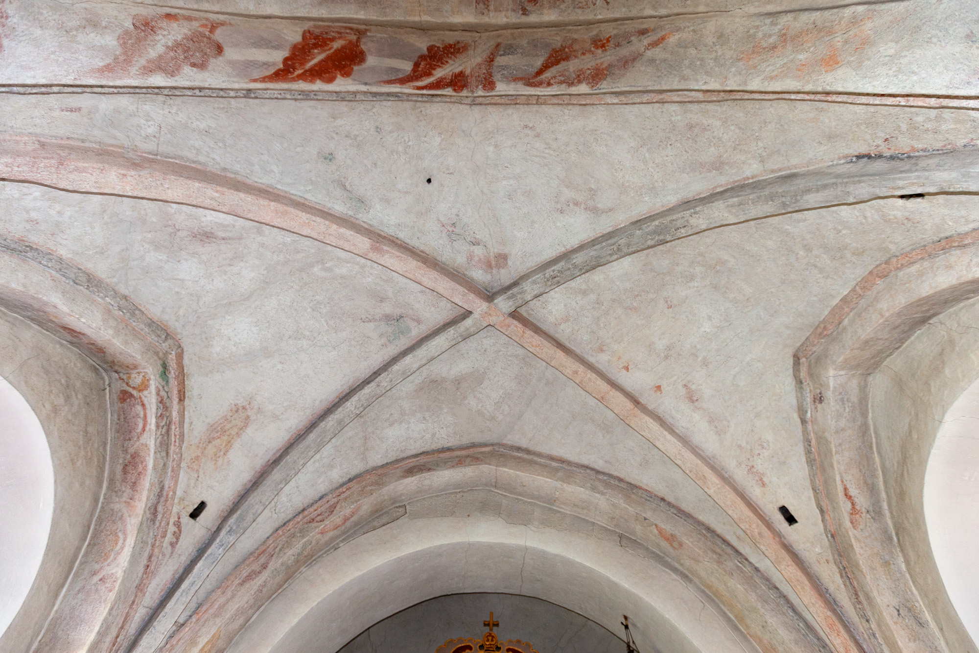 I skibet er der derimod en fuld udmaling af alle kapper i to hvælv.