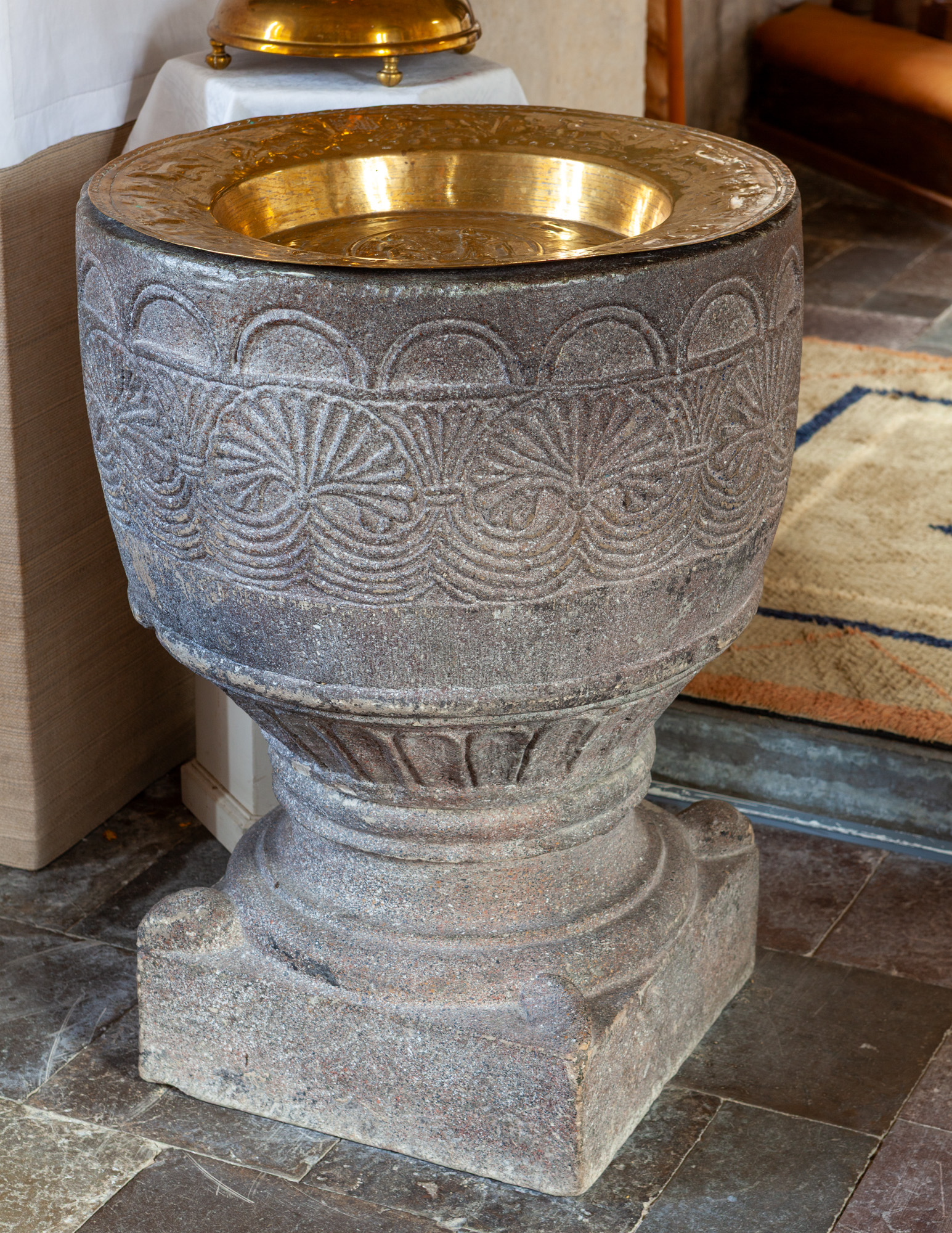Døbefont af sandsten med udtømningshul, men ingen fals. Over en palmettebort ses en række rundbuer. Kummen afsluttes forneden af en rundstav og smalle bægerblade på bunden. Skaftet er kort og rundt med hulkehl og står på en firkantet høj plade med dyrehoveder som hjørneknopper.
