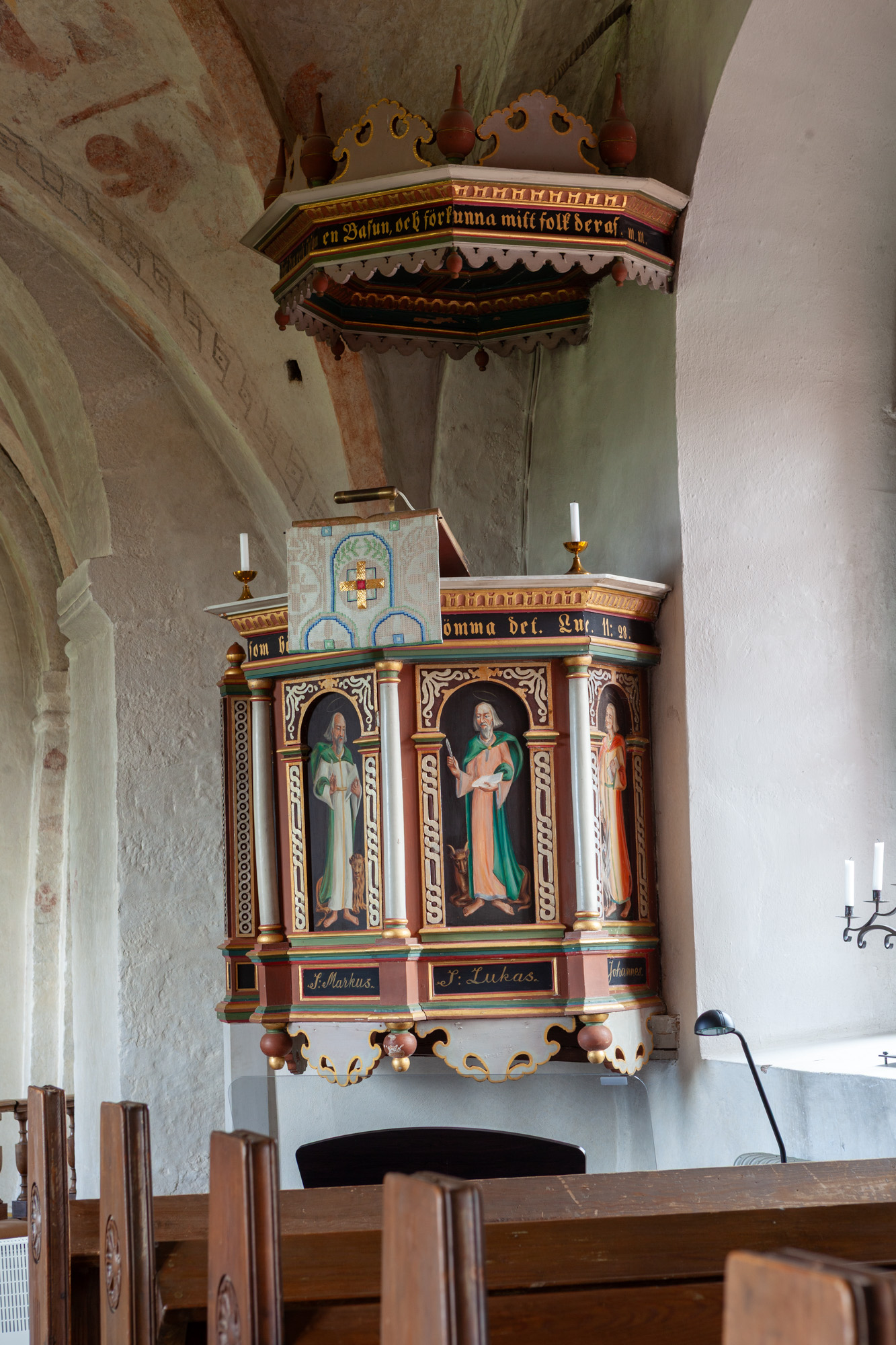 Prædikestolen er fra 1700. Billederne af evangelisterne er udført af Osvald Owald 1937.