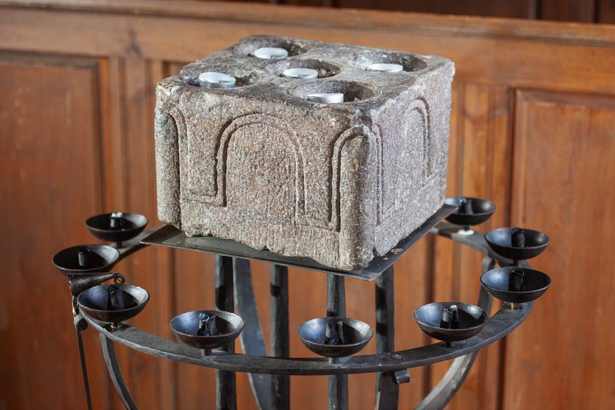 En middelalderlig olielampe, luminarium, er tildannet af en firkantet sandstensblok med skålformede fordybninger på oversiden. Fordybningerne blev fyldt med tran, og der blev tændt en væge.
