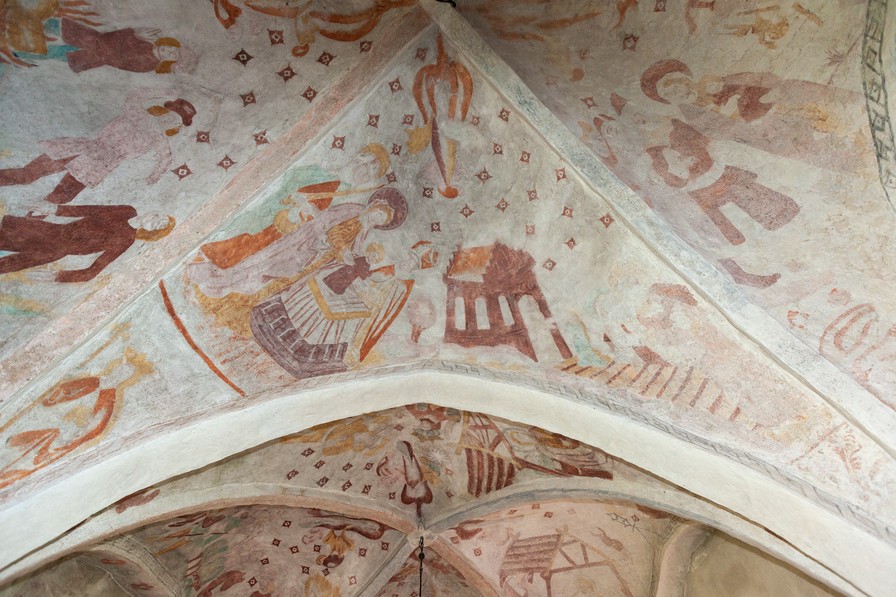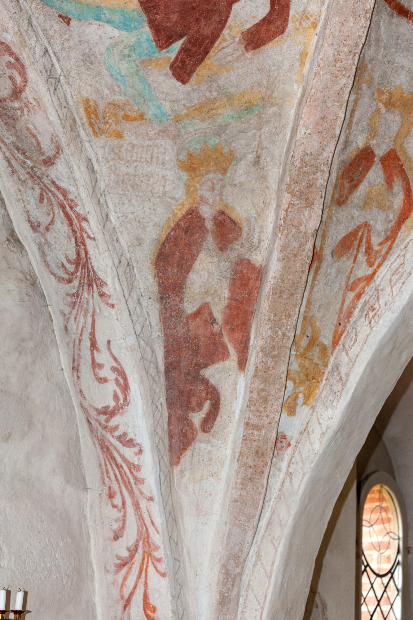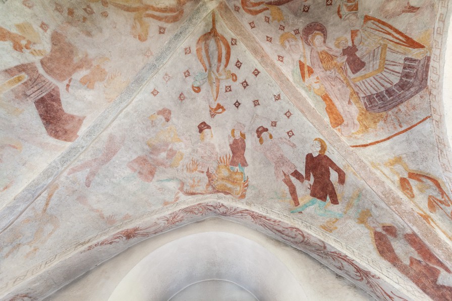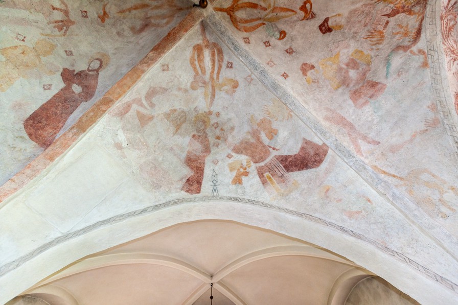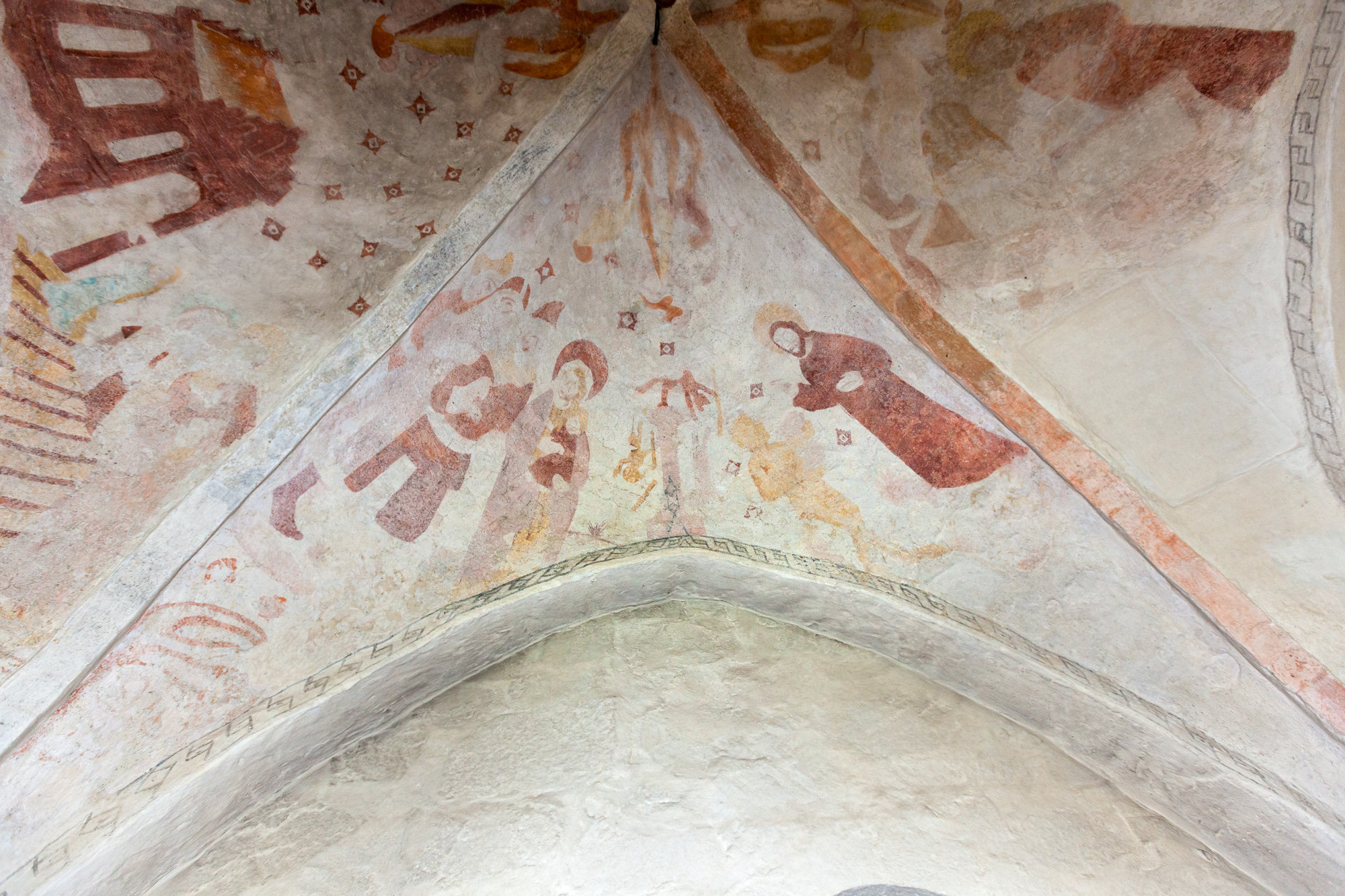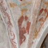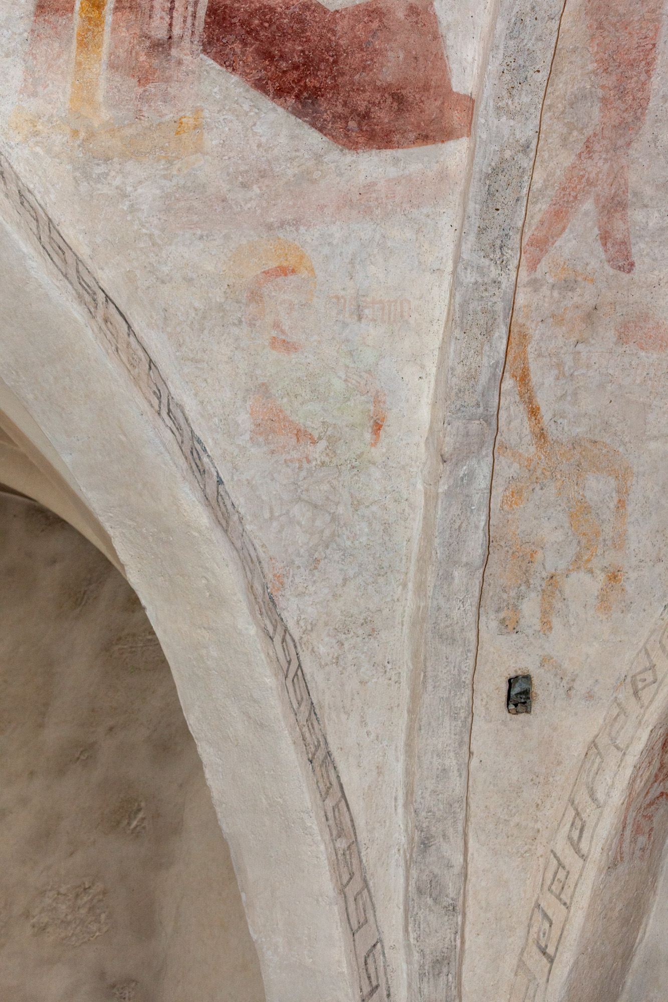 I kor og apsis (billedet herover) er billederne helt udviskede. I apsis er der farvespor, som kan være Treenigheden samt en apostelrække. I de fire hvælvkapper kan motiverne ikke identificeres.
