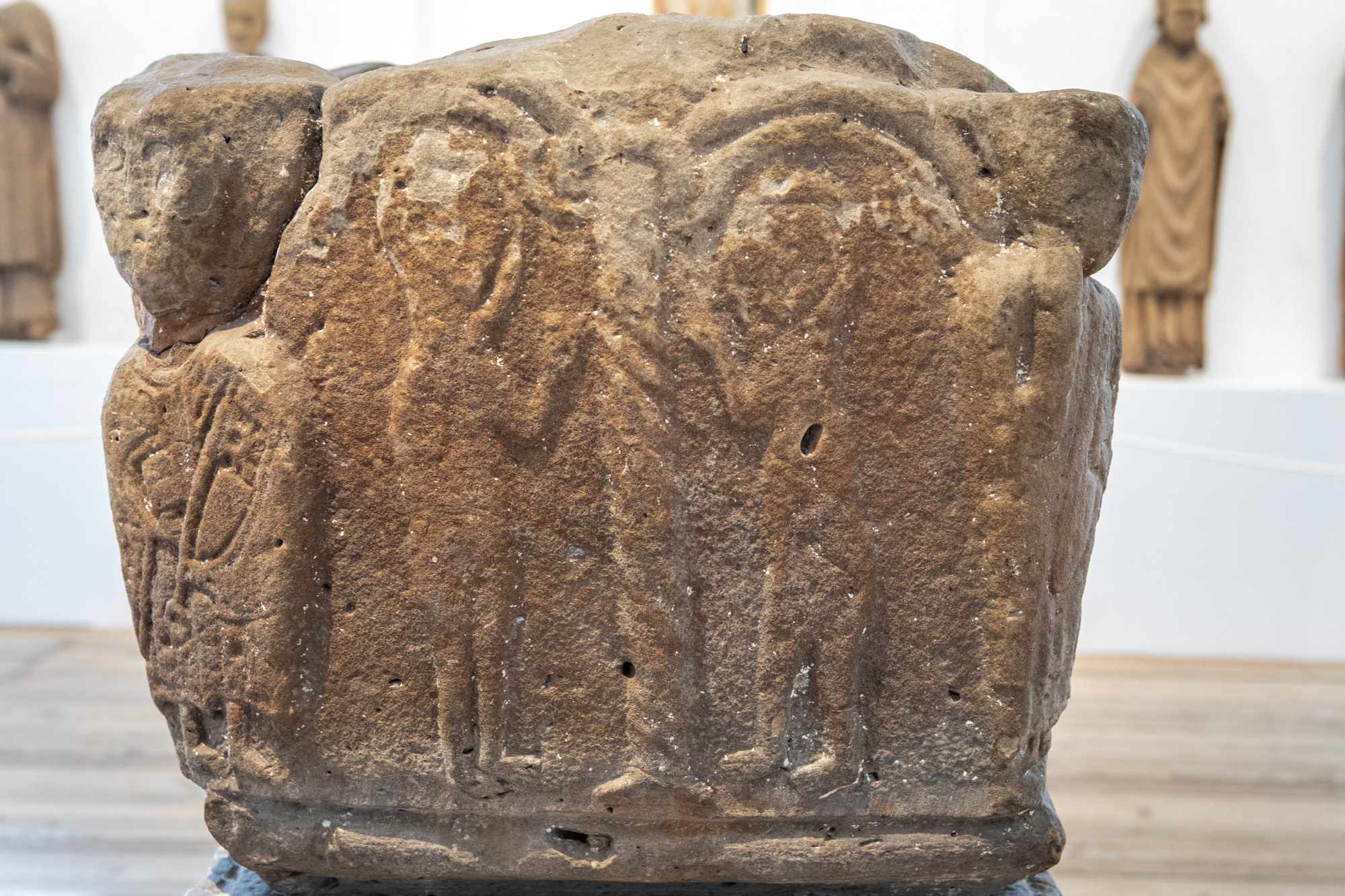 Motiv fra Jesu lidelse. Jesus – til højre – står med begge hænder på en snoet søjle. Til venstre står en bøddel og svinger pisken. Ved foden af søjlen udgår to akantusblade, og sviklen mellem buerne er også udfyldt af et akantusblad. Buerne udgøres yderst af tovstave indvendigt af et blad.
